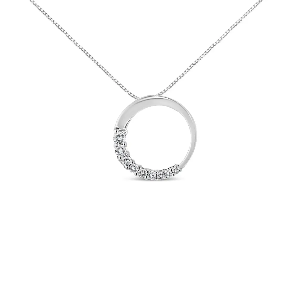 From a box chain an open circle pendant delicately dangles. Crafted in 14k white gold, this exquisite pendant showcases 1/4ct TDW of diamonds. Glittering round cut diamonds graduating in size sparkle on half of the open circle design. The necklace secures with a spring ring clasp. This pendant is the perfect accessory for any outfit, and will add a touch of sparkle to your overall look.