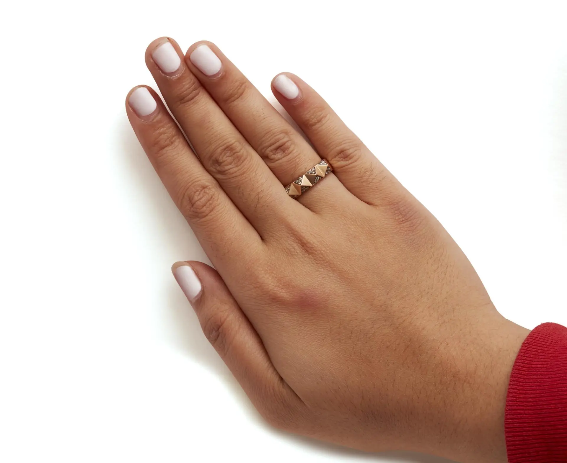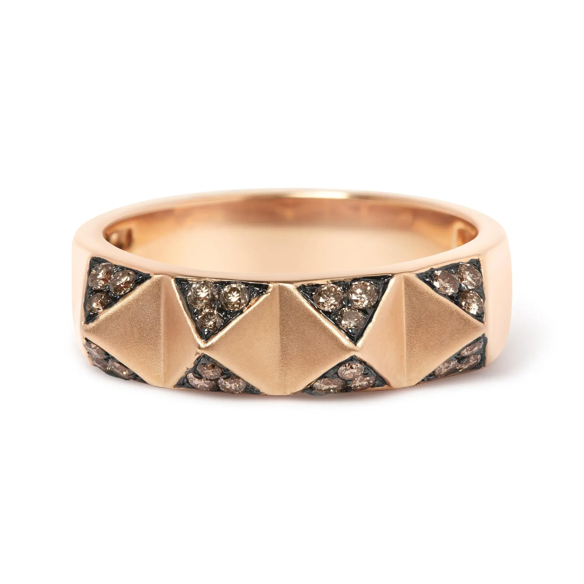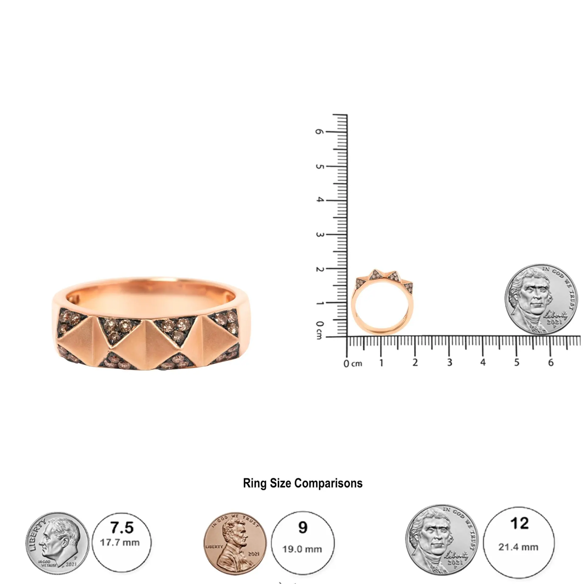 Immerse yourself in the elegance of this exquisite ring, masterfully crafted from lustrantine 14K rose gold. Its unique pyramid band design, embedded with natural brown diamonds of SI1-SI2 clarity, celebrates classical craftsmanship while embracing modern stylistic notes. Each pyramid segment glitters with the subtle charm of brown diamonds, totaling a quarter carat, catching the light with every movement and whispering stories of mystique and allure. This piece isn’t just jewelry; it’s a testament to sophisticated taste and an ode to those who revel in the art of fine details. Its polished finish further amplifies its majesty, ensuring that it not only adorns your finger but also enhances your every gesture with a touch of grandeur.