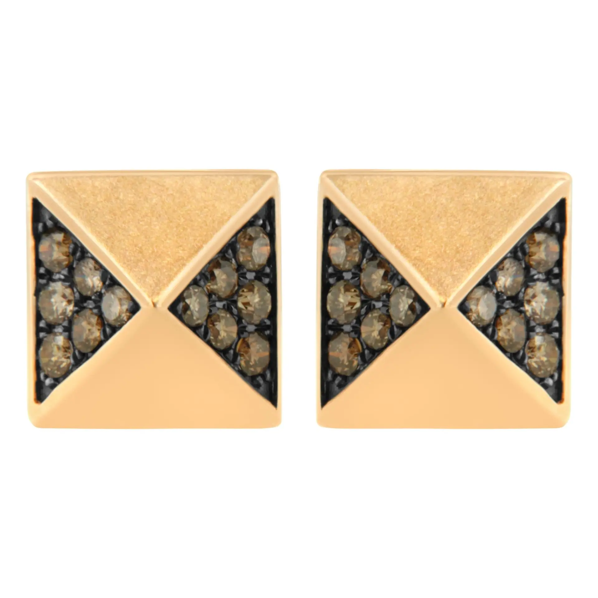 Immerse yourself in the subtle opulence of these 14K rose gold earrings, masterfully crafted into a mesmerizing pyramid stud design. Each earring’s surface is a harmonious blend of rich brilliance and refined simplicity, divided into a quartet of triangular facets. Two triangles glimmer intensely with natural brown diamonds, their deep hues enhanced by an innovative pave setting beneath prongs of brown rhodium-plated brilliance, encapsulating a total weight of 1/4 carat. The remaining facets boast a smooth, mirror-like finish, reflecting sophistication and grace. This unique amalgamation not only intensifies the lustrous charm but also ensures that these jewels stand out as a testament to exquisite craftsmanship. The secure push-back mechanism provides comfort and ease, making these earrings a flawless choice for both everyday elegance and special occasions. Embrace these treasures for their beauty, revel in their luxury, and let them add a touch of enigmatic allure to every ensemble.