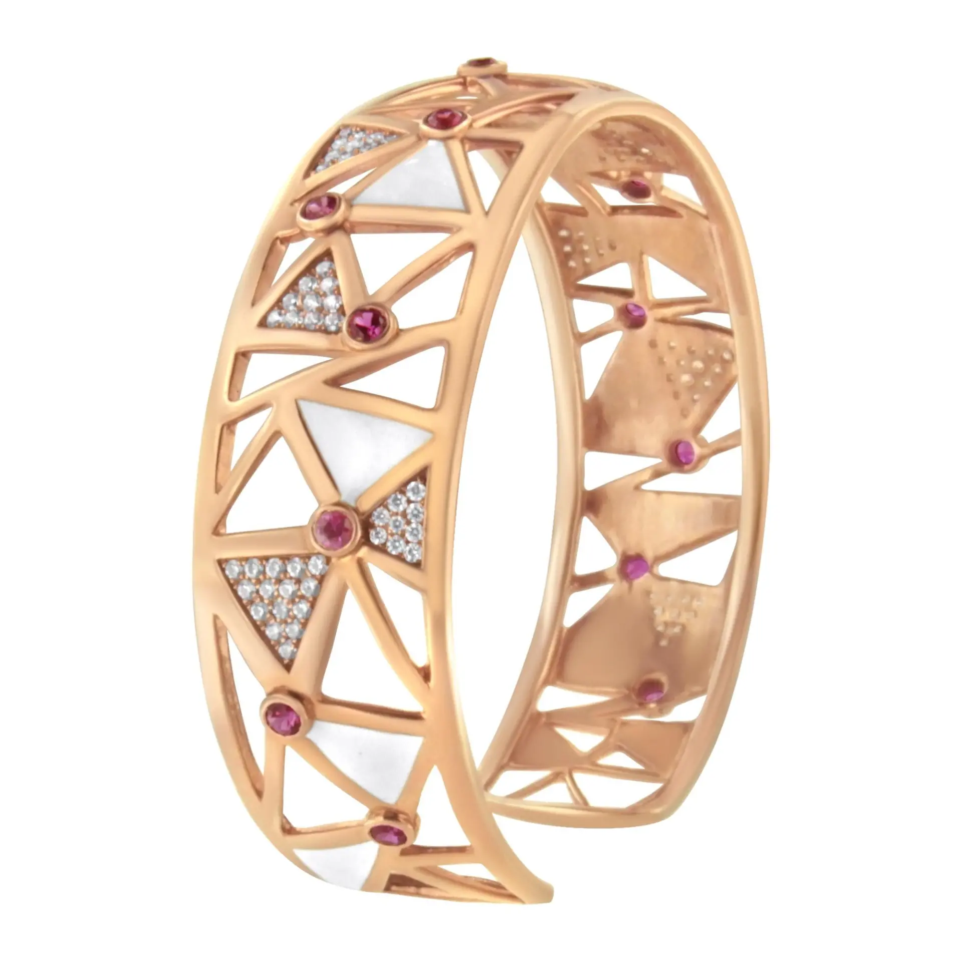 Wrapped with the opulence of 14K rose gold and studded with luminous white diamonds totaling 5/8 carats with a clarity of SI1-SI2 and G-H color, this 7-inch open cuff bangle is a masterpiece of design and distinction. The bangle dazzles with its unique pattern of elegantly open spaces and refined sections of pristine white enamel, creating a magnificent canvas that captures the eye and the imagination. Adorned with four radiant, lab-created pink tourmalines, color-treated to enhance their vivid hues, this accessory promises not only to adorn the wrist but also to captivate the beholder’s heart. Each gemstone and diamond set upon this exquisite piece speaks of geometric sophistication and the promise of luxury, making it an essential treasure for those with a penchant for graceful style and timeless elegance.