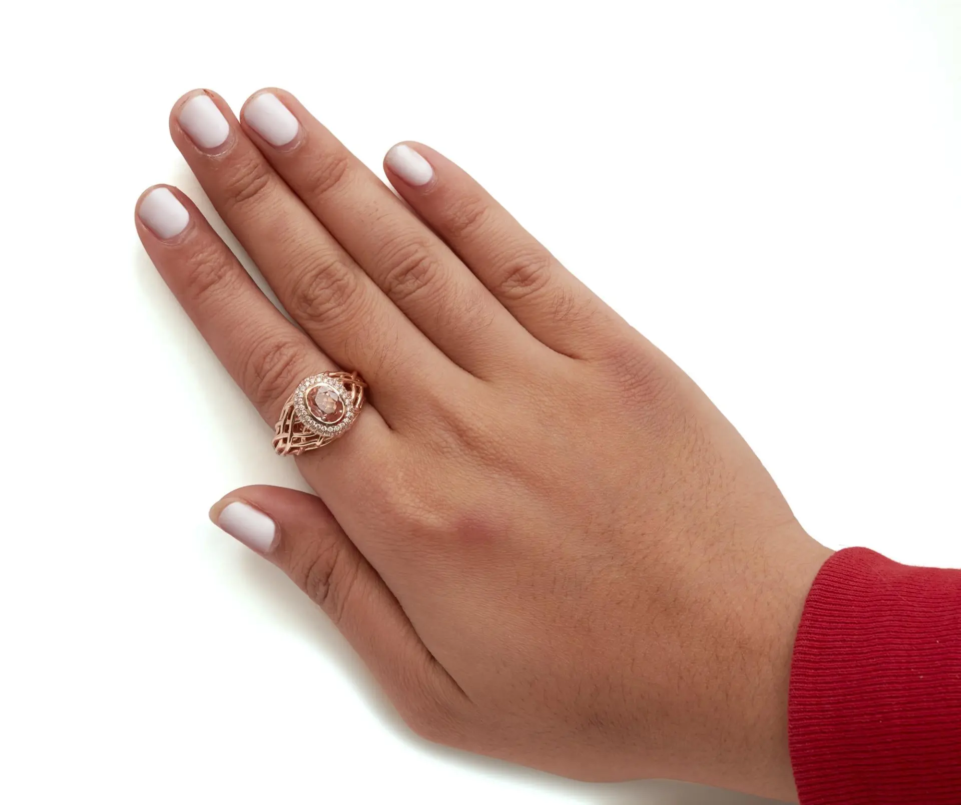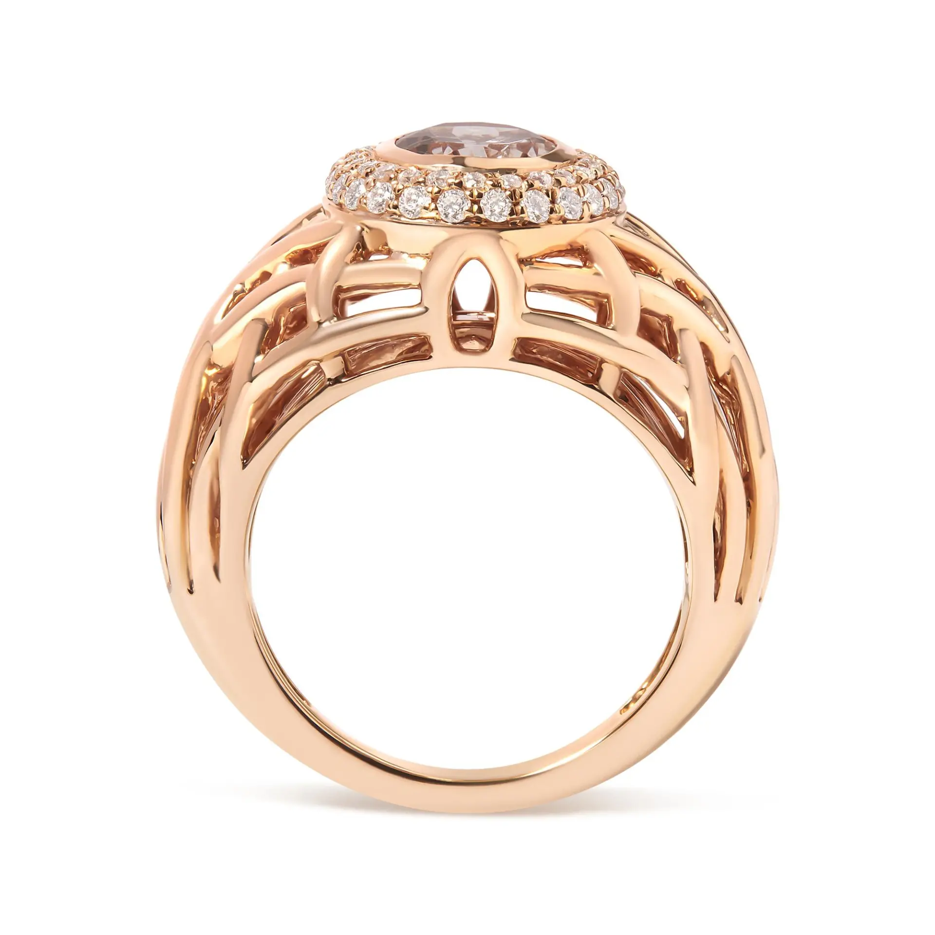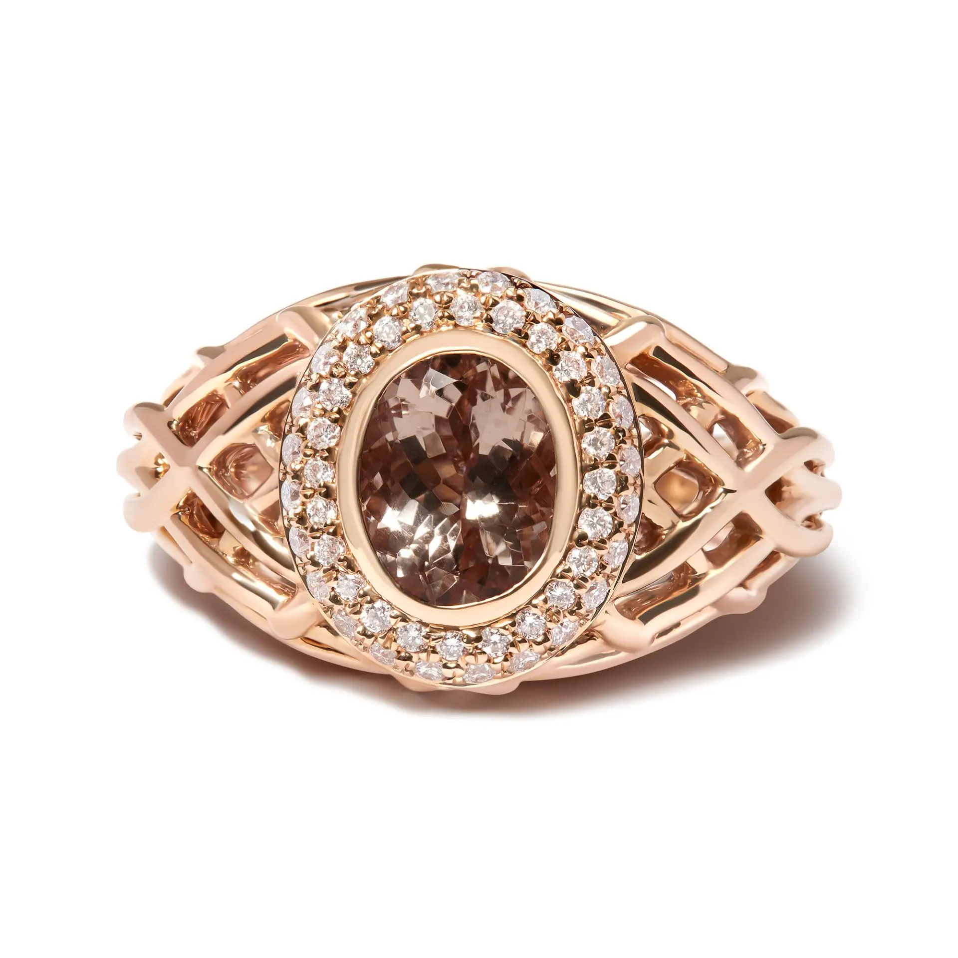 Indulge in the sophisticated allure of this 14K rose gold cocktail ring, where the gentleness of a light pink, oval-cut morganite gemstone beckons the gaze. Measuring a delicate 9×9 mm, this color-treated morganite is meticulously bezel set, emanating a soft, romantic glow. Encircling this central gemstone, a halo of natural white diamonds sparkles intensely, with a total weight of 3/8 carats. These diamonds, boasting a G-H color and SI1-SI2 clarity, are intricately woven into a basket weave pattern, enriching the ring with an enchanting play of light and texture. This size 7 ring marries comfort with grandeur, making it a perfect homage to craftsmanship and style, destined to become a cherished addition to any jewelry collection.