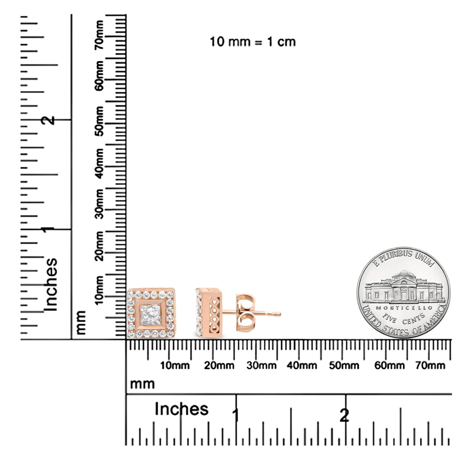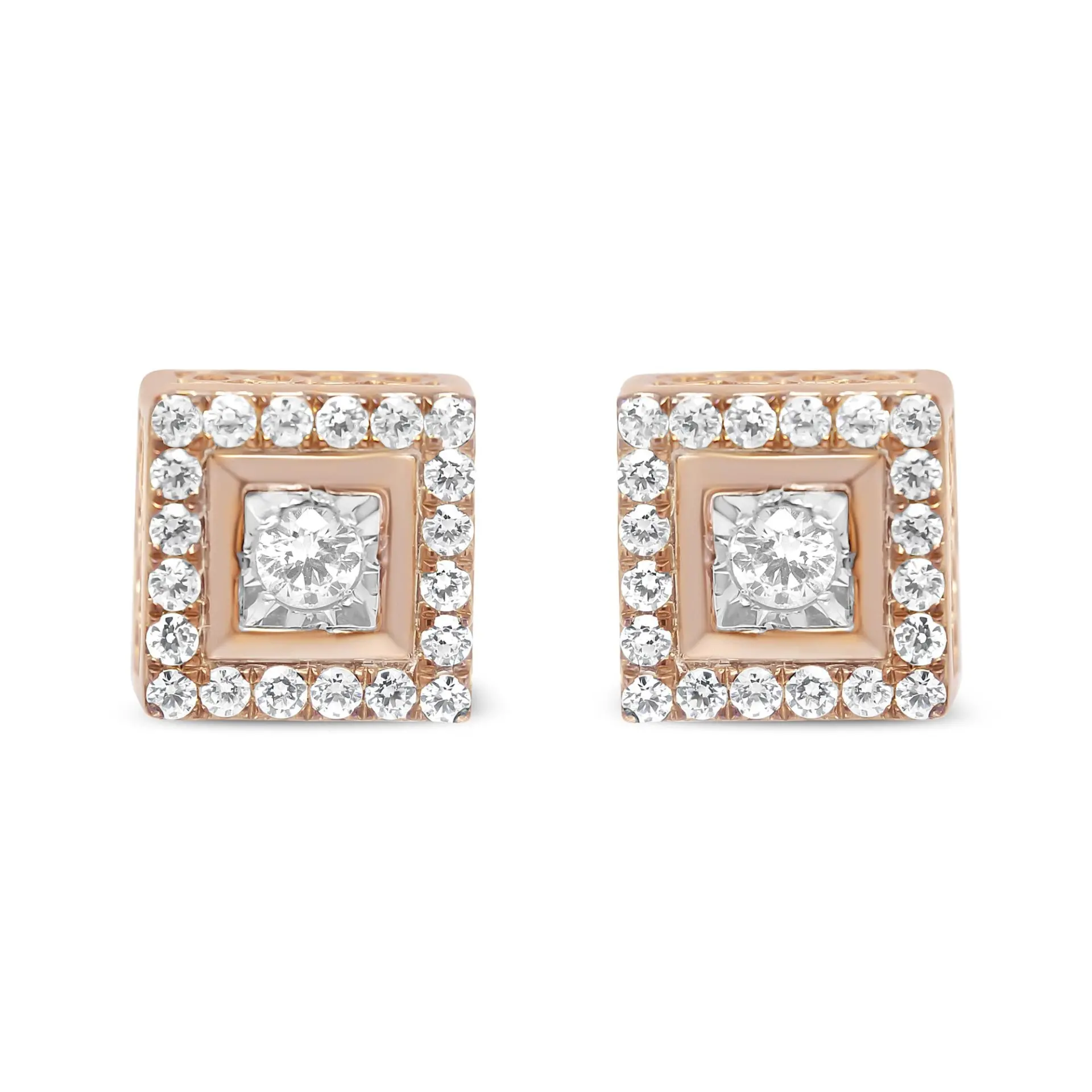 Indulge in the sumptuous elegance of these sterling silver earrings, lovingly plated in 14K rose gold and adorned with a constellation of natural diamonds that collectively weigh a breathtaking 1/2 carat. At the heart of each stud lies a mesmerizing 1/15 ct. diamond, set to captivate and reflect every flicker of light, magnifying its inherent luminescence. Encasing each central jewel is a meticulously crafted square frame, studded with a halo of smaller diamonds that amplify the centerpiece’s splendor, creating an endless dance of light with every turn of your head. These treasures secure gracefully with friction backs, offering not just comfort but the peace of mind that your precious adornments will remain snugly in place. Perfect for elevating everyday wear or adding a touch of glamour to evening ensembles, these earrings promise to be a perennial favorite in your jewelry collection.
