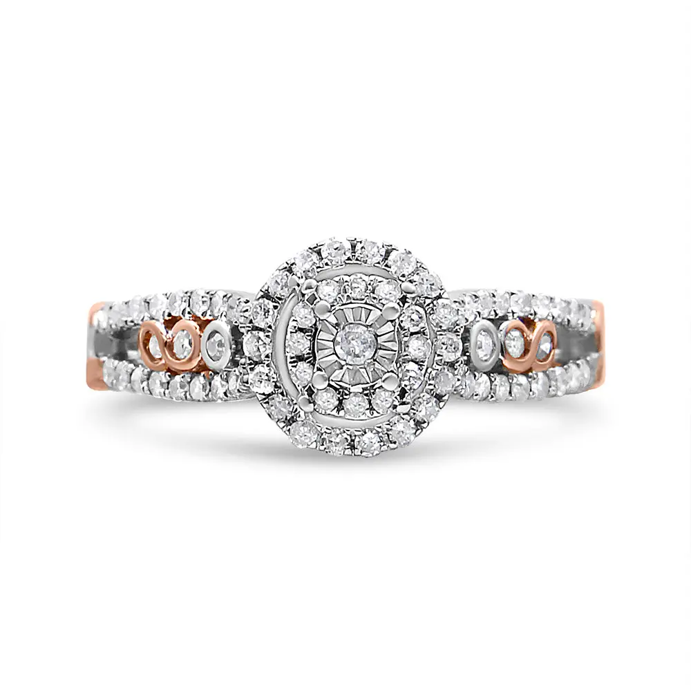 An exquisitely beautiful double frame split shank engagement ring in 14k rose gold plated .925 sterling silver, this piece is an exquisite showpiece of glamorous sparkle. Round frames of prong-set diamonds cluster the center of the ring, flanked by additional prong-set white diamonds along the shank, while the design of the ring portrays an infinity symbol for a deeper meaning to your promise to one another. The two tone color adds depth to this ring that already shines and dazzles with intricate romance that shows off total 3/8 cttw diamonds that are an approximate I-J color and I2-I3 clarity.