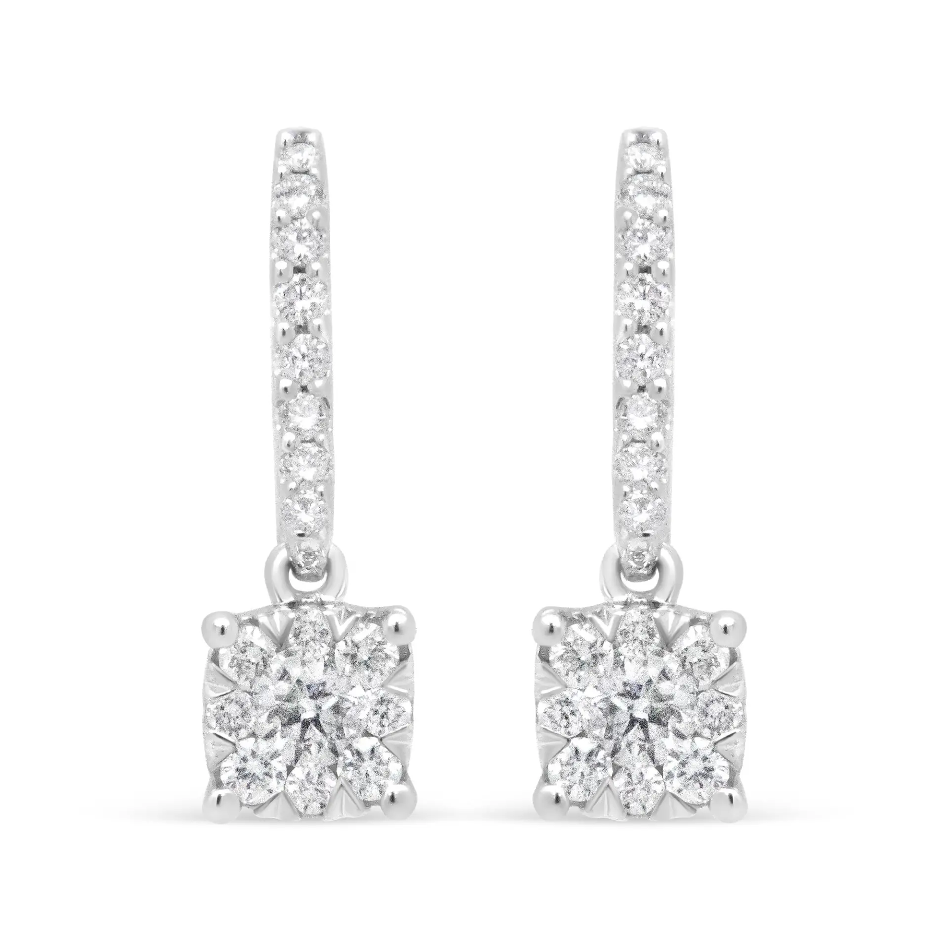 Sparkle is the name of the game for this pair of diamond dangle hook earring. A cascade of round, prong-set diamonds spill downward toward a central white diamond cradled in a pave setting and surrounded by a halo of round, prong-set diamonds. The total 1/2 Cttw diamonds are of an approximate H-I Color and SI2-I1 Clarity. These 14k white gold dangle earrings display an artistic array of sparkle and will complement all of your styles with elegance.