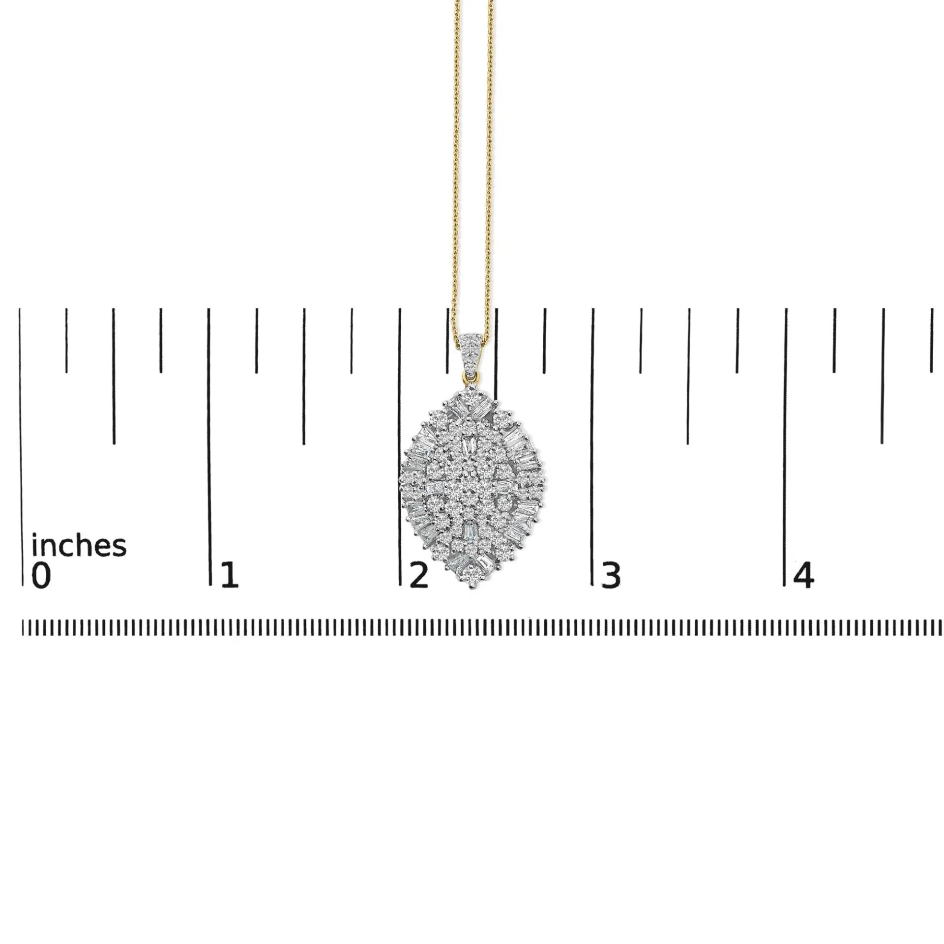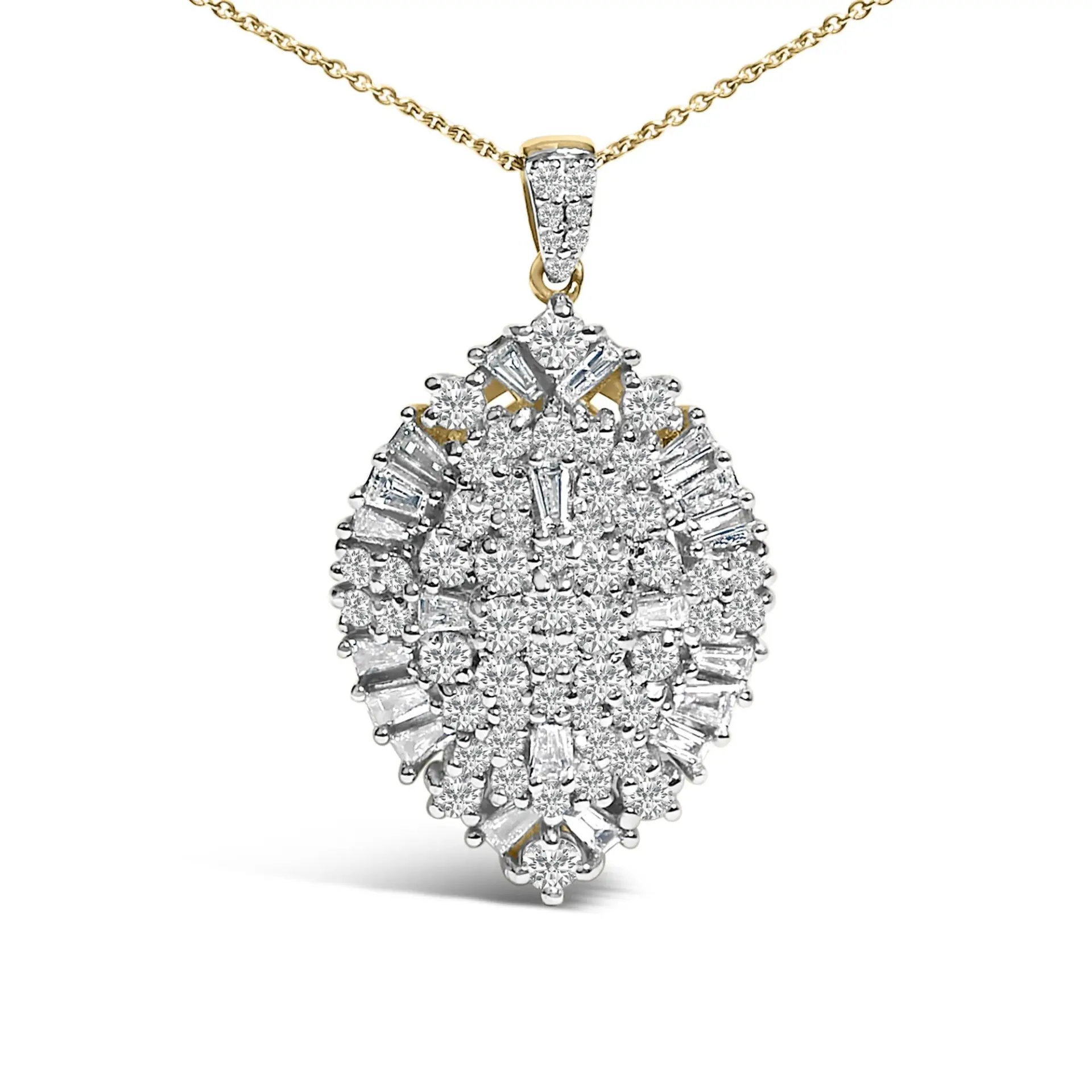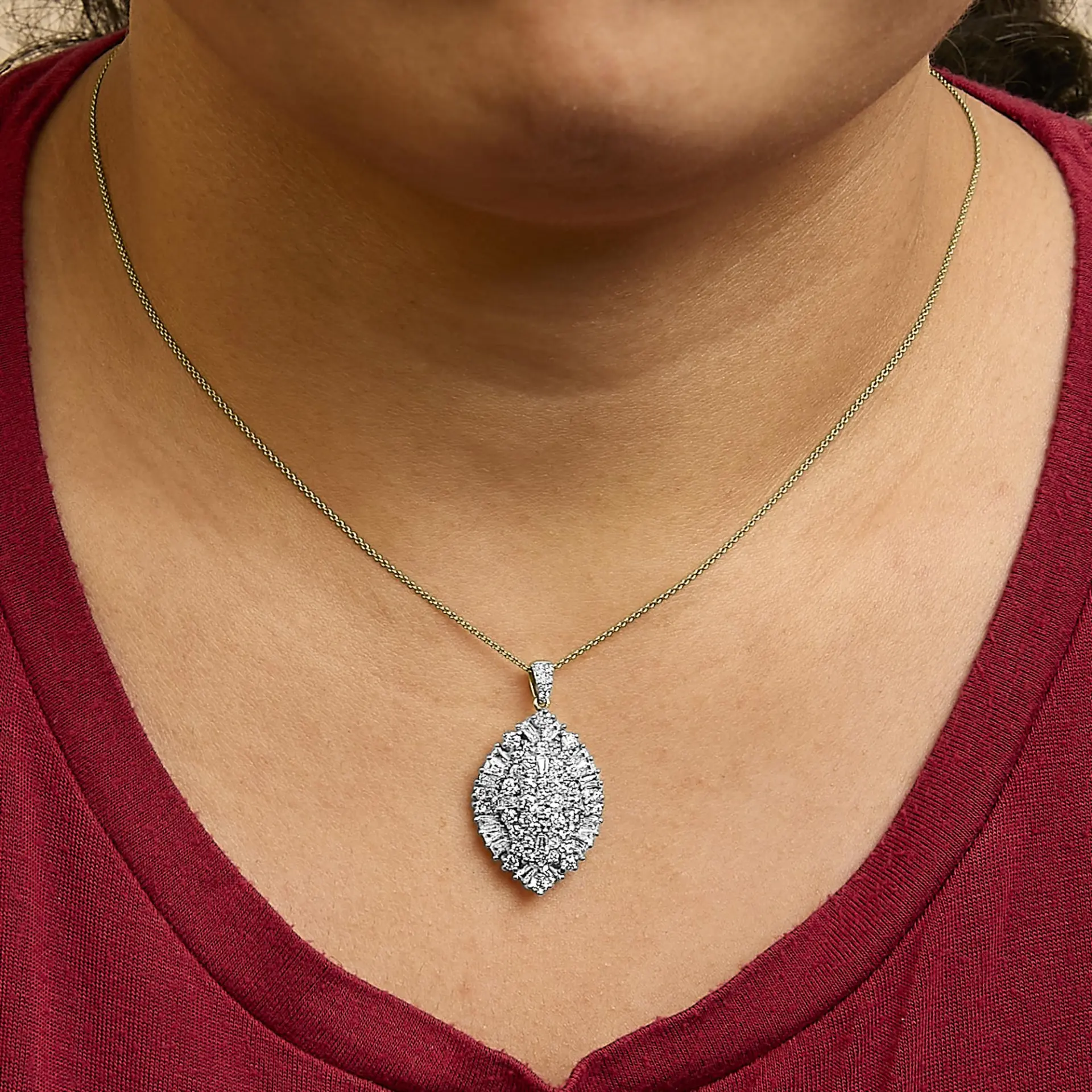 Drape elegance around your neck with this exquisite 14K gold pear-shaped pendant necklace, where sophistication meets sparkle in a mesmerizing dance of light. Crafted with precision, the pendant showcases a lavish cluster of natural diamonds, weighing in at an impressive 2.00 carats. Each diamond, with clarity graded between SI2 and I1 and a color rating of G-H, glimmers with an almost celestial quality. These gems are meticulously arranged in a harmonious blend of baguette and round cuts, maximizing their breathtaking brilliance. Rhodium-plated white gold elements enhance the pendants durability while elevating its lustrous appeal. Suspended on a 20-inch cable chain secured by a dependable lobster claw clasp, this necklace promises not only to adorn your decolletage but to captivate any room with its undeniable glamour and artistry.