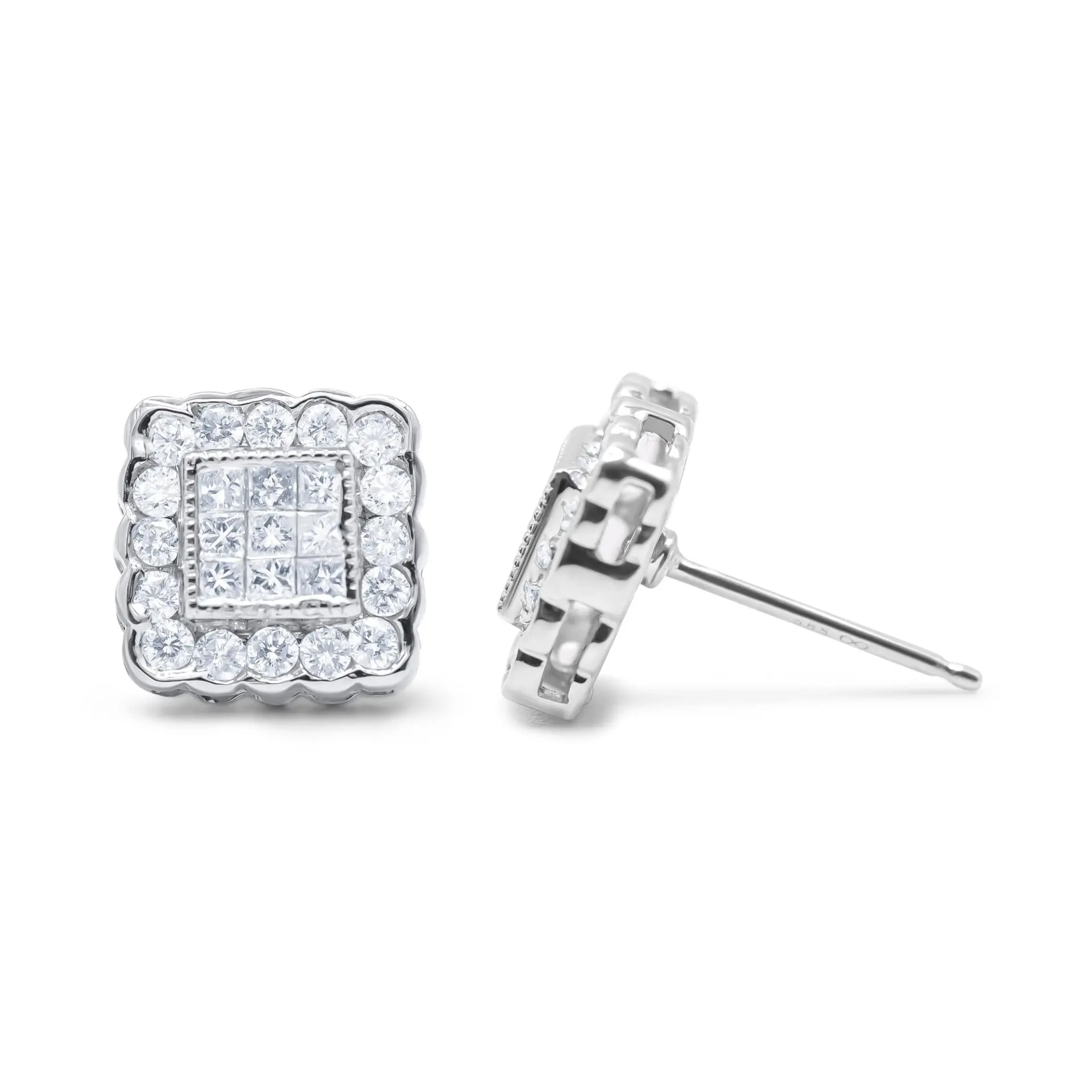 Beautifully crafted of high-quality 14-karat white gold, these stunning square shaped stud earrings hold 1.1 carat of dazzling, round and princess cut diamonds. Polished to a high shine finish, these earrings secure with push-on-screw-off clasp. Wear it up for a casual everyday wear or for any occasion.