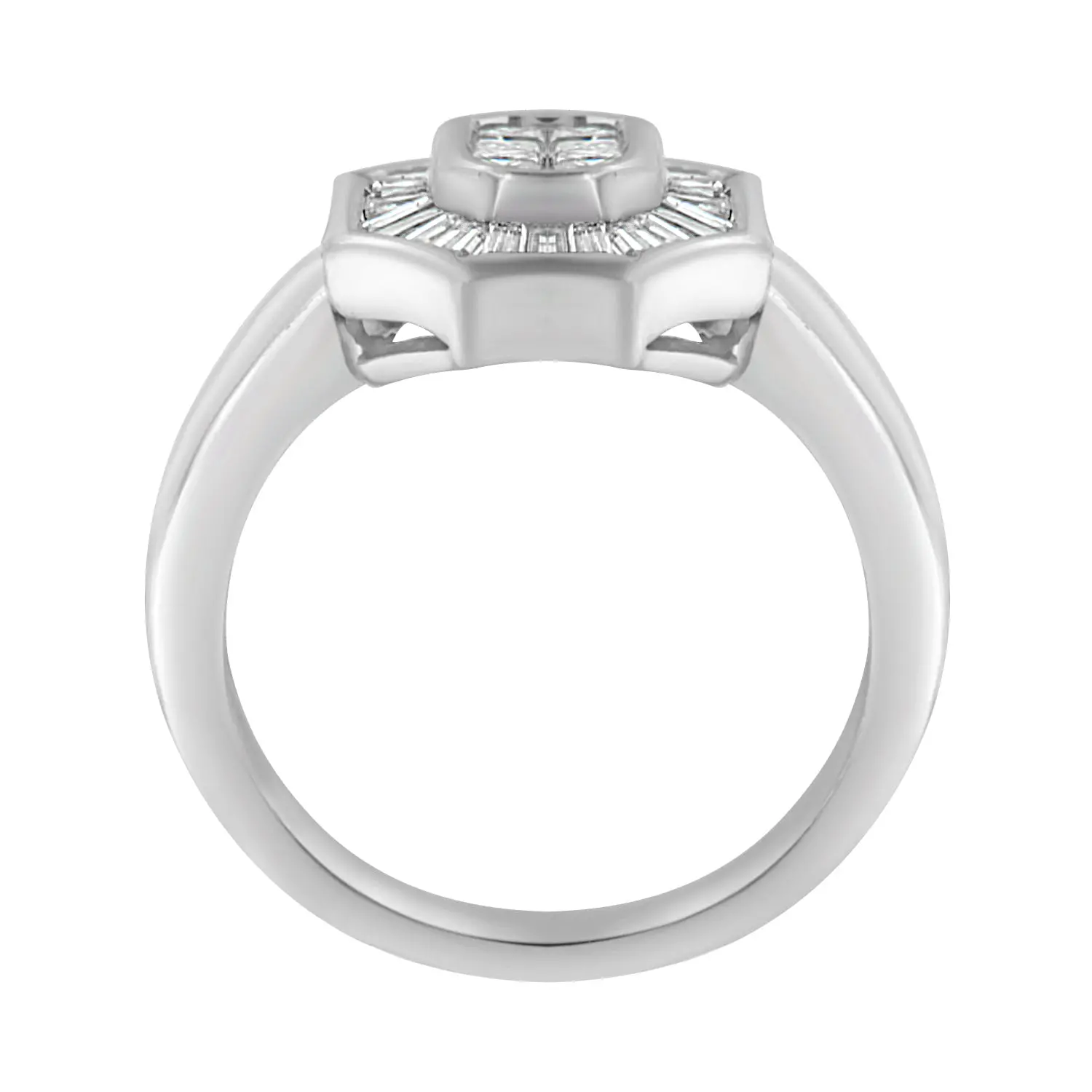 Indulge in the exquisite elegance of this mesmerizing Art Deco-inspired cocktail ring. Crafted with pure 14K white gold, this opulent piece showcases a dazzling array of natural diamonds. The design effortlessly combines 29 captivating baguette diamonds and 8 enchanting princess-cut diamonds, totaling an impressive 1.0 carat. Each diamond glistens with an H-I color, radiating a subtle hint of warmth. With SI1-SI2 clarity, these precious gemstones offer remarkable sparkle and brilliance. The diamonds are intricately set in a combination of channel and invisible settings, ensuring a secure and seamless display. This glamorous ring is specifically designed to captivate attention, making it a perfect accessory for special occasions and soirees. Adorn your finger with this enchanting cocktail ring, and let its shimmering diamonds elevate your style to new heights.