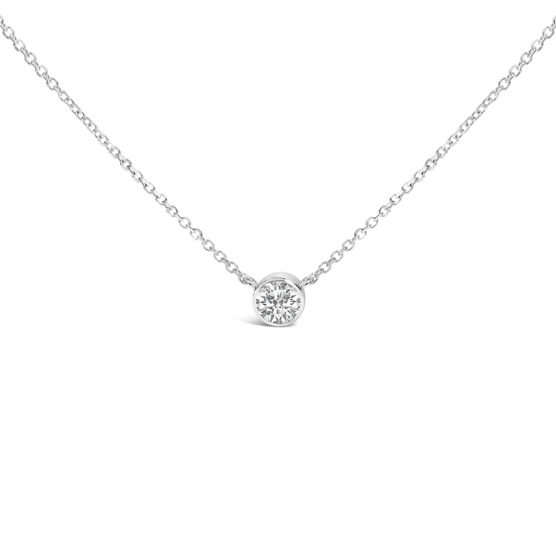 This 14K white gold pendant necklace, with its clean, minimalist design, exemplifies luxury and sophistication. Cradled in a sleek bezel setting, the lab-grown diamond glitters with an intense radiance that captures the light in every room. Weighing 1.00 carat, this round gemstone delights with an F-G color and VS1-VS2 clarity, showcasing a purity and sparkle that rivals natural counterparts. The pendant dangles elegantly from an 18-inch rhodium-plated rope chain, enhancing the cool gleam of white gold while ensuring durability and added shine. Its classic yet contemporary style makes it a versatile addition to any wardrobe, ideal for adding a touch of elegance to everyday wear or as a sparkling statement on special occasions.