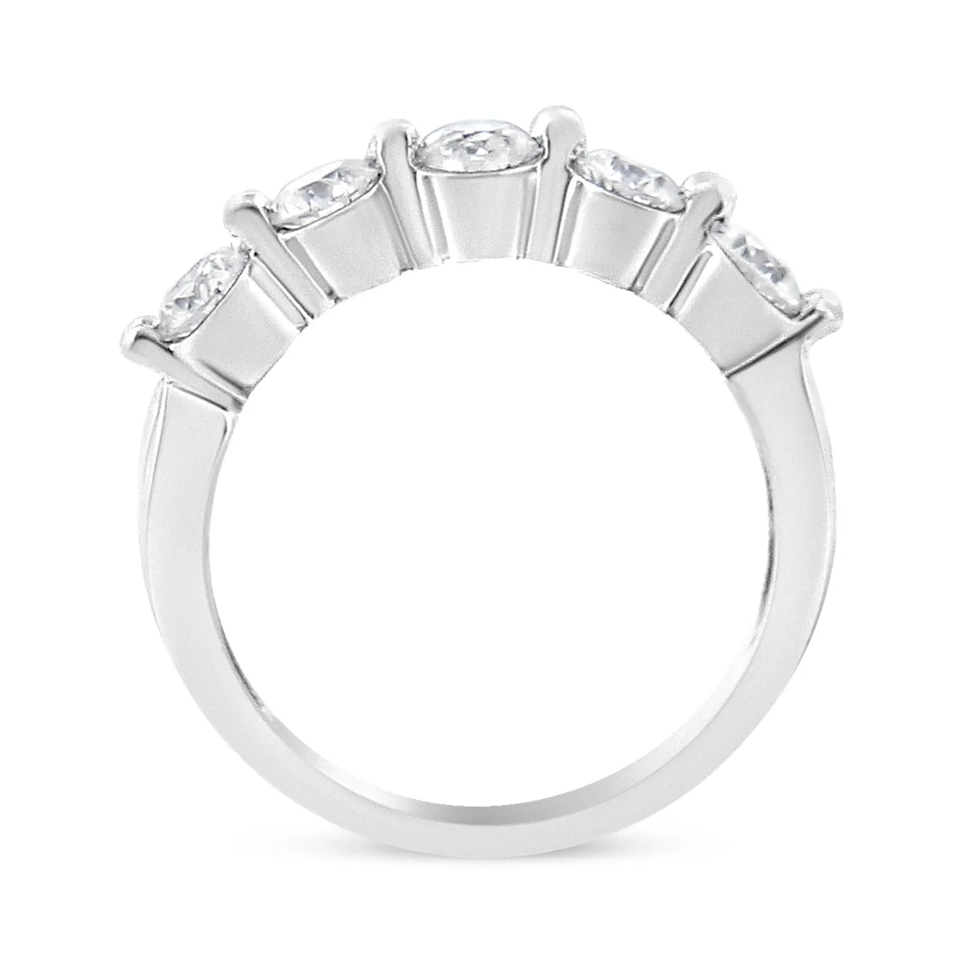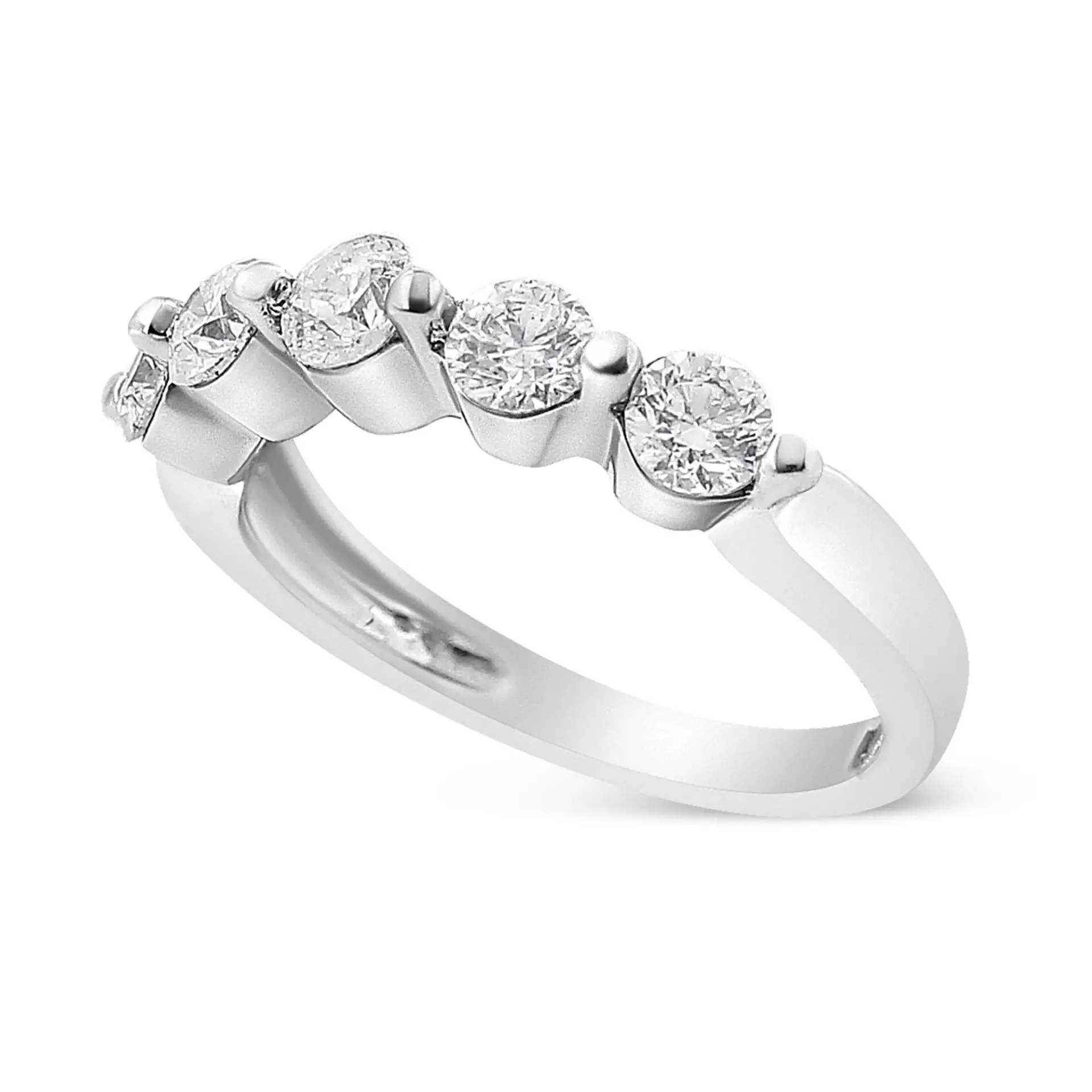 Why only get one diamond when you can have five? Featuring five brilliant round-cut diamonds, the ring shines bright like no other. Set in 14K white gold, take a closer look at each natural stone and youll notice that theyre set in a two-prong setting that adds that slight contemporary flair. Looking for an alternative engagement ring that doesnt stray too far out of the comfort zone? Picking a stunning wedding band for the non-traditional bride to stack with? This stunning piece is the perfect pick no one would say no to. The five diamonds total up to 1 cttw, and its definitely jewelry to cherish forever.