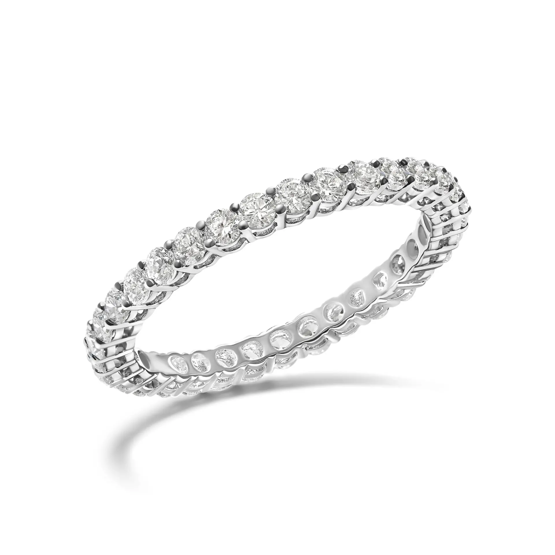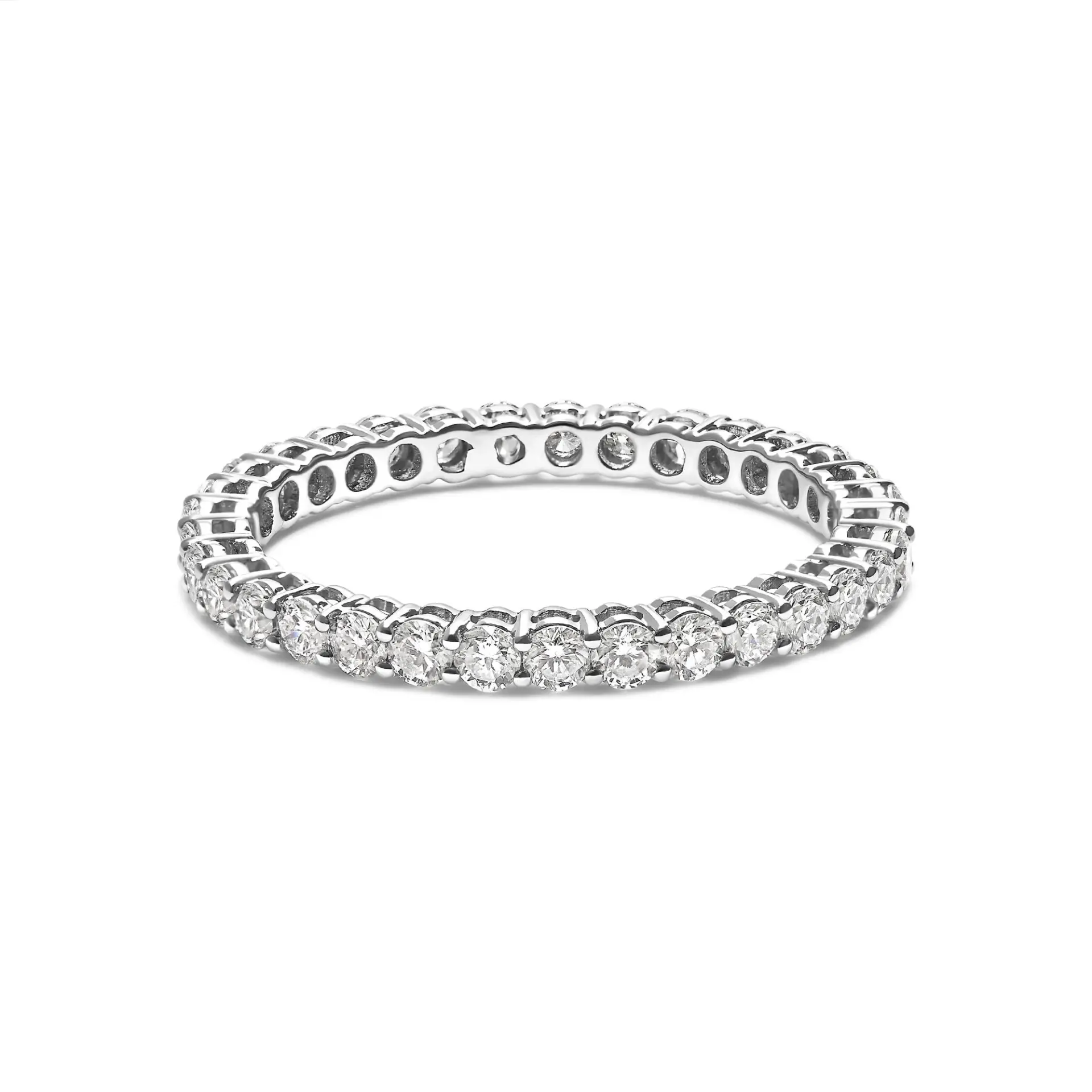 Embrace eternal elegance with this exquisite 14K white gold eternity band, rhodium-plated for enduring luster and strength. Each lab-grown diamond, meticulously crafted to mirror the extraordinary, encircles this eternity ring in a harmonious shared prong setting. With a total carat weight of 1.00, these round brilliant cuts illuminate with an F-G color and VS1-VS2 clarity, exuding unmatched brilliance and fire. This eternity band ring is not just a piece of jewelry, it is a perpetual symbol of timeless beauty and sophistication, designed to elevate every occasion and celebrate life’s endless moments.