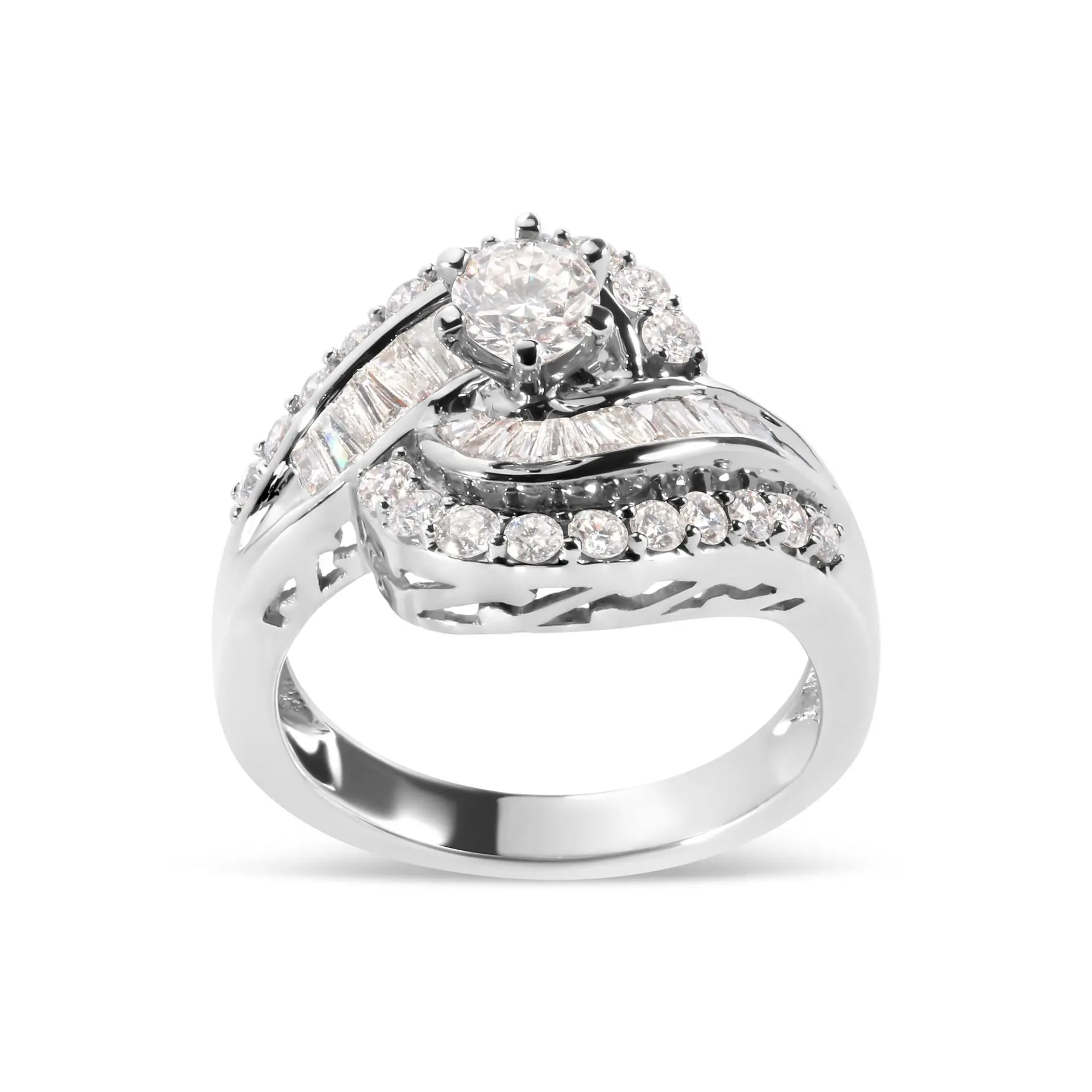 14K White Gold 1.00 Cttw Round and Baguette cut Diamond Swirl Cocktail Ring (H-I Color, SI2-I1 Clarity)