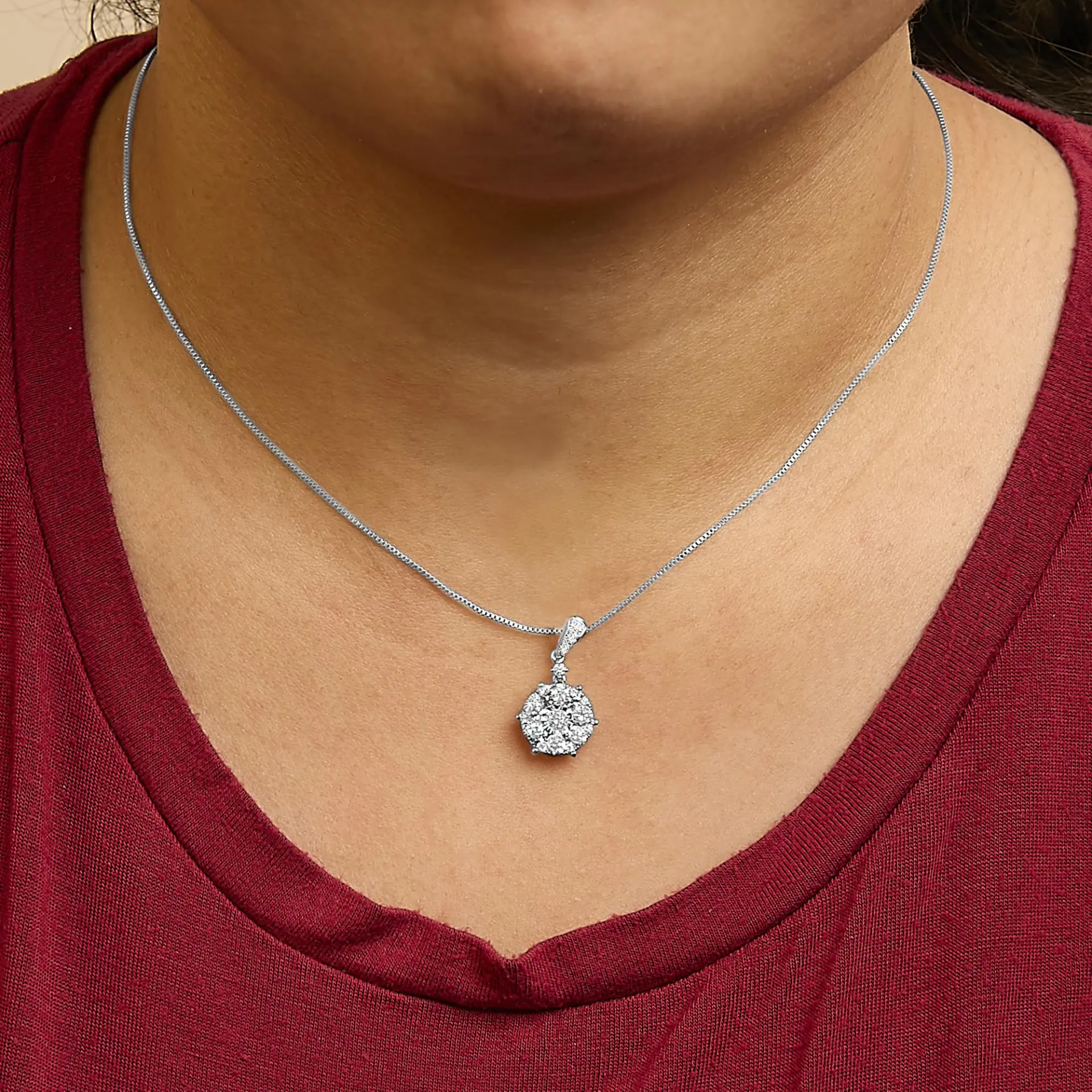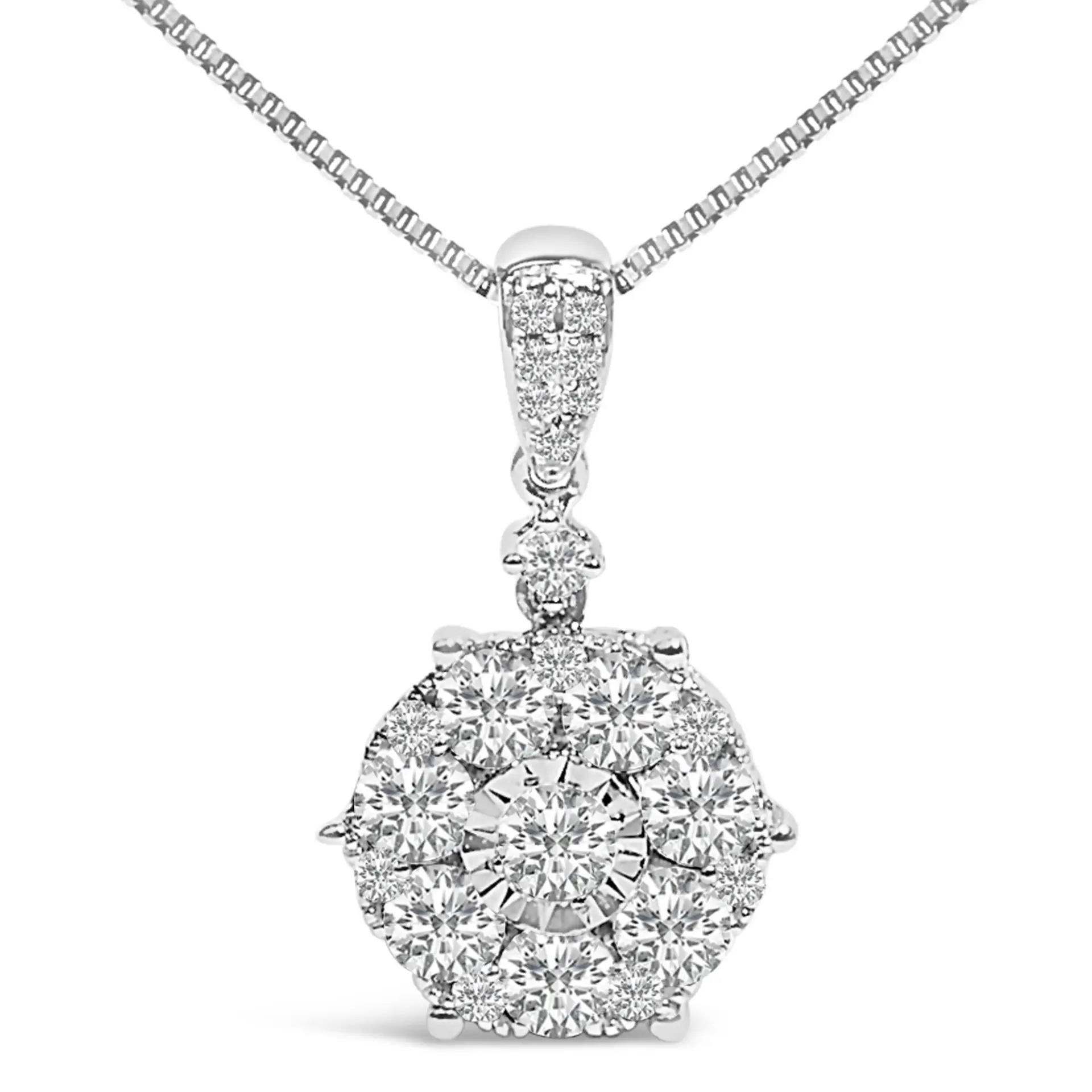 Discover the radiant elegance of this 14K white gold pendant necklace, where a cluster of natural diamonds dazzles irresistibly. Each stone, featuring an F-G color and VS2-SI1 clarity, sparkles with a pure, celestial light, painstakingly set in a rhodium-plated framework that promises not only a brilliant shimmer but enduring strength. The heart of this exquisite piece is its central diamond, dramatically showcased within a miracle plate setting to amplify its luminescence and allure. Draped gracefully on an 18-inch box chain, secured with a dependable spring ring clasp, this necklace is not just an accessory but a proclamation of luxury and refined taste, perfect for enhancing any ensemble with a touch of sophistication and glamour.