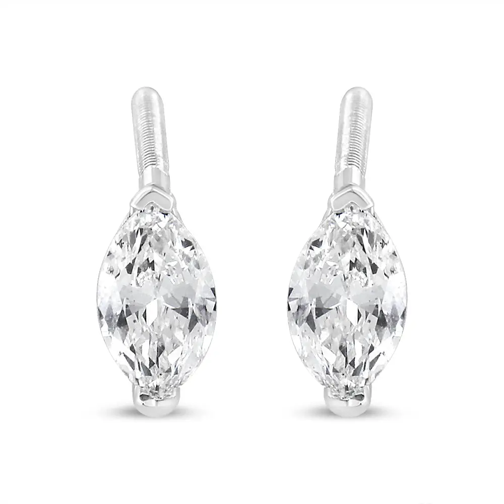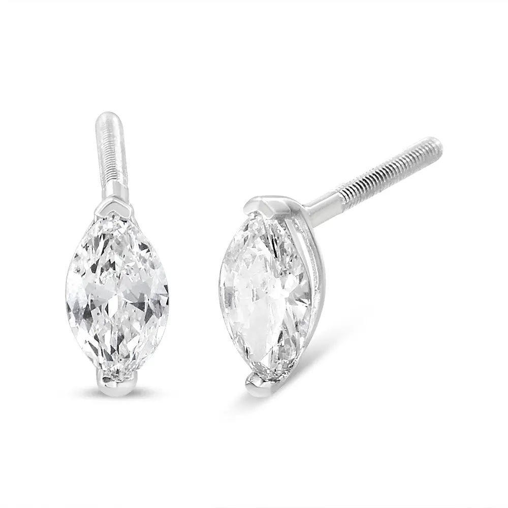 A timeless jewelry essential, these white diamonds studs will bring unparalleled sparkle to your ears. These elegant lab grown diamond stud earrings feature a 2-prong prong setting in a glistening 14k white gold metal. The 2 round, brilliant lab-grown diamonds radiate a beautiful white sparkle as they float within the two-prong setting of these 14k white gold stud earrings. Each lab-grown diamond is crafted to the highest standards and has a VS2-SI1 clarity grade. The studs include dazzling oval-cut lab grown diamonds with a total weight of 1/2 carat and come with a screw on clasp for a secure and comfortable fit.
