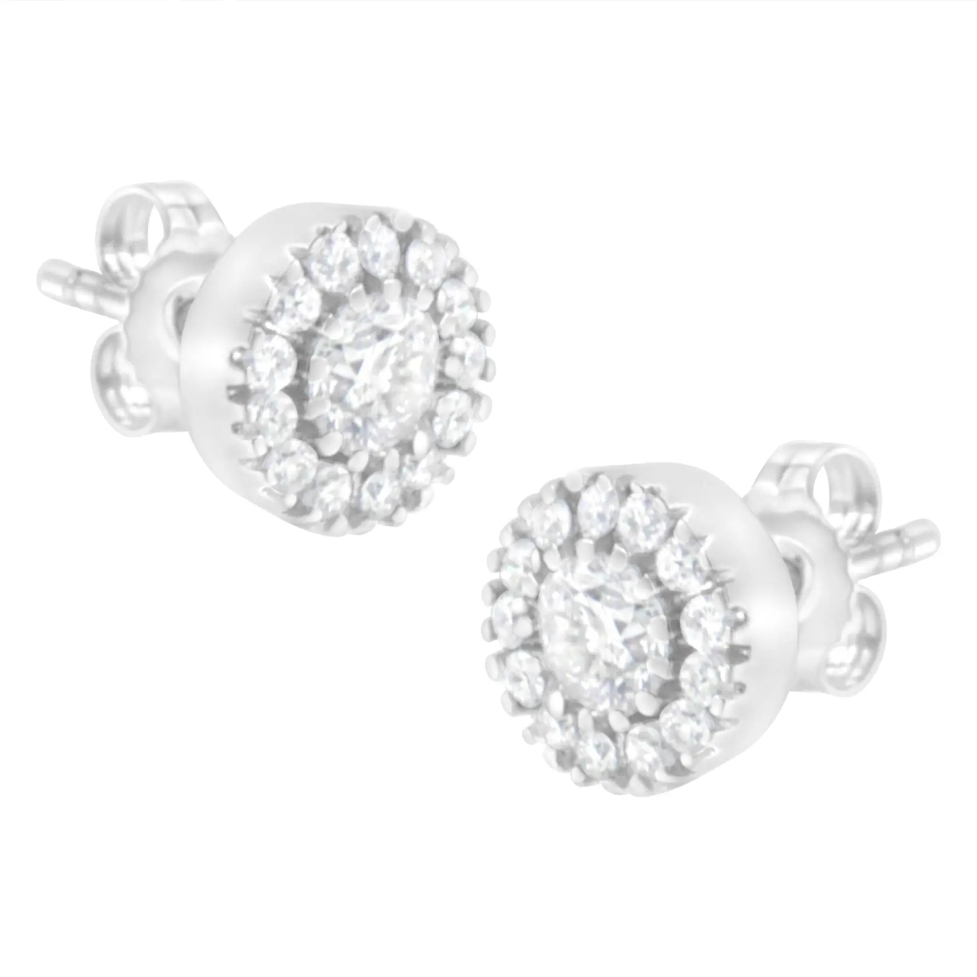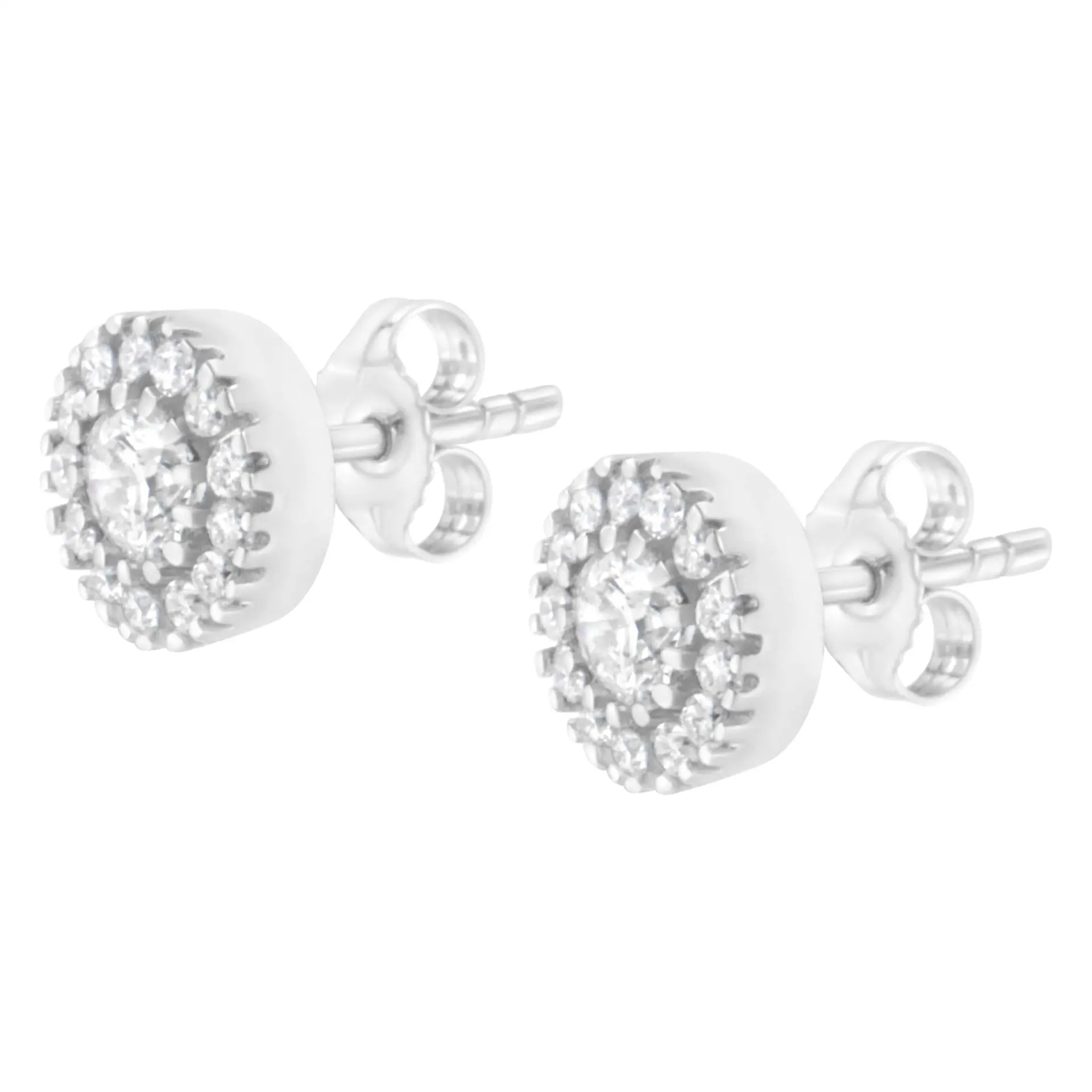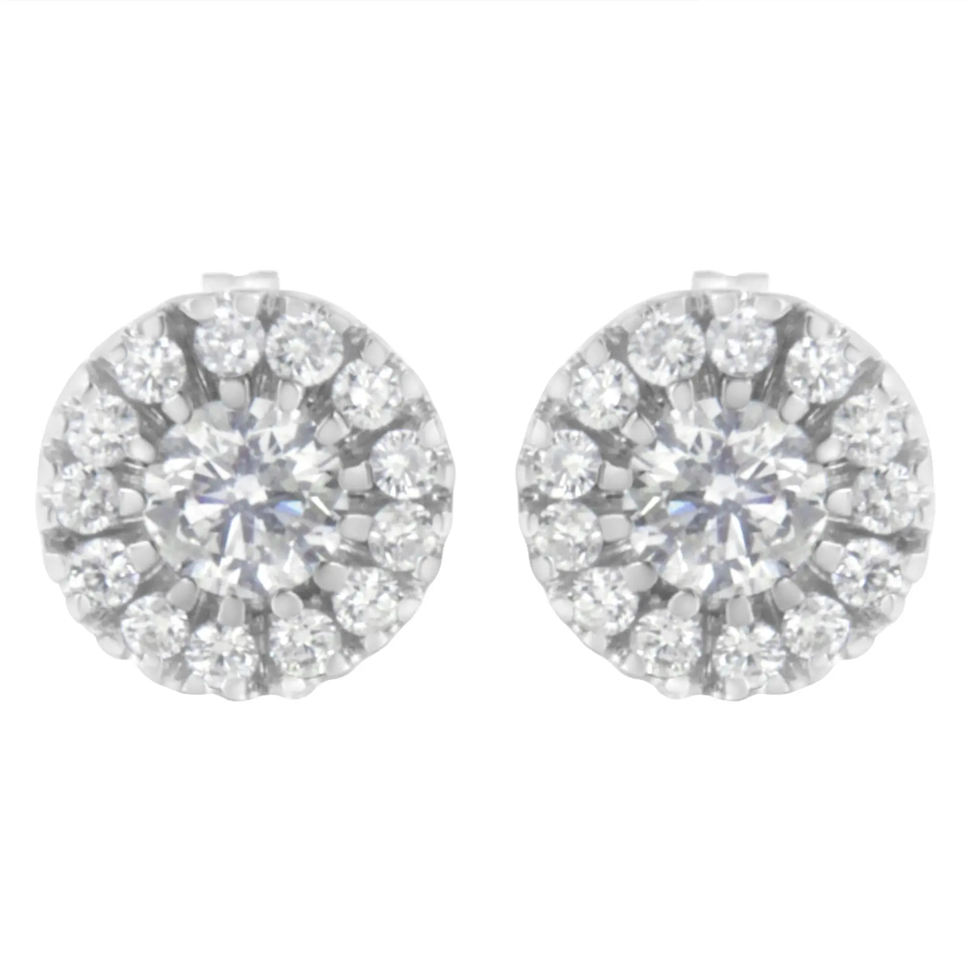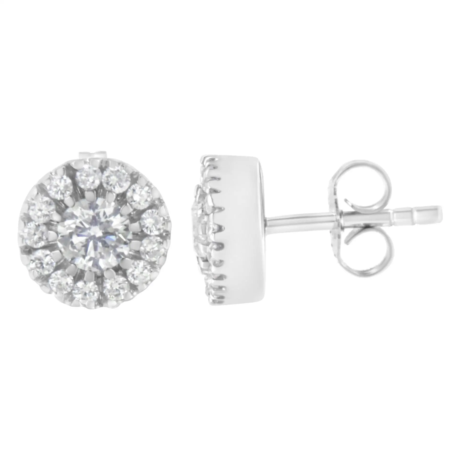 Time to make your appearance glow with this shimmering pair of 1 ct tdw stud earrings. The pair made with 14k white gold also features 2 central prong-set, round-cut diamonds and 26 smaller round-cut diamonds arranged in a pave setting. These earrings can make it easy for one to charm with simplicity and elegance.
