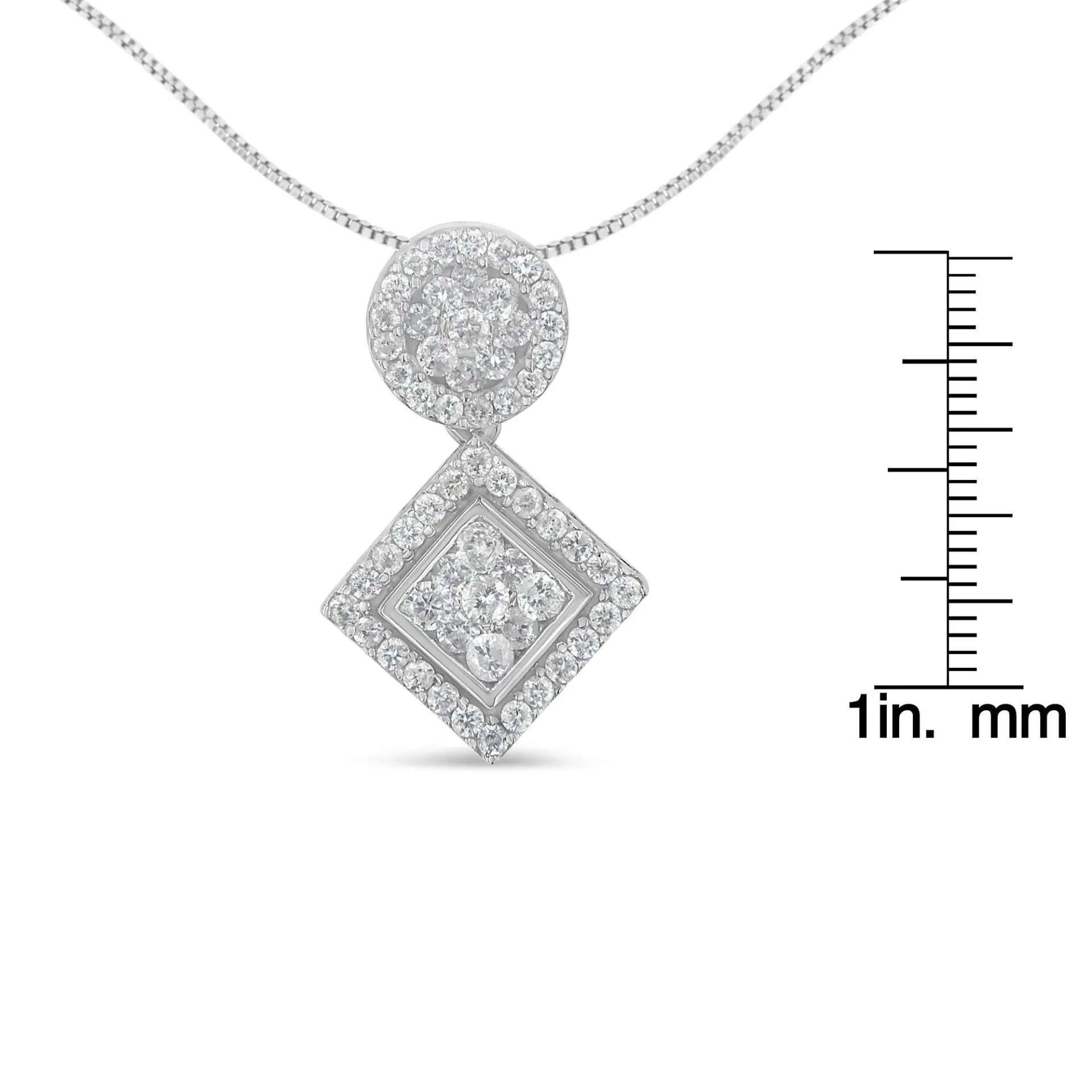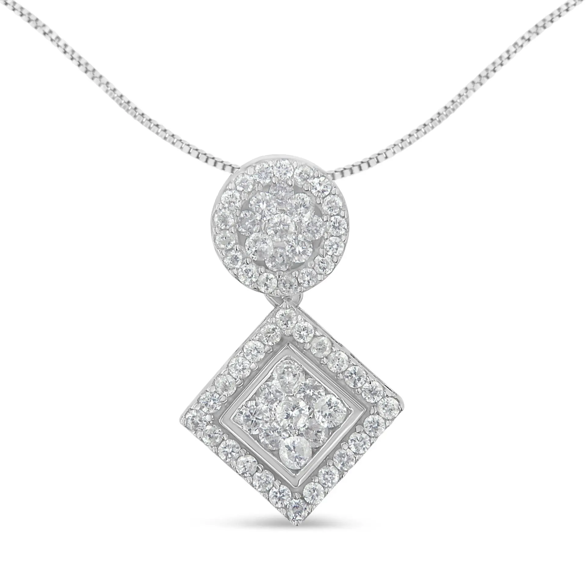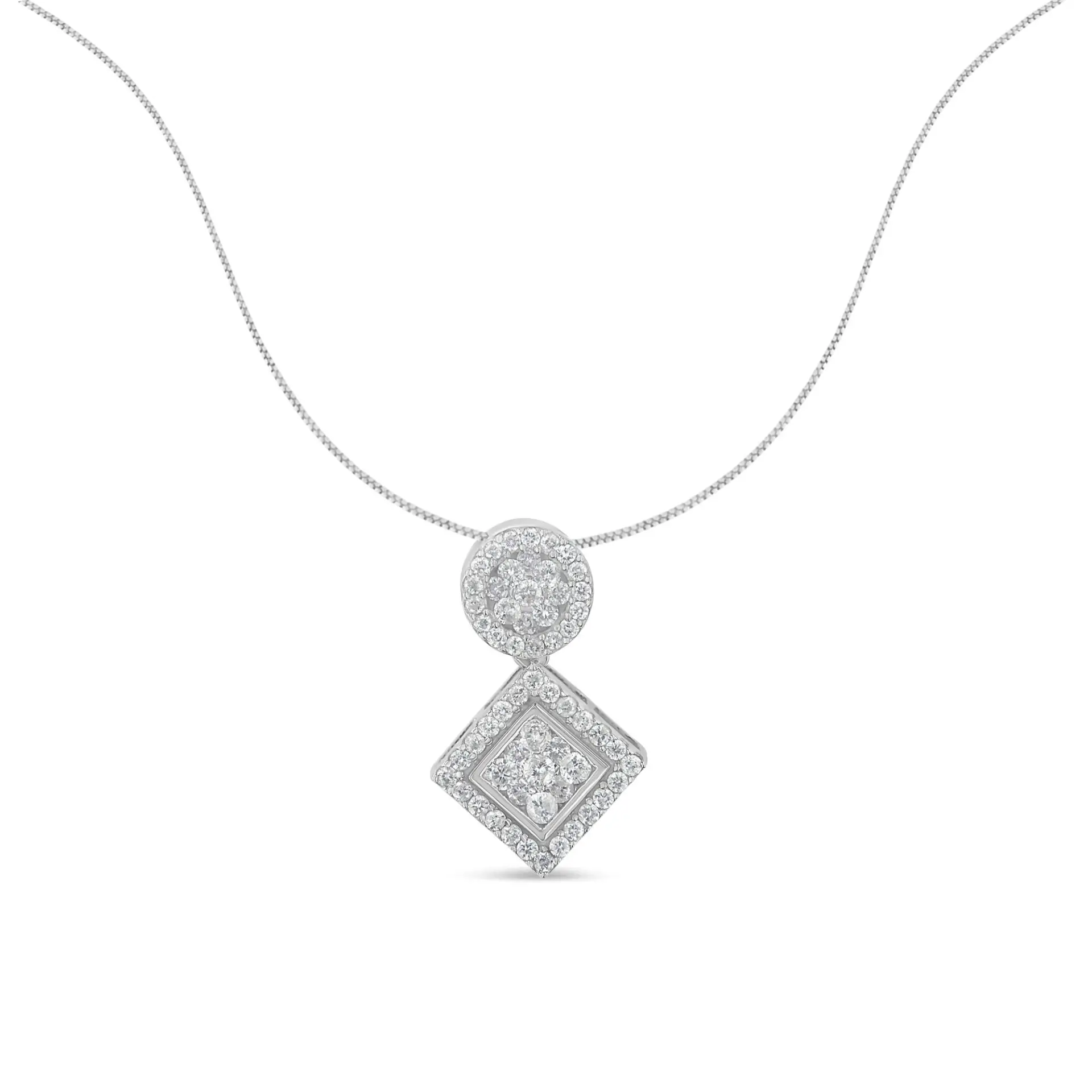 A diamond pendant necklace featuring a geometric design with a round and square clusters of diamonds. This striking necklace is crafted in 14 karat white gold and has a total diamond weight of 1 carat.