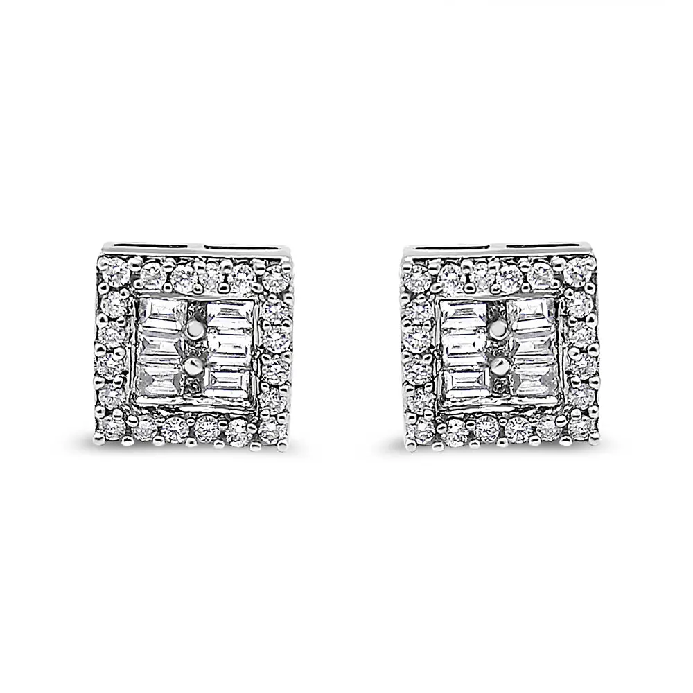 Refresh your regular look by wearing these beautiful diamond stud earrings. These 14k white gold diamond stud earrings are designed in square shape and adorned with one karats round and baguette diamond cut. Its dazzling look and perfect shape make this pair a perfect gift for any lovely lady on any occasion.