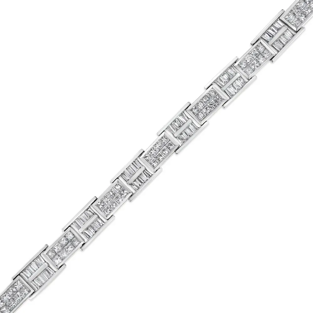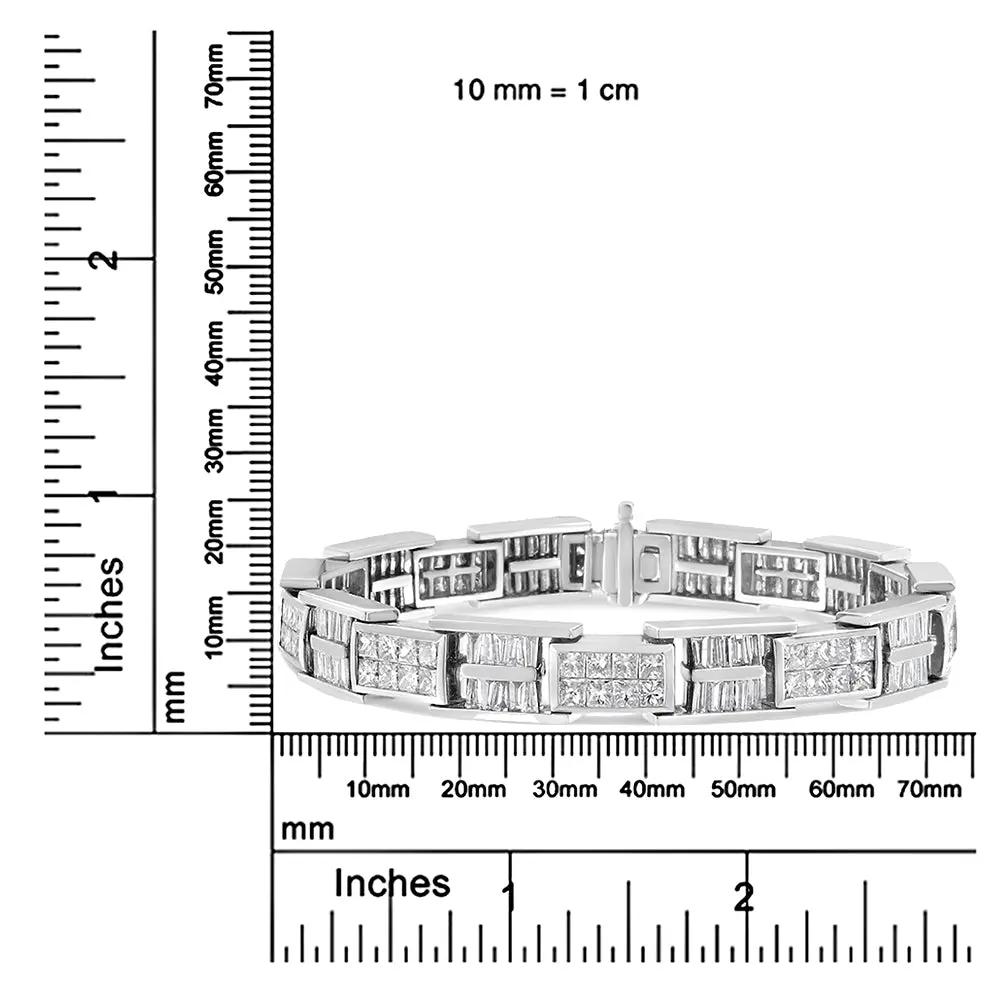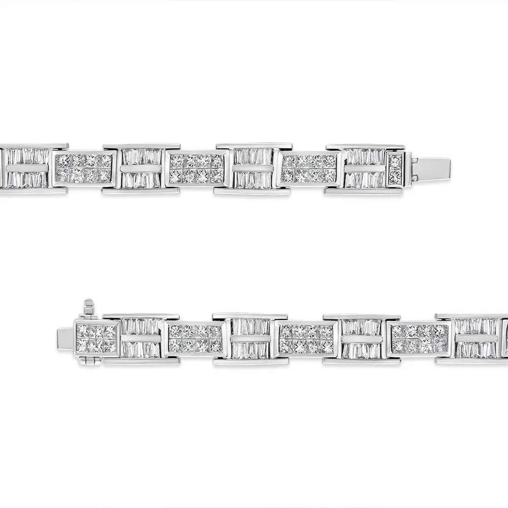Immerse yourself in the opulence of the 14K White Gold Diamond Panel Link Bracelet, where sophistication meets sheer brilliance. Crafted with meticulous precision, this rhodium-plated white gold bracelet exudes a lustrous sheen that promises durability and eternal charm. Each panel link is an artistic expression, featuring a harmonious blend of baguette and princess cut diamonds. The baguettes, channel-set with flawless precision, pair exquisitely with the seamlessly invisible set princess cuts, totaling an impressive 10 5/8 carats. With diamonds of natural origin, flaunting an H-I color grade and SI1-SI2 clarity, this 7-inch masterpiece securely embraces the wrist, enhanced by a robust box clasp and safety latch that promise peace of mind alongside unparalleled elegance. Elevate your jewelry collection with this emblem of luxury, designed not just as an accessory but as a tribute to refined grace.