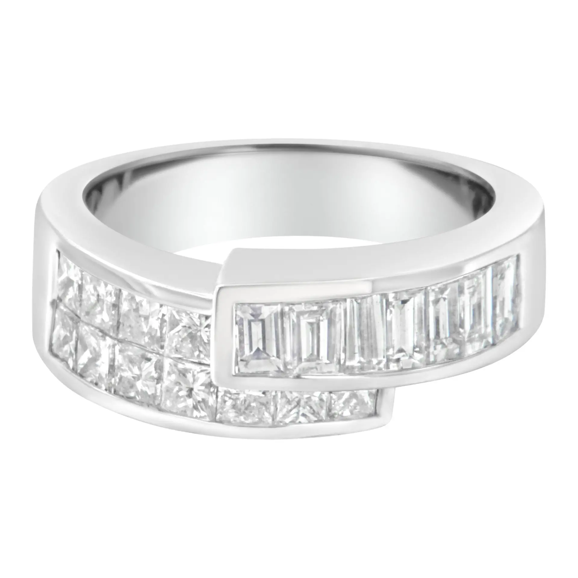 This asymmetrically designed cocktail ring will be the most unique piece you have in your jewelry collection. Crafted in the finest 14k white gold, this ring has an overlapping band that is set with beautiful princess and baguette-cut diamonds. The channel and invisible set diamonds shine in this piece that has an impressive total carat weight of 2 cttw. This is the perfect piece for any formal occasion.