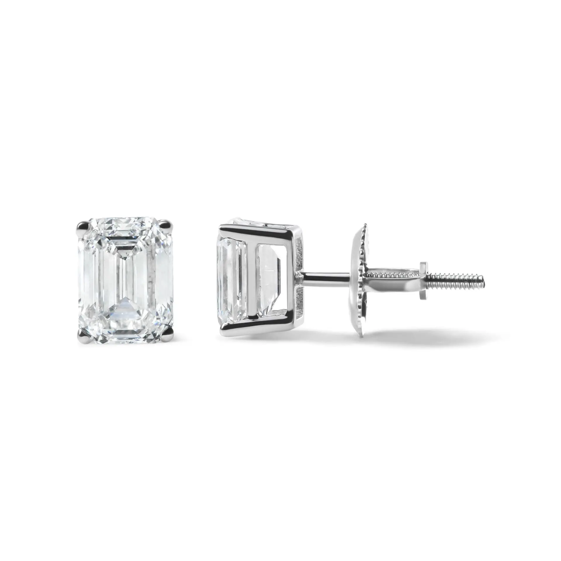 Add a touch of timeless elegance to your jewelry collection with these gorgeous diamond stud earrings. Expertly crafted in 14K white gold, each earring features a magnificent emerald cut lab-grown diamond, radiating brilliance with its G-H color and VS1-VS2 clarity. With a total weight of 2.0 carats, these earrings are sure to make a stunning statement. Designed with a classic prong setting, each diamond is securely held in place, allowing the maximum amount of light to enter and reflect its radiant fire. The screw-on earring finding ensures a secure and comfortable fit, making these earrings the perfect choice for any occasion. Whether dressing up or keeping it casual, these lab-grown diamond stud earrings will add a touch of sophistication to any outfit.