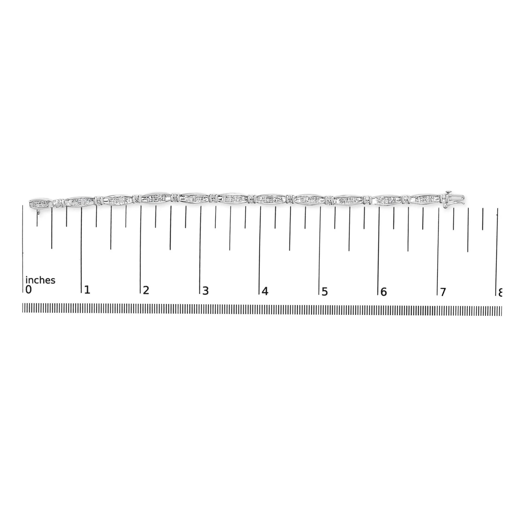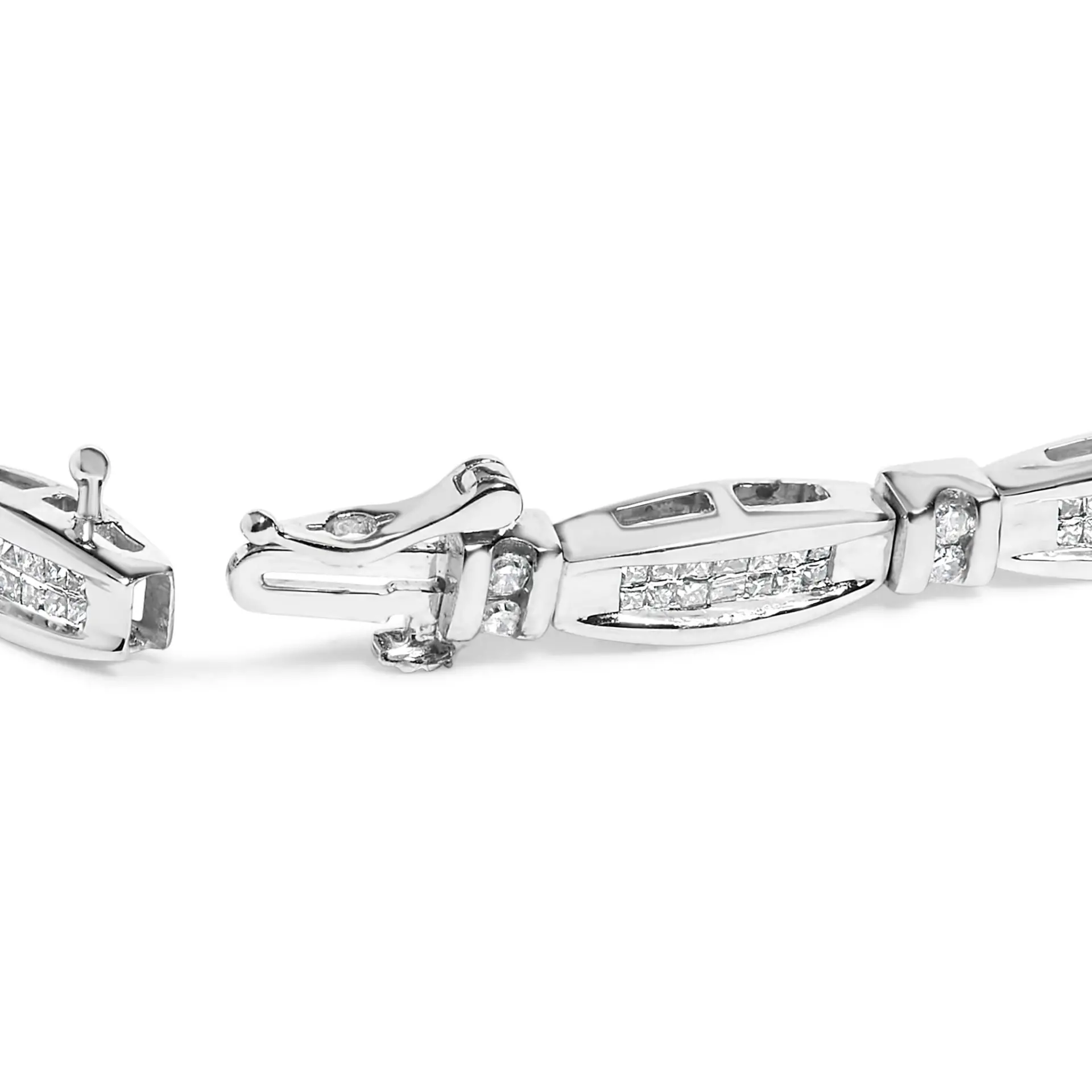 Elegance and sophistication are encapsulated in this exquisite 14K white gold bracelet, bathed in a rhodium finish that enhances its alluring shine. Meticulously crafted, the design integrates natural princess-cut and round diamonds totaling 2.0 carats, with clarity of I1-I2 and color graded I-J, offering a shimmering cascade of light. The unique invisible setting for the princess diamonds harmonizes with the securely channel-set round gems, creating a dance of brilliance along the 7.25-inch length. Secured with a robust box tongue and safety latch, this piece promises not only to dazzle but also to stay gracefully secured on your wrist, symbolizing enduring beauty matched with unparalleled security.