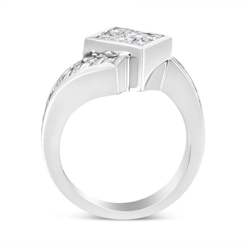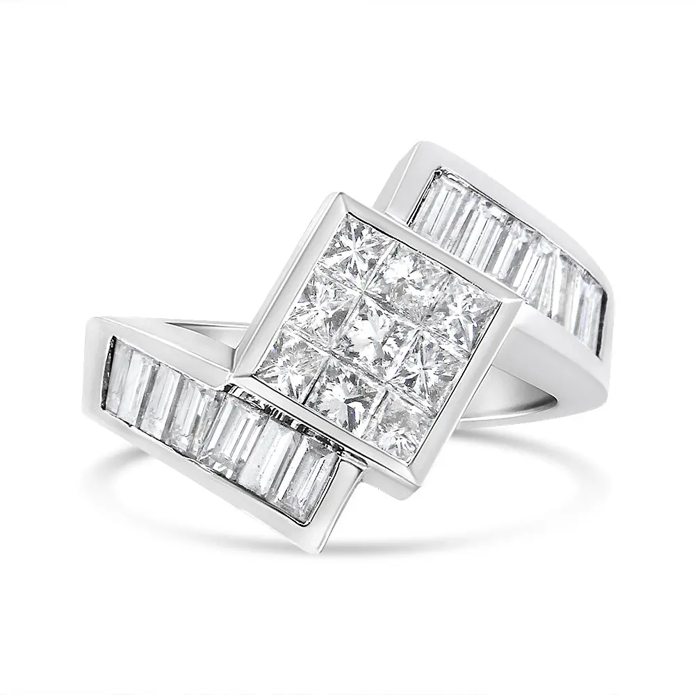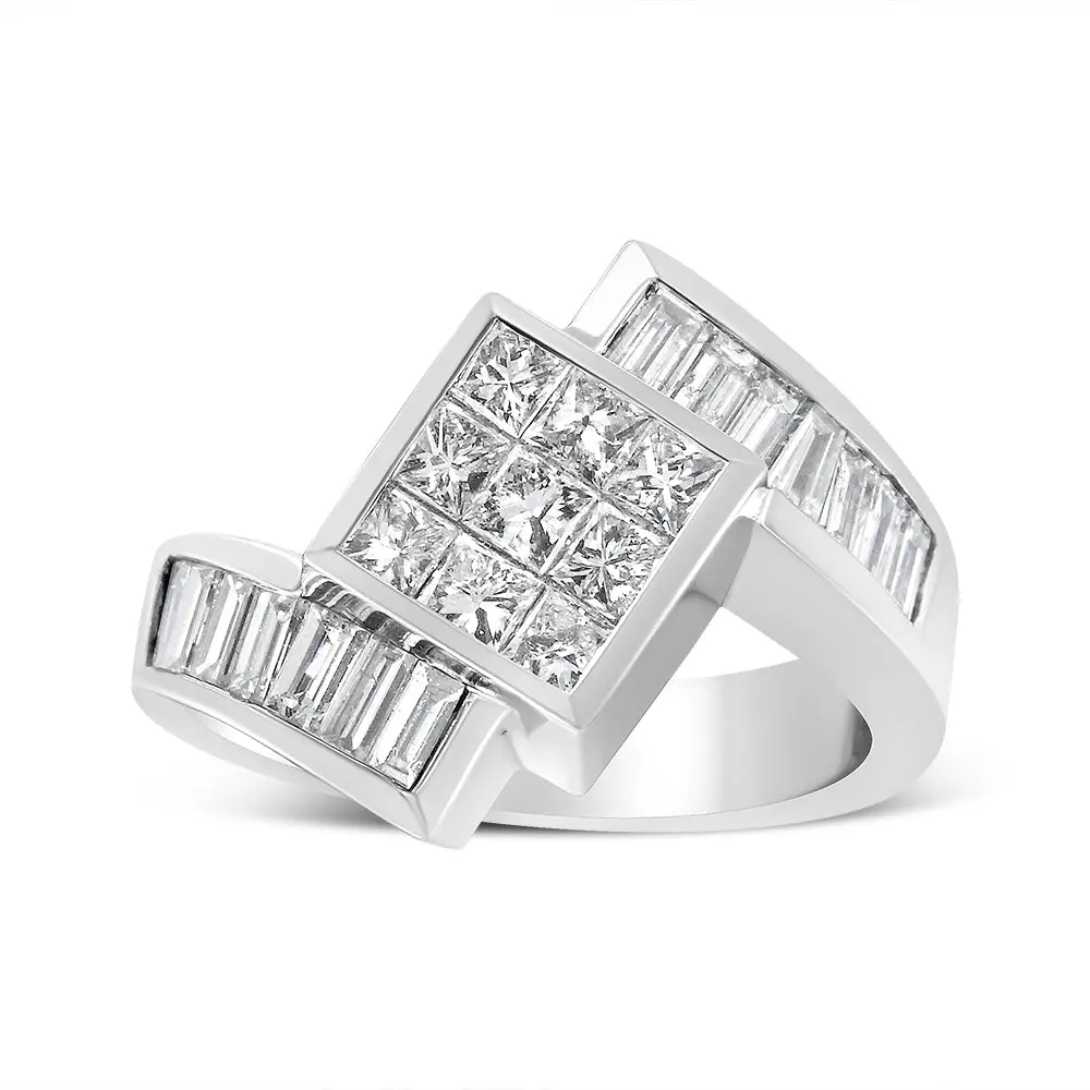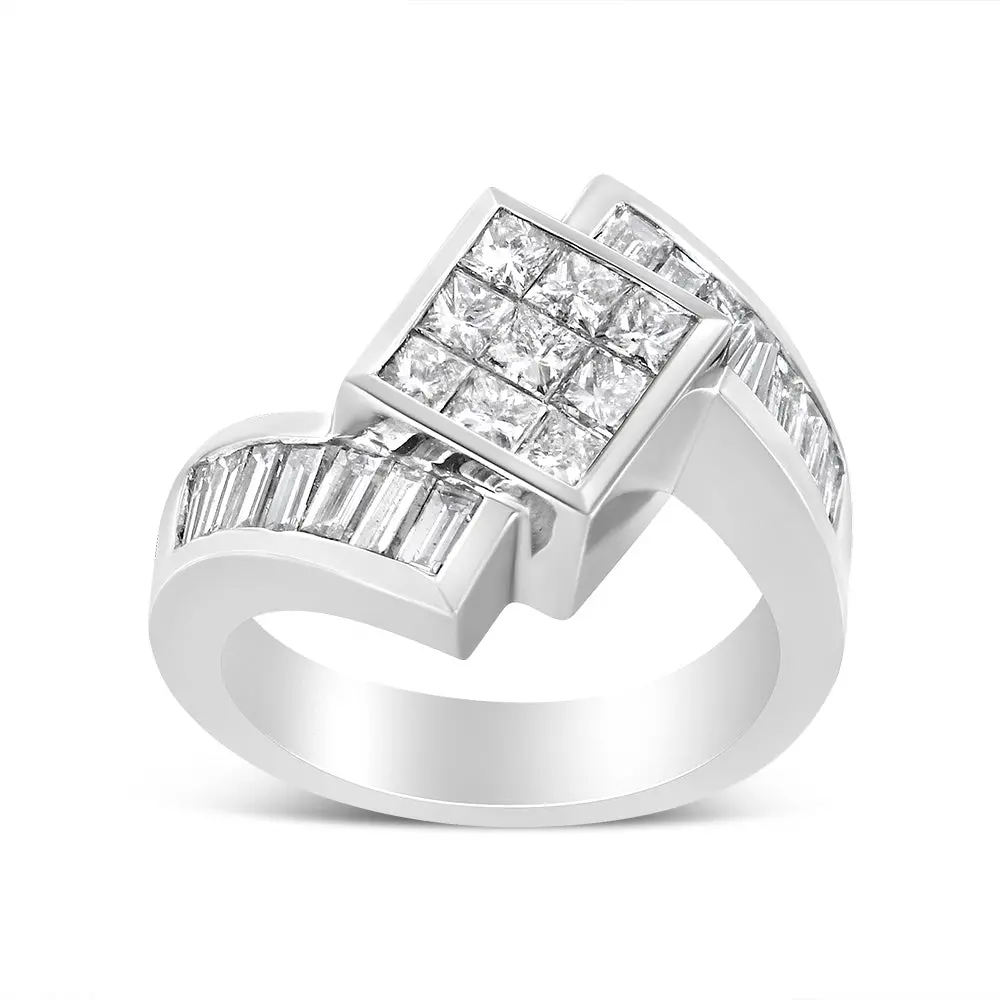 This bypass twist ring is a stunning piece crafted from genuine 14k white gold and features a cluster of Princess-cut center stones that point north to south, taking after the silhouette of a kite, while their invisible settings enhance the diamonds’ brilliant sparkle. The bypass shoulders are adorned with channel-set baguette diamonds giving this cocktail ring a distinctive style. The glamour of these elegant diamonds total 2 1/5 cttw with an approximate G-H Color and VS2-SI1 Clarity.