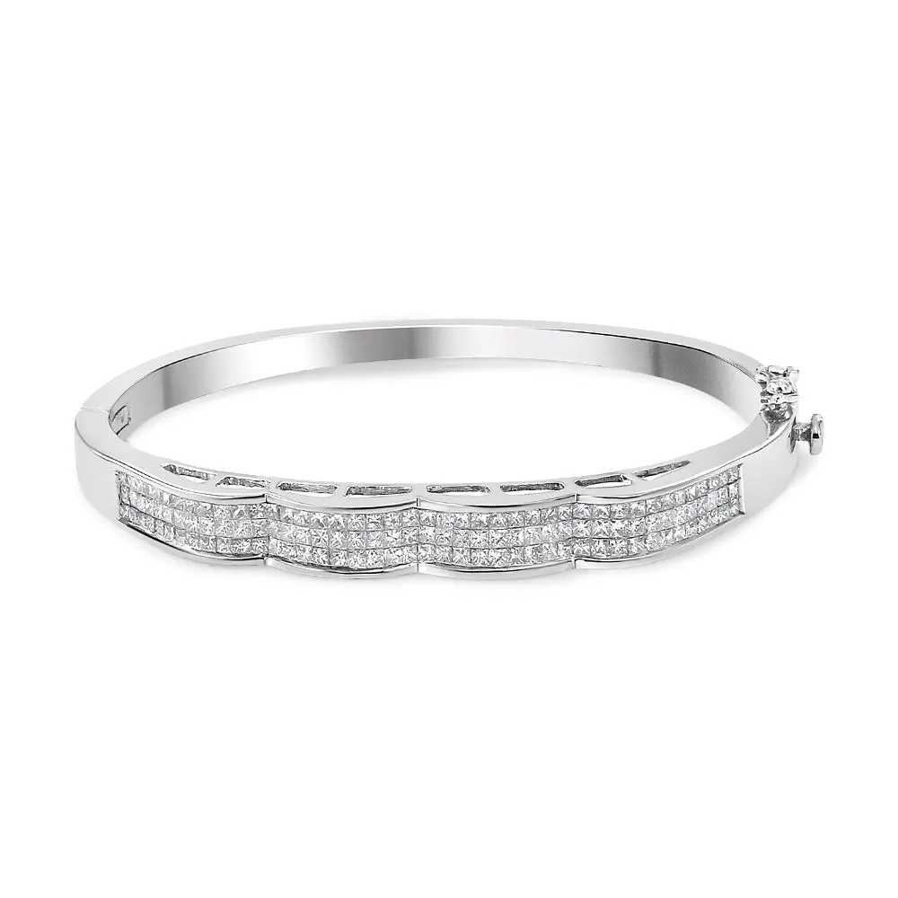 Modern and unique, this beautiful design will bring a glamorous touch to her jewelry collection. This bangle is created in the finest 14k white gold and is expertly set with natural diamonds in a wave-like pattern. The diamonds are princess-cut and embellished in an invisible setting. Designed to wrap her wrist with sparkle, this 3 1/3 ct. t.w. diamond bracelet is finished with a bright polished shine. The 7.0-inch bangle bracelet secures with a tongue and groove clasp.
