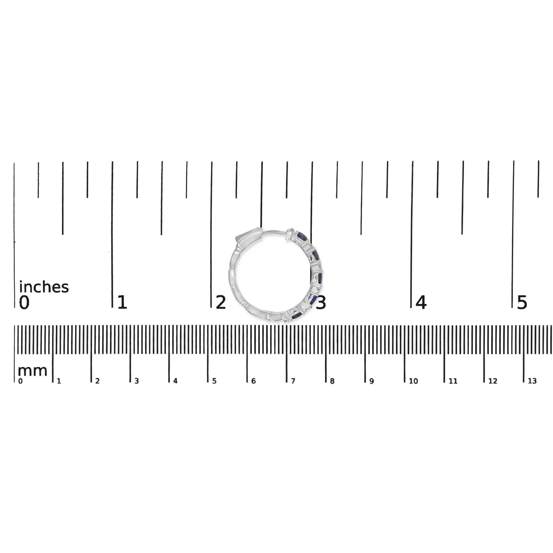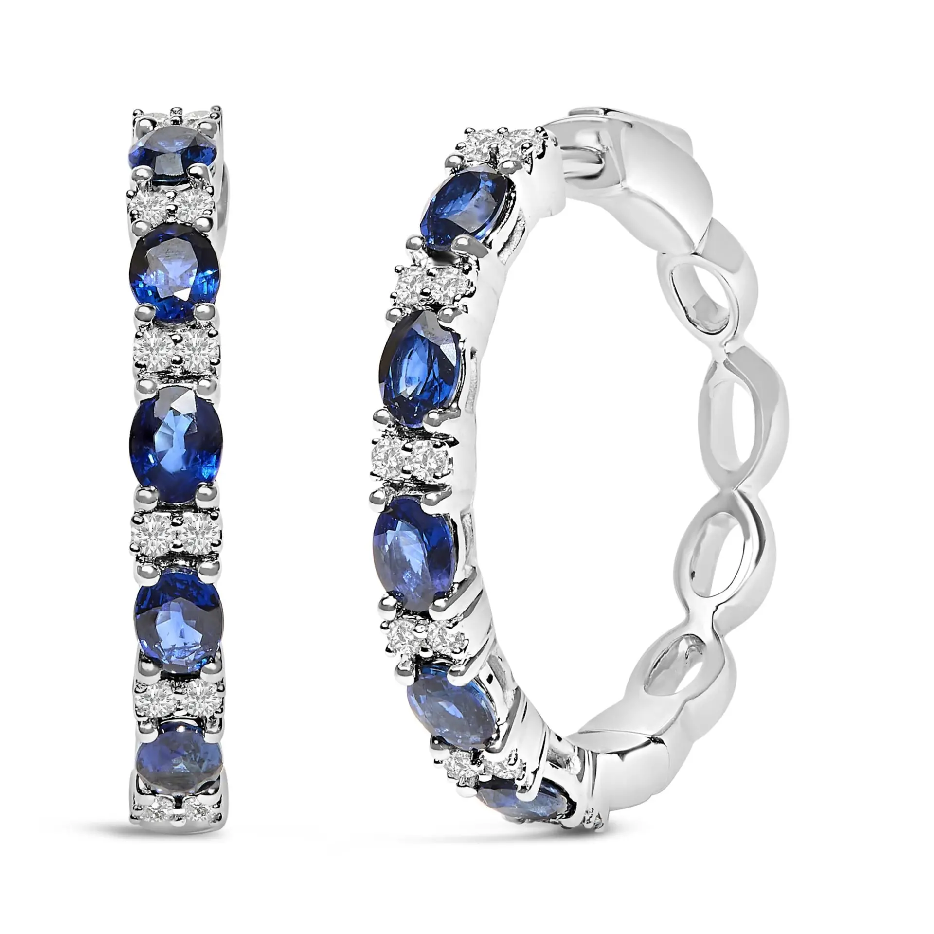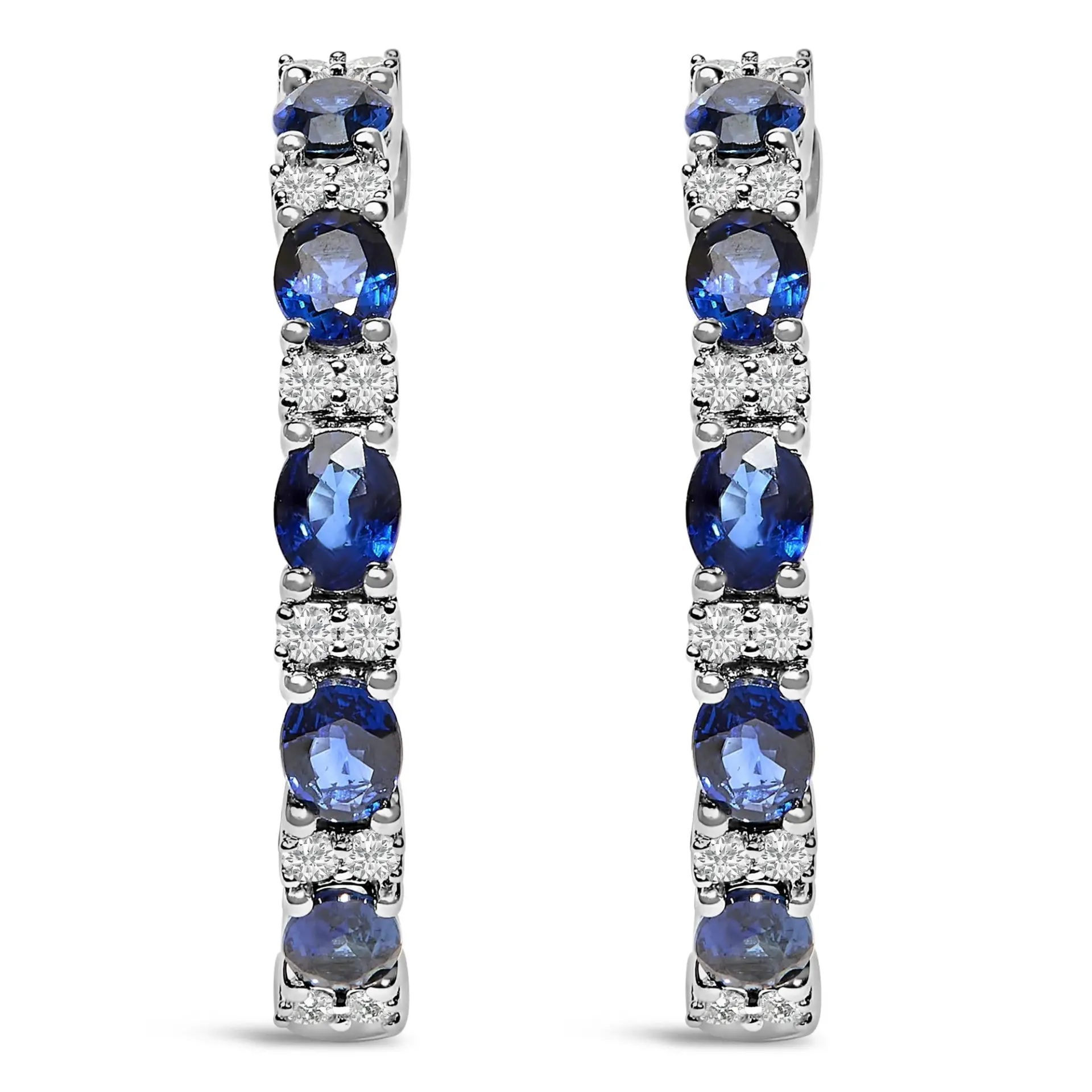 Immerse yourself in the elegance of these 14K white gold hoop earrings, masterfully rhodium-plated for a mirror-like shine. Enchantingly delicate, each hoop dances with the deep, endless blue of natural sapphires and the scintillating radiance of natural diamonds. This exquisite pattern alternates between a quartet of prong-set oval sapphires and duos of twinkling diamonds, each set sharing prongs that magnify their collective glow. With a dangle length of approximately 0.90 inches, these earrings offer just the right play of light to draw attention with every turn of your head. The diamonds, characterized by an I-J color and SI2-I1 clarity, enhance the sophisticated chromatic harmony. Embrace timeless glamour secured with a snap post, embodying both unaltered grace and heirloom-worthy craftsmanship.