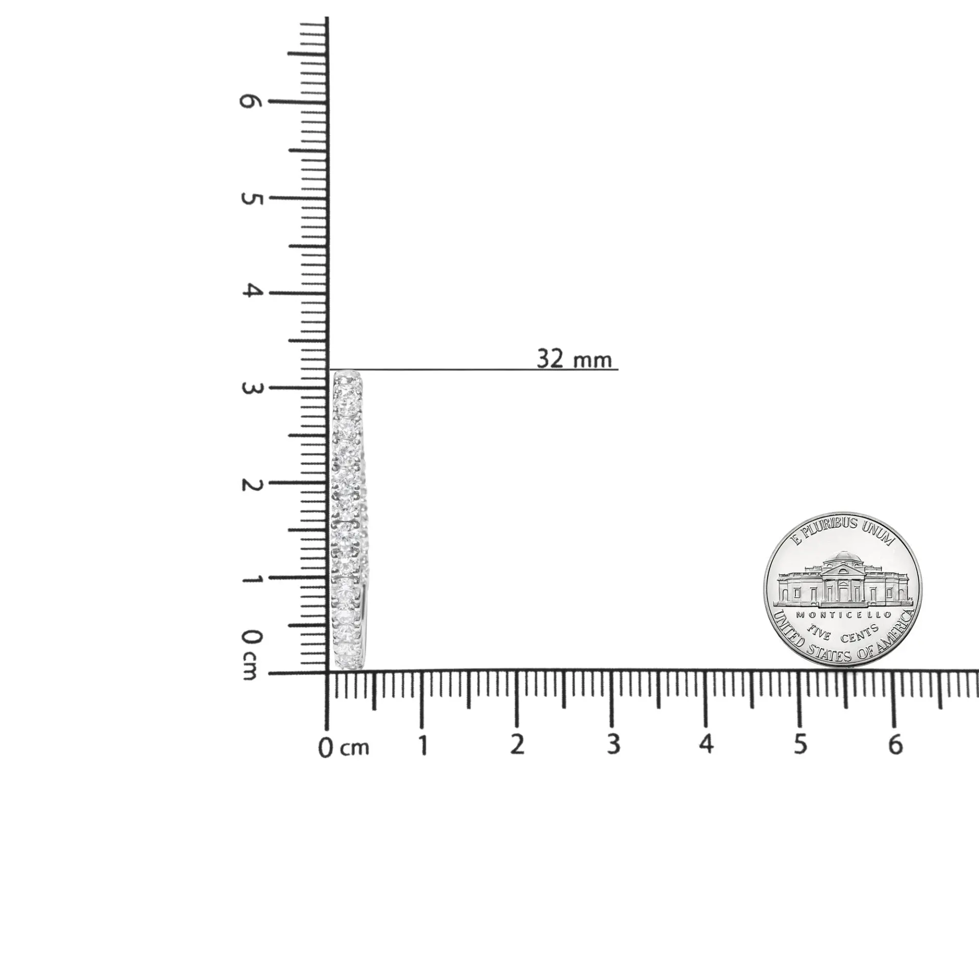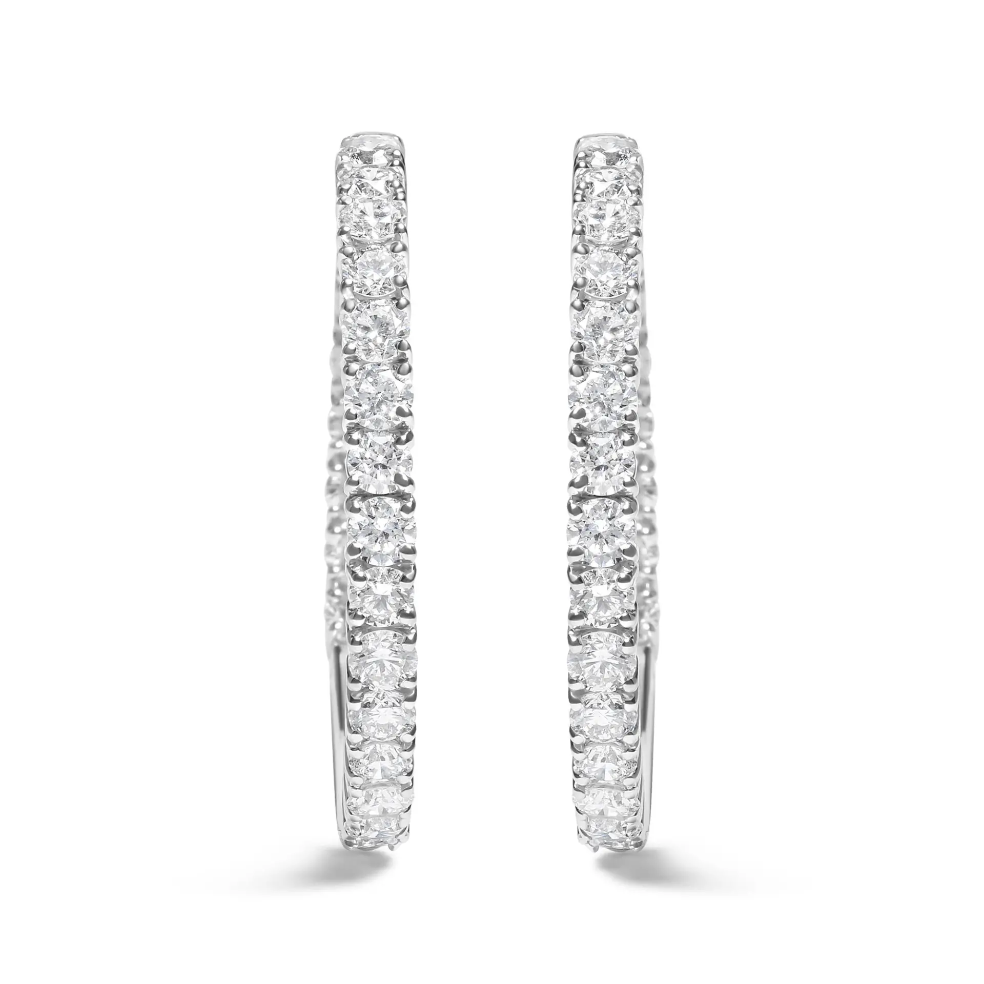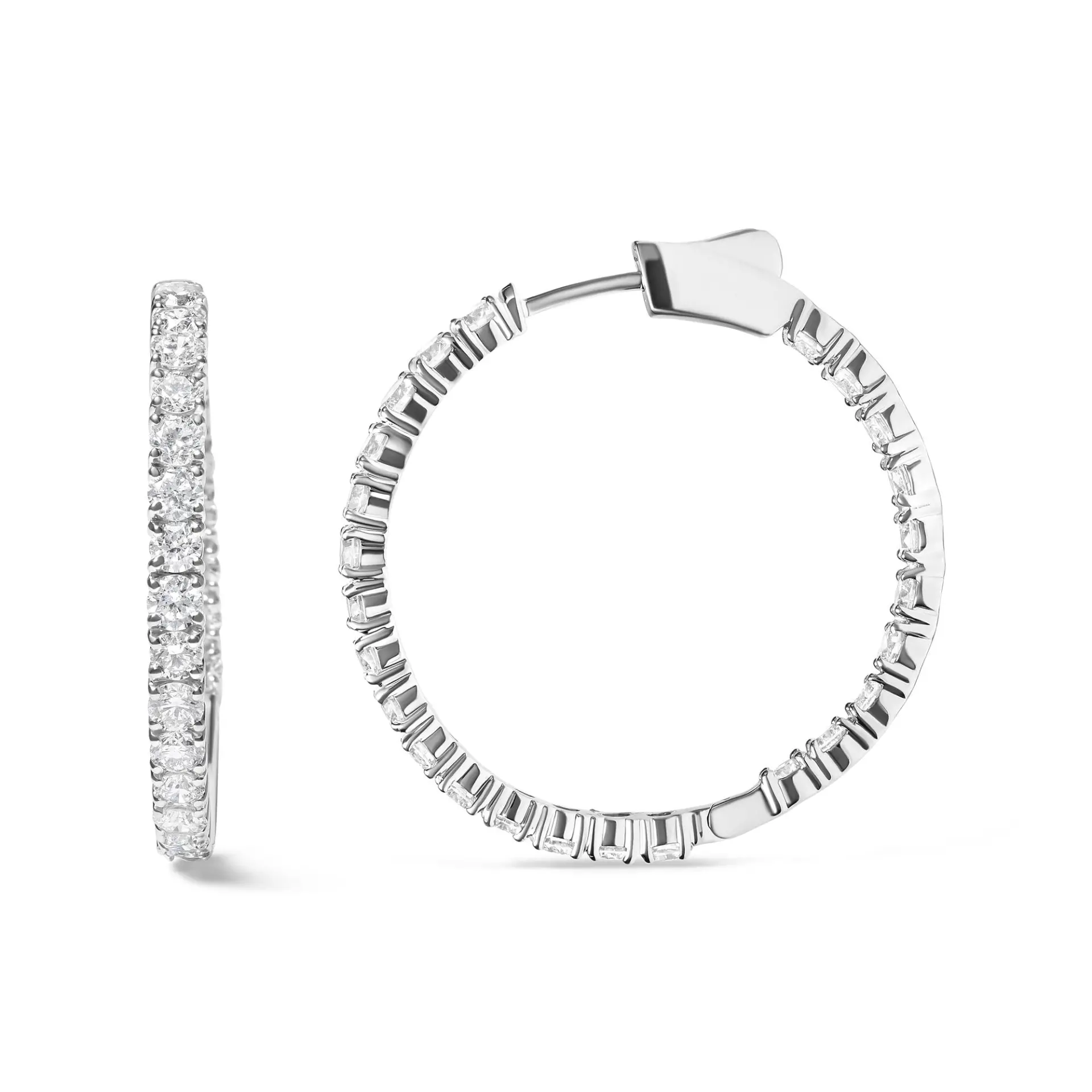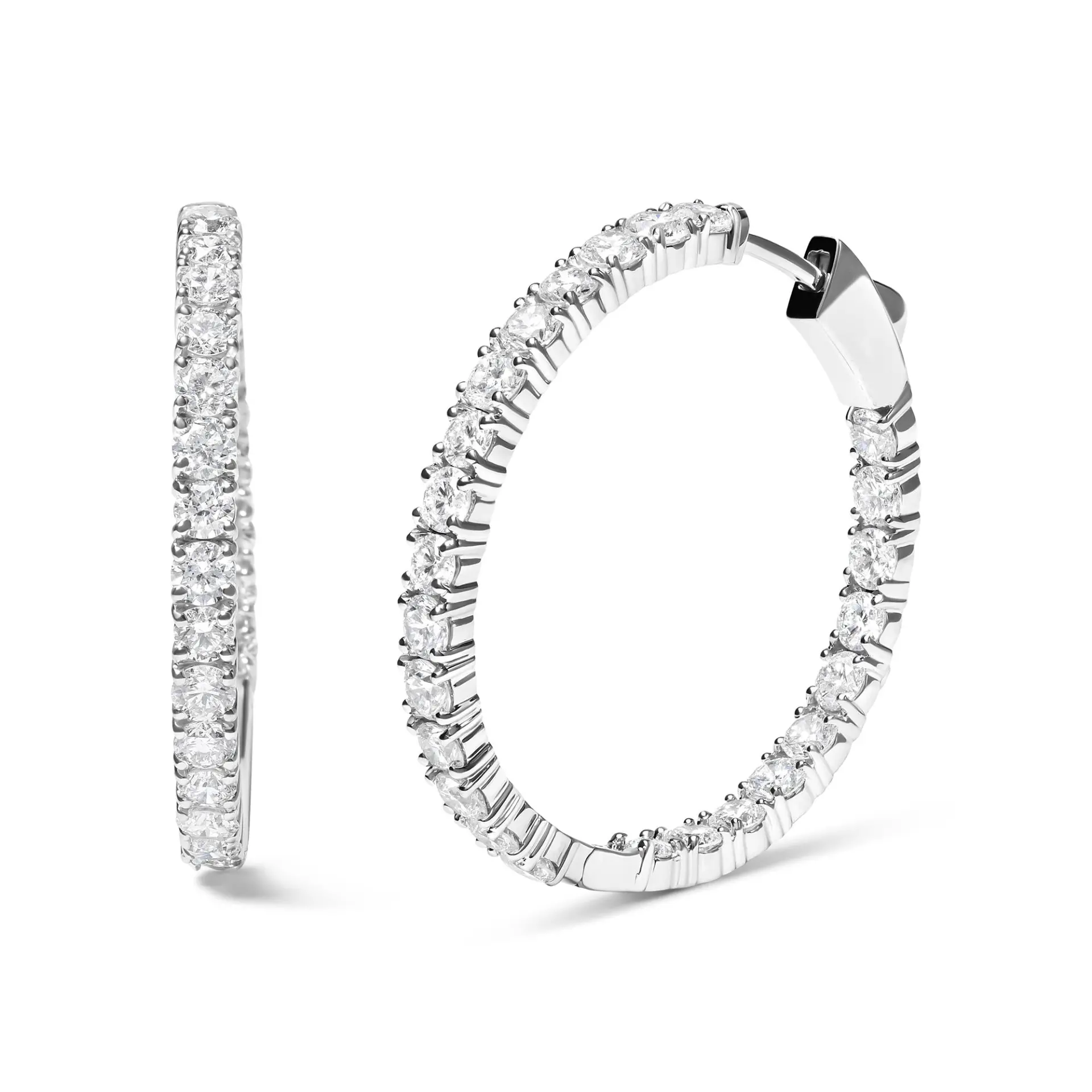 Indulge in the ultimate luxury with these magnificent 14K white gold inside out hoop earrings. Adorned with 50 shimmering, lab-grown round diamonds, these earrings boast a breathtaking 5.0 carats of fire and brilliance. The diamonds are rated F-G for color and VS1-VS2 for clarity, ensuring their sparkling beauty will last a lifetime. Each diamond is securely set in a prong setting, maximizing their sparkle. The earrings are designed with a snap post for ease of wear and maximum comfort. These lab-grown diamond inside out hoop earrings are the perfect addition to any jewelry collection, adding a touch of glamour to any outfit. Whether you’re looking to make a statement or simply treat yourself, these earrings are the epitome of style and sophistication.