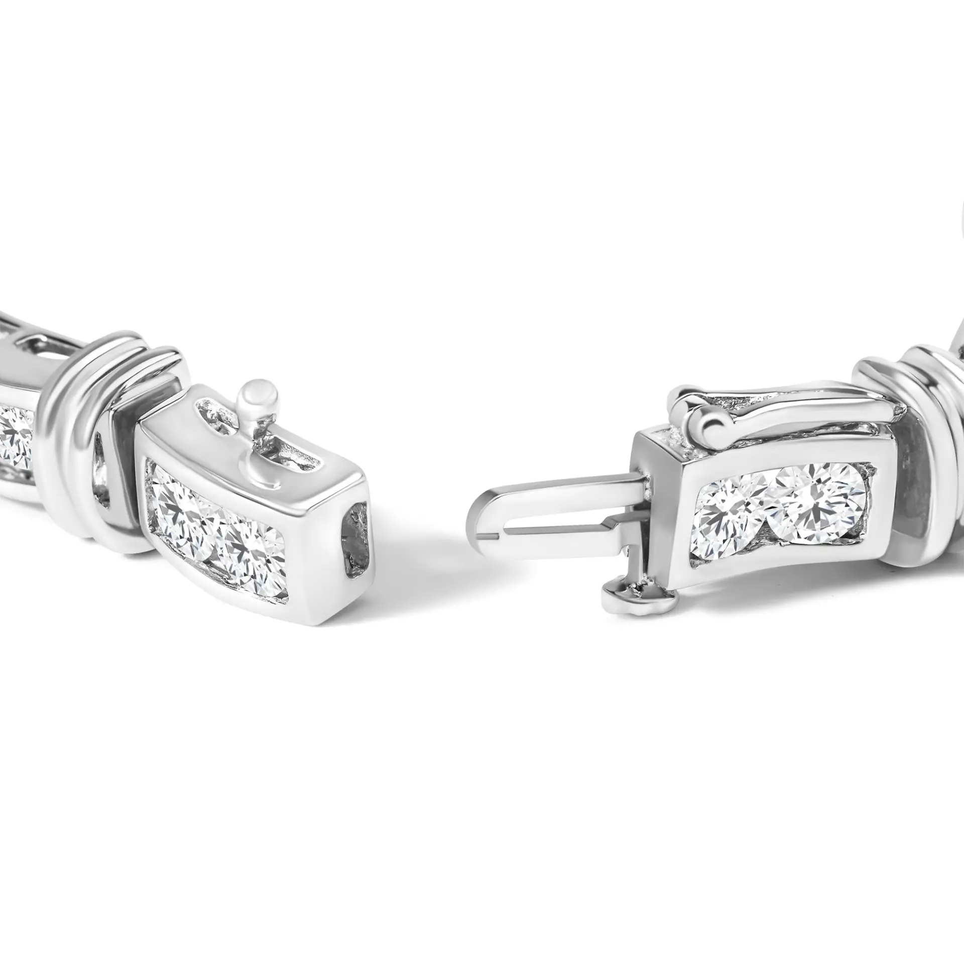 Immerse yourself in the opulence of the 14K White Gold Diamond 4 Stone Link Bracelet, a masterpiece meticulously crafted to shimmer with every turn of your wrist. Each link of this exquisite piece is adorned with four natural diamonds, channel-set to amplify their intrinsic brilliance across a total of 6 3/4 carats. The gems, with a near-colorless aura and clarity that captures the very essence of fine jewelry, float within a frame of rhodium-plated white gold, ensuring an enduring sparkle that echoes classic elegance. Designed to gracefully hug wrists up to 7 inches, and secured with a robust box clasp and safety latch, this bracelet is not just a piece of jewelry but a symbol of sophistication, perfect for adorning at any significant event or casually enhancing your everyday ensemble.