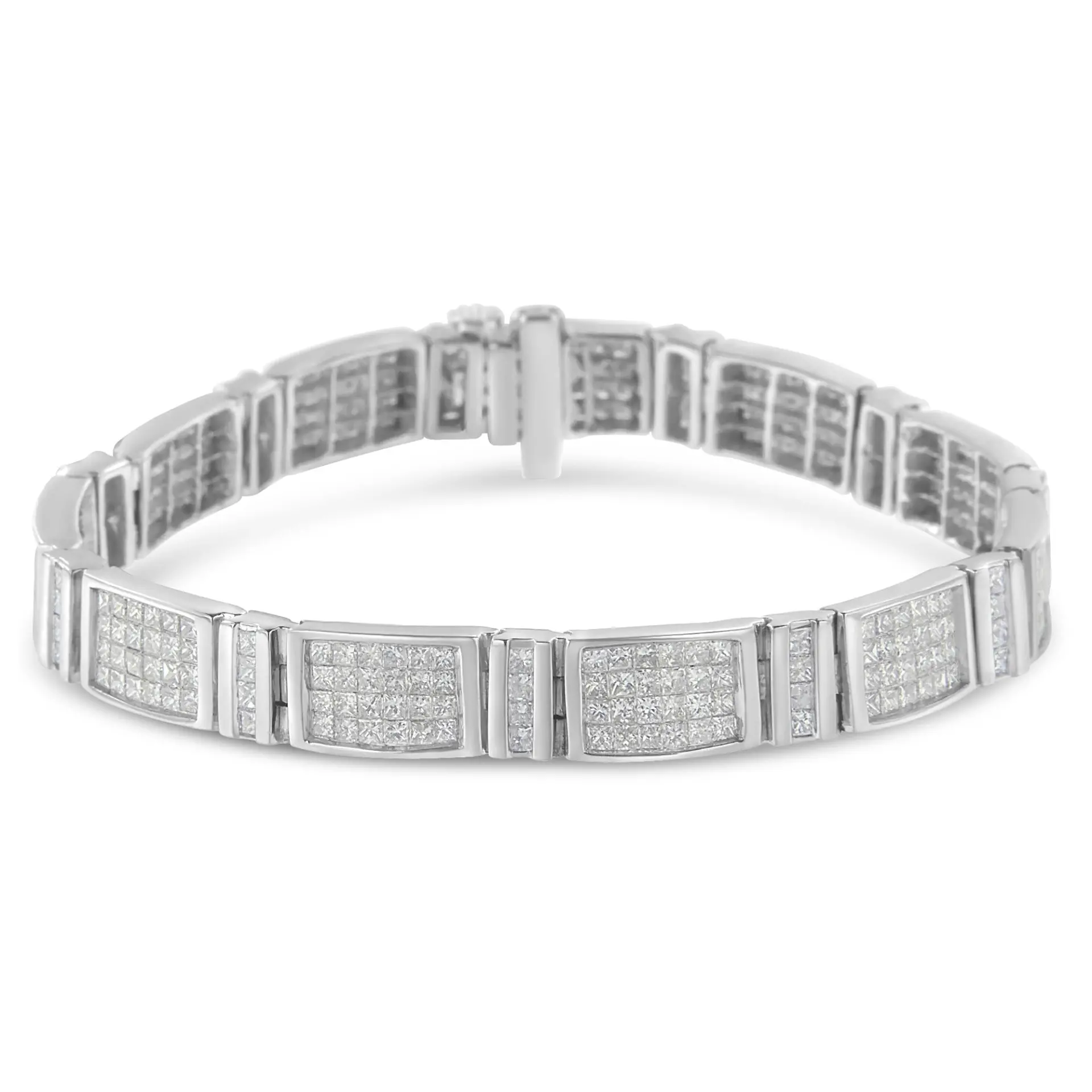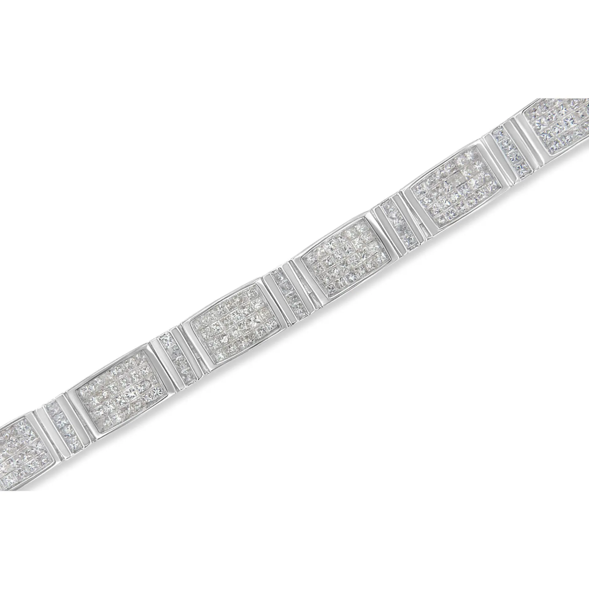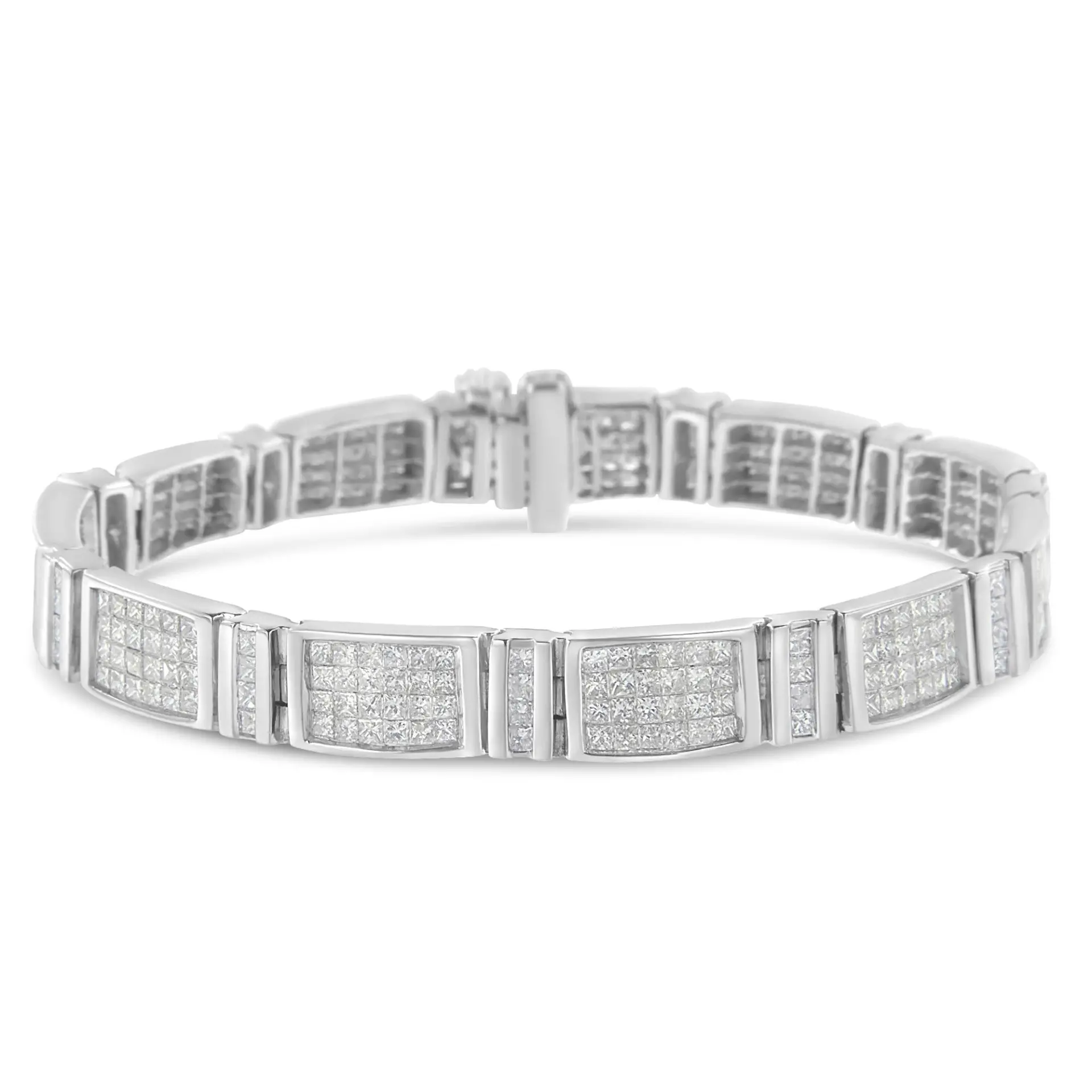 A must have for any serious jewelry collection, this stunning 14K white gold tennis bracelet boasts an impressive 7.0 carat total weight of diamonds with a whopping 308 individual stones. The bracelet features alternating vertical and horizontal rectangular links. The horizontal links feature grids of invisible set princess cut diamonds, while the vertical links feature single rows of channel set princess cut diamonds. Each diamond studded link is connected by hinges. Elegant and timeless, this gorgeous 7 tennis bracelet fastens securely with a box with tongue and safety clasp. This classic, bold bracelet makes a great gift for any special occasion! Whether worn for daytime glamour or evening sparkle, this bracelet is gorgeously versatile. Give her a gift that will perfectly complement her favorite ensemble.