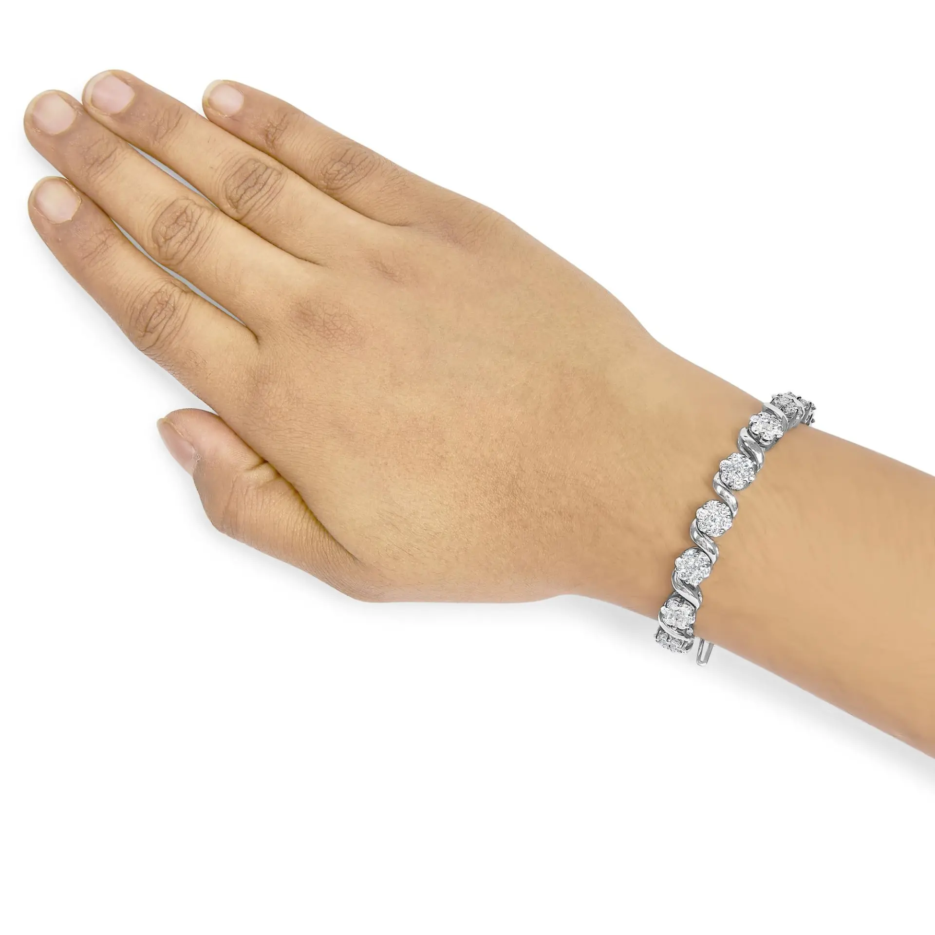 Elegant and timeless, this gorgeous 14 karat white gold tennis bracelet features 7.38 carat total weight of natural round white diamonds. The tennis bracelet has hinged links consisting alternating S shaped swooshes and flower shaped clusters of diamonds made up of 7 round gems in shared prong settings. The 7 long bracelet culminates in a secure box with tongue and safety clasp. Whether worn for daytime glamour or evening sparkle, this classic tennis bracelet is gorgeously versatile. Its a timeless treasure shell enjoy wearing every day. This classic link bracelet makes a great gift for any special occasion, as well as a great gift for those with April birthdays! Diamonds are thought to give the wearer clarity and illuminate solutions to lifes problems, as well as encouraging abundance, strength, courage, harmony, faithfulness, and commitment. Give her a gift that will perfectly complement her favorite ensemble.