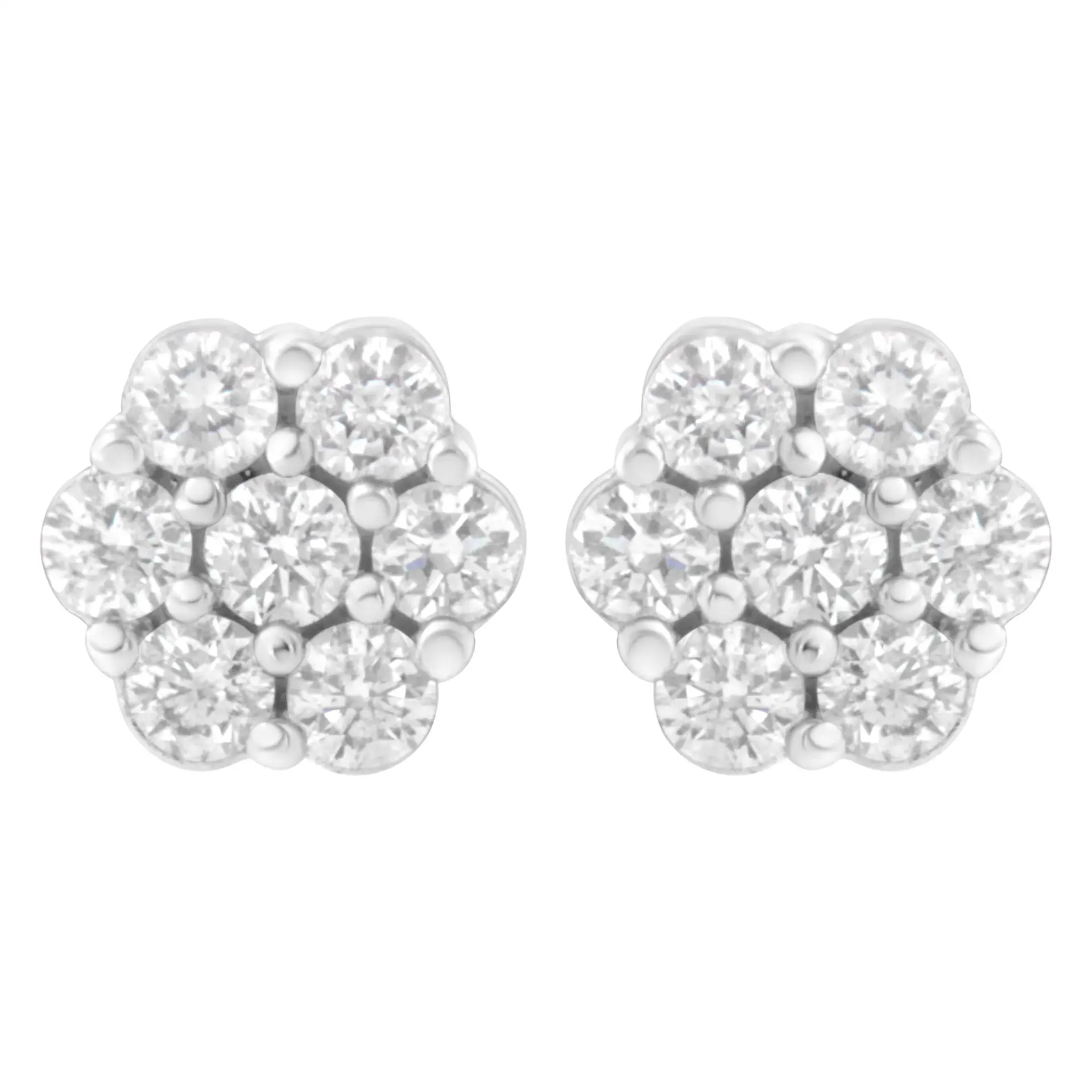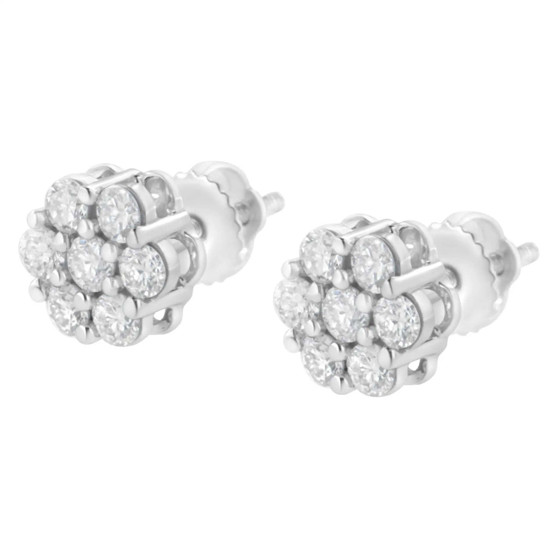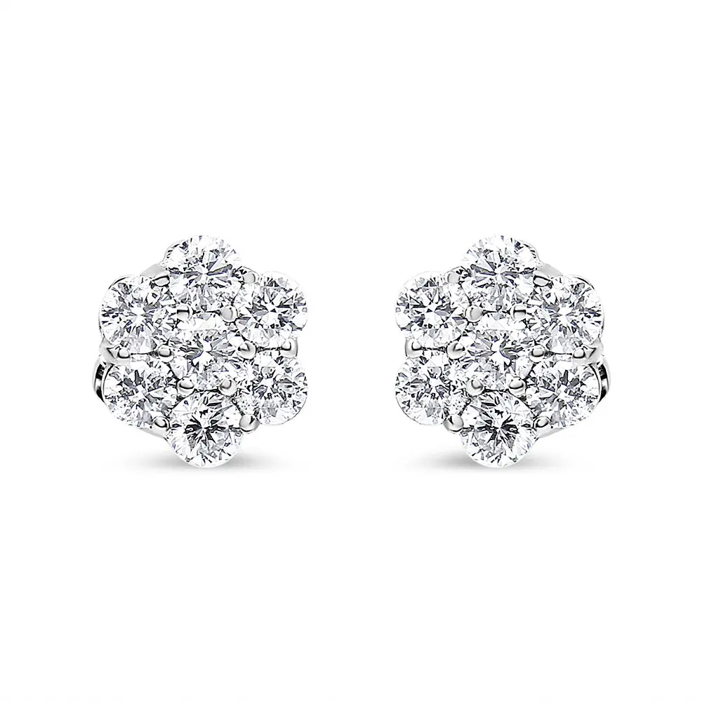 Classic and elegant, these diamond stud earrings are a must-have look any woman will adore. Created in 14K white gold, each earring features a glistening flower-shaped composite of shimmering round diamonds that catches the eye. A traditional look that complements any attire, the earrings captivate with 1 ct. t.w. of diamonds and a polished shine. Each stud features 7 natural, sparkling diamonds for a total of 14 beautiful diamonds. The post earrings secure comfortable with screw backs.