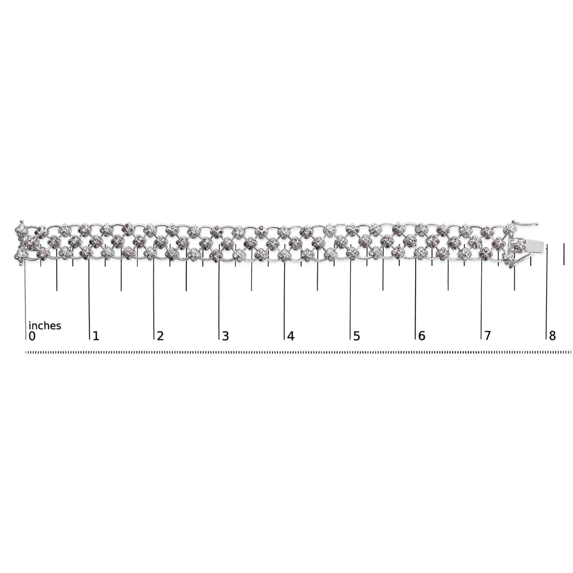 Envelop your wrist in the exquisite embrace of this 14K white gold bracelet, plated with rhodium to ensure an enduring gleam and augmented durability. Intricately designed with a floral lattice motif, this 7.25-inch piece celebrates classic craftsmanship and contemporary charm. It is embellished with natural round diamonds summing up to 1 1/4 carats, each bezel-set to catch the light from every angle. Interspersed among the luminescent diamonds are lab-created pink sapphires, each measuring 1.5 mm, adding a touch of romantic blush. Secured with a robust box clasp and a safety latch, this bracelet promises to accompany your every gesture with a sparkle that mirrors your own inner light. Perfect for those who cherish the blend of luxury and security in their adornments.
