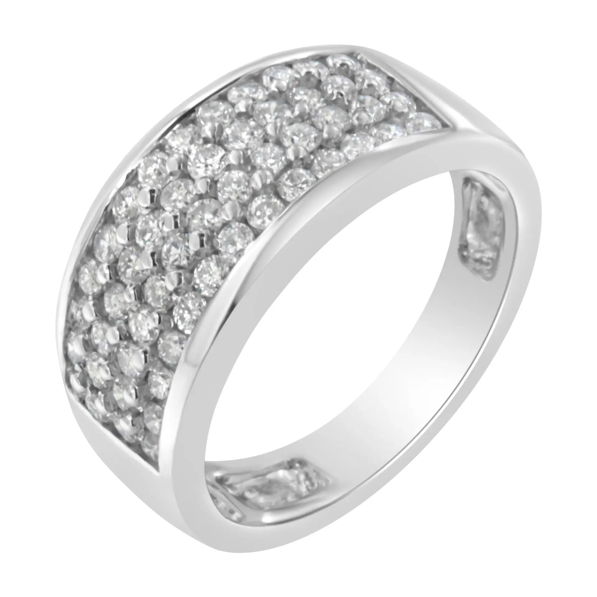 A diamond band that features four rows of round brilliant cut diamonds. This wide ring is crafted in 14 karat white gold and sparkles with a total diamond weight of 1 carat.