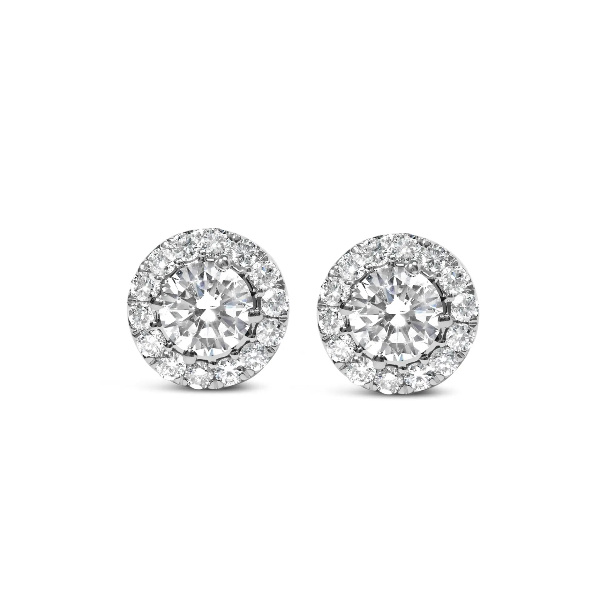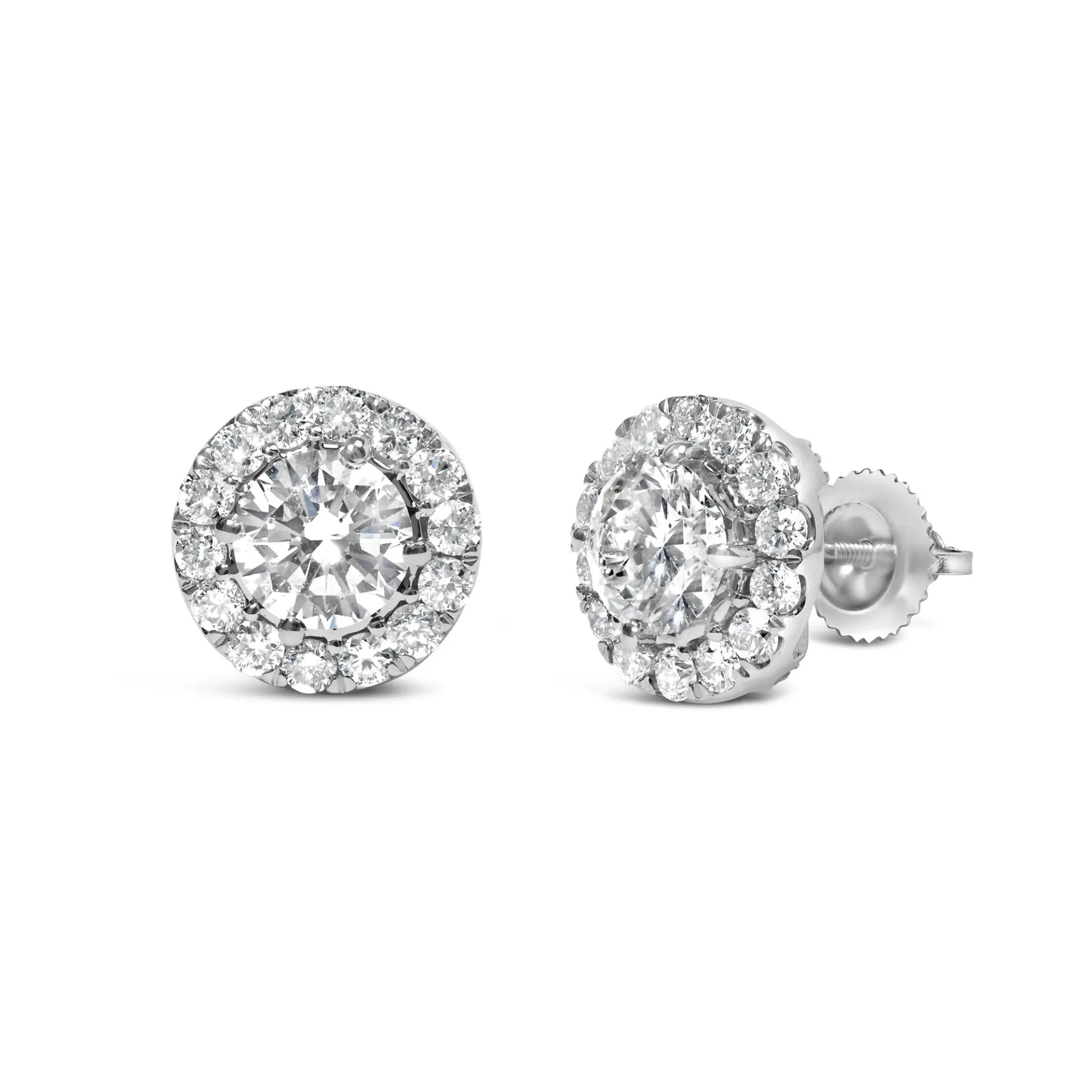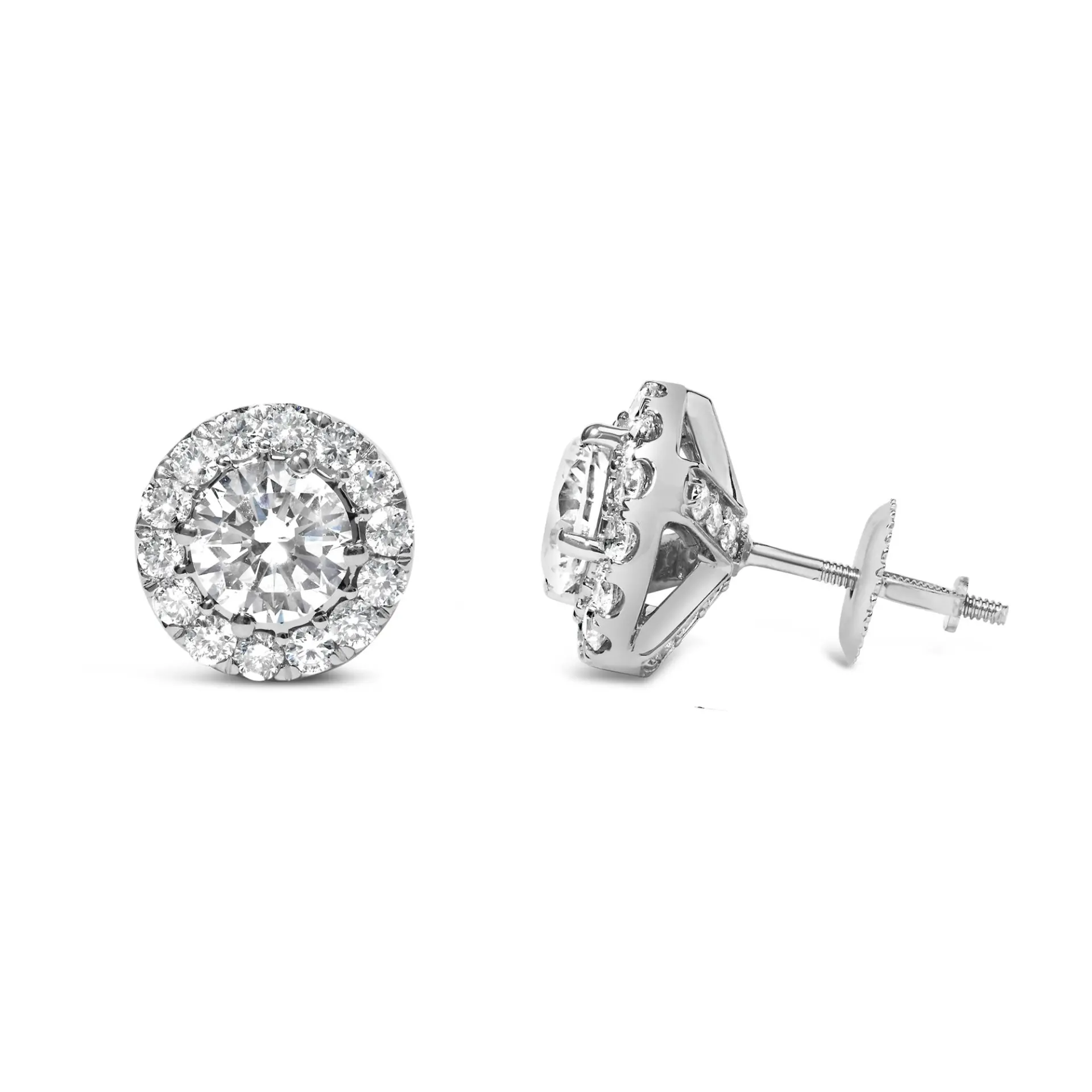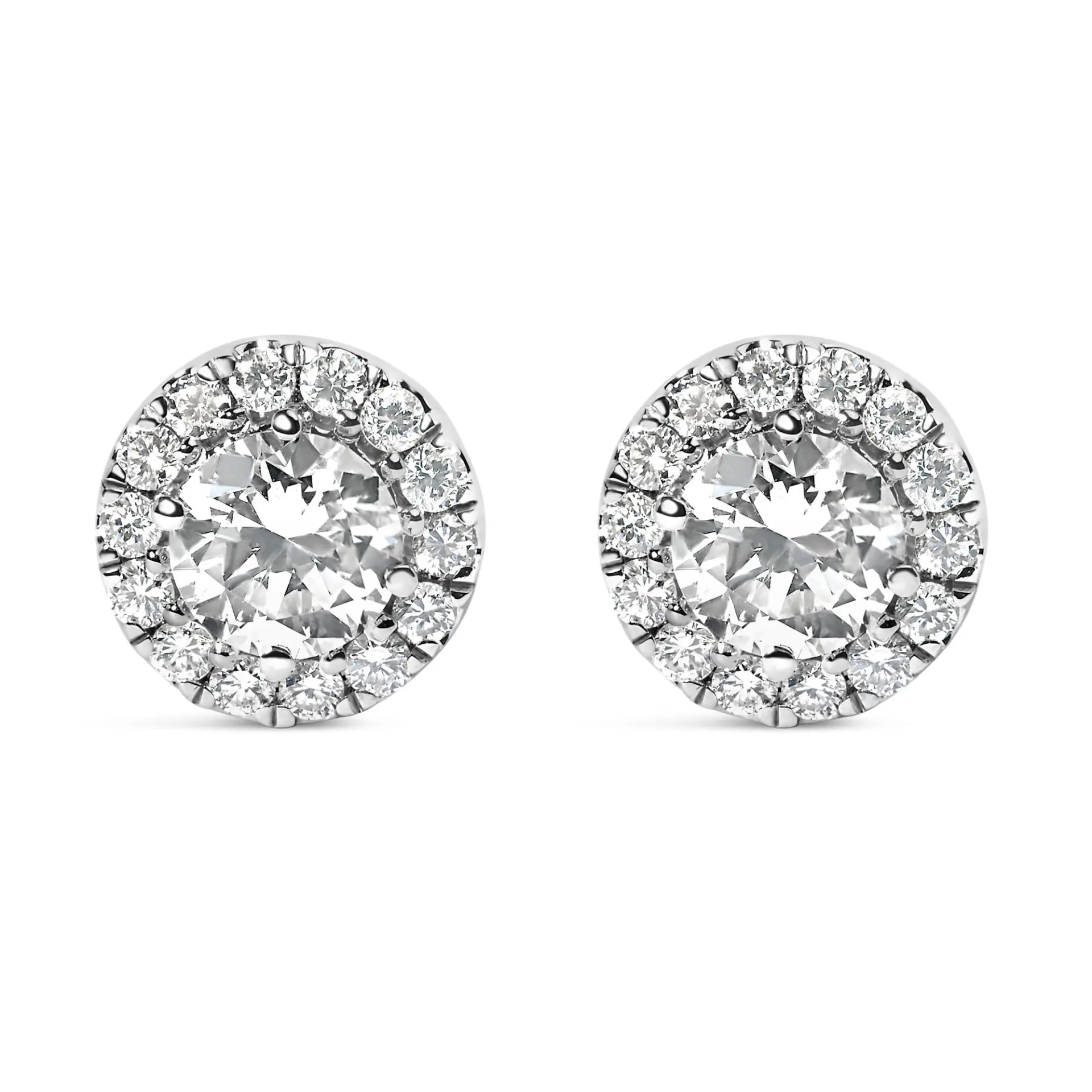Unveil timeless elegance with these exquisite 14K white gold stud earrings, each adorned with a mesmerizing 1.0 carat lab-grown diamond halo that dances with light. Crafted with precision, the central F-G color, VS2-Si1 clarity diamonds glisten intensely, encircled by a constellation of scintillating smaller diamonds, ensuring a radiant glow from every angle. The secure prong settings and screw-back closures promise both comfort and safety, making these jewels not only a statement of luxurious style but also a testament to thoughtful craftsmanship. Ideal for celebrating life’s most treasured moments, these earrings encapsulate the harmony between modern ethical sourcing and classic aesthetic appeal, offering an enduring sparkle meant to be cherished forever. Earrings have 1/3 cttw center stones.