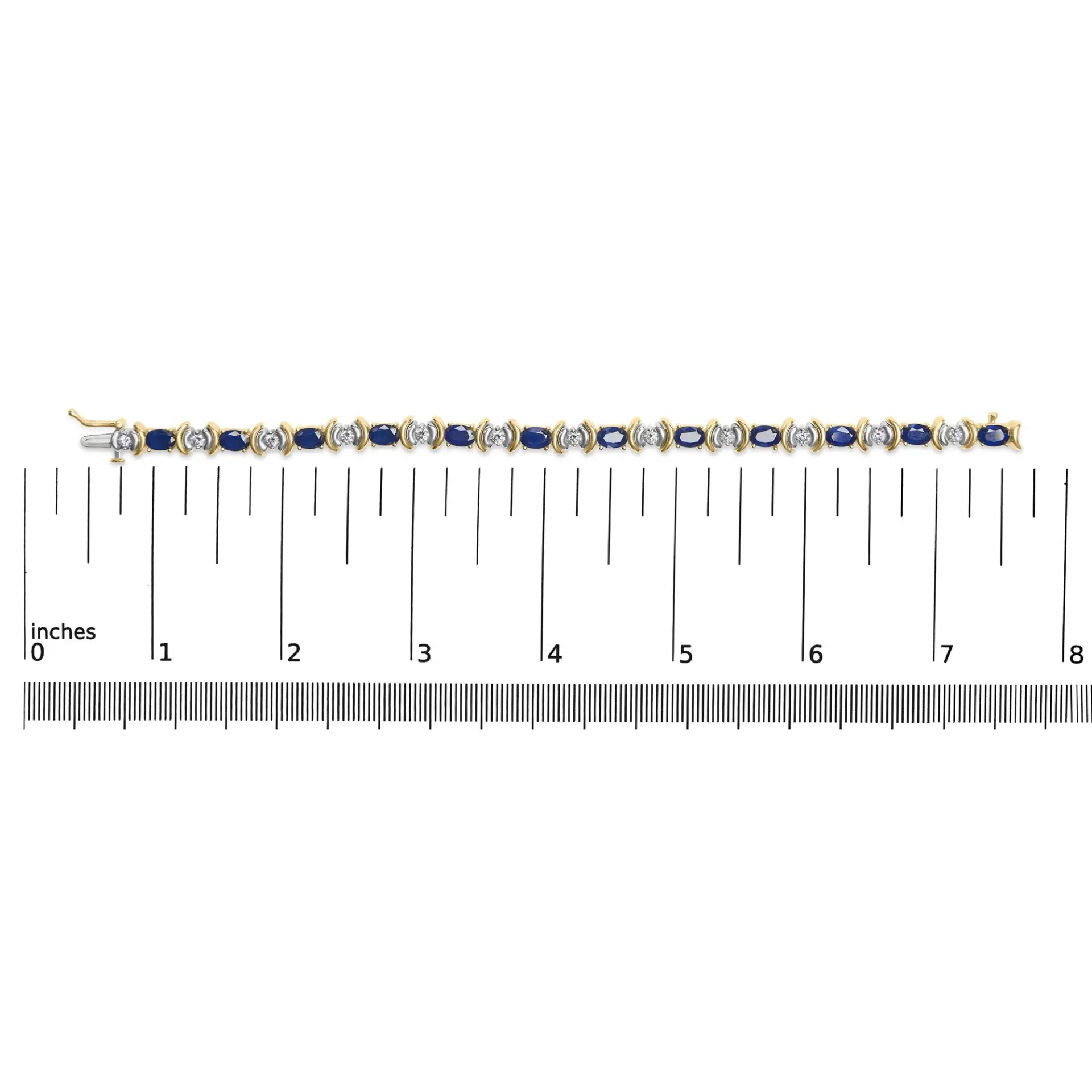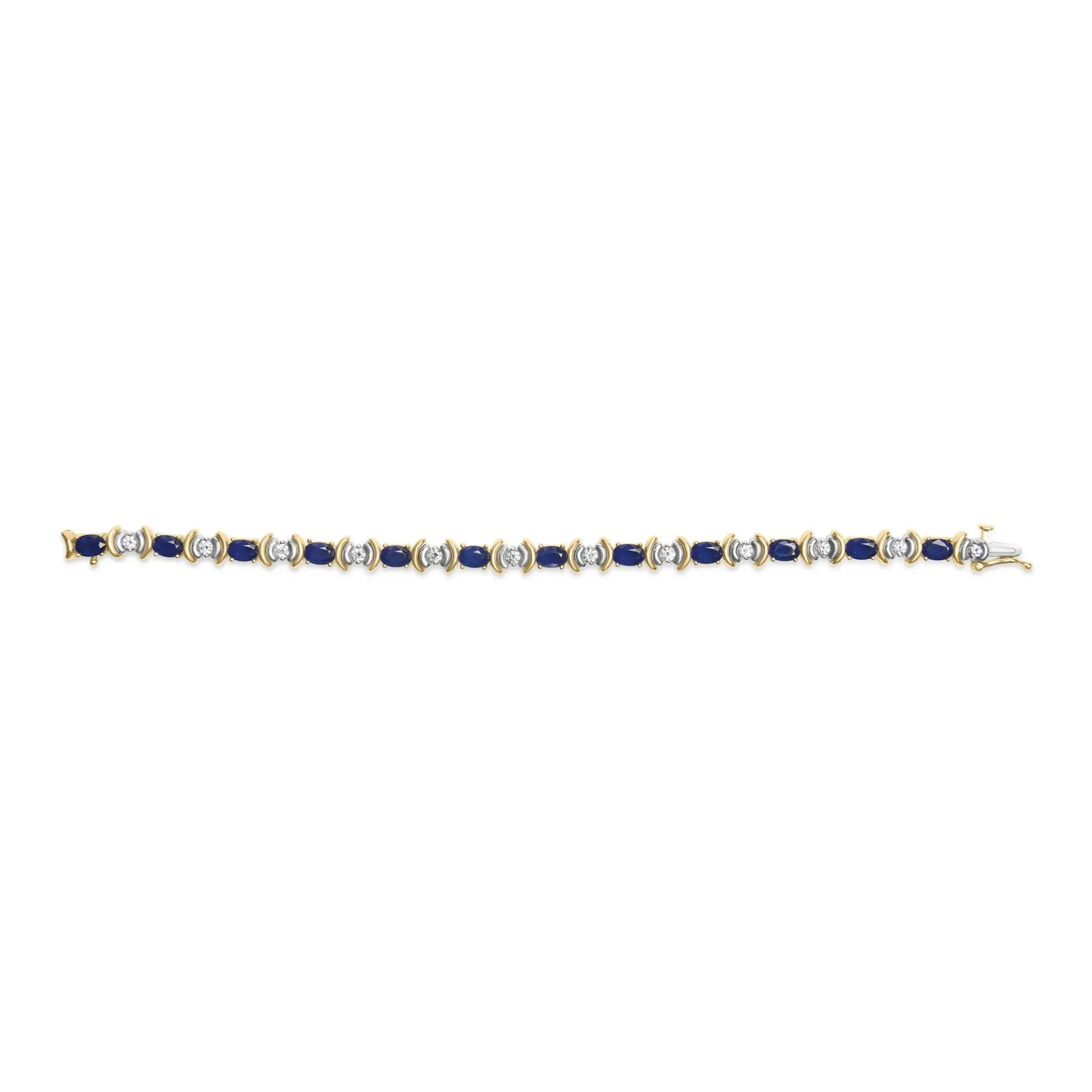 Unveil the epitome of elegance with this resplendent 14K yellow gold bracelet, a harmonious dance of alternating oval blue sapphires and scintillating round diamonds. Each meticulously chosen natural diamond, boasting H-I color and SI1-SI2 clarity, is cradled within links reminiscent of prong settings, ensuring both security and an aesthetic seamlessness. The sapphires, heat-treated to amplify their ethereal depth, collectively showcase a total weight of 6 1/2 carats, interspersed with 1.00 carat of diamonds that exude an everlasting brilliance. Crafted to nestle perfectly around wrists up to 7 inches, this piece is not just jewelry but a personal emblem of grace and sophistication. Secured with a box clasp and an additional latch, it promises both allure and peace of mind.