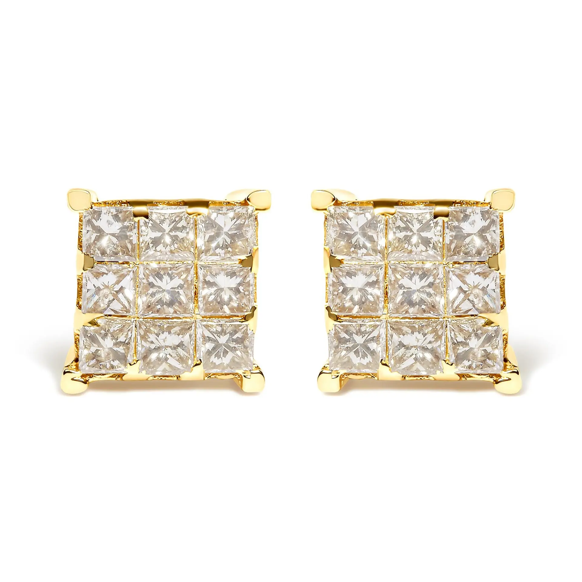 14K Yellow Gold 1 1/2 Cttw Invisible Set Princess-Cut Diamond 9 Stone Square Stud Earrings (J-K Color, SI2-I1 Clarity)