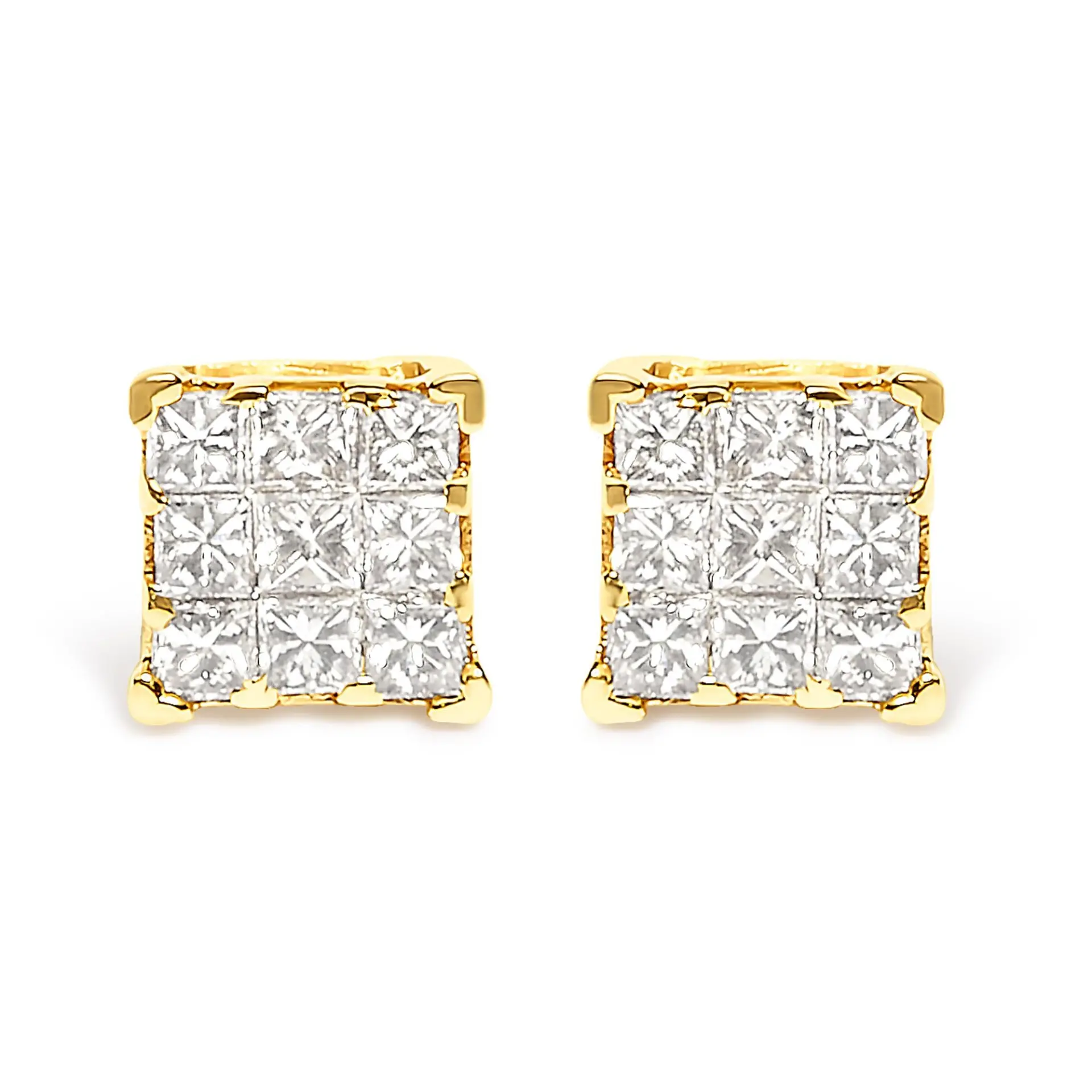 Discover the understated elegance of these exquisite stud earrings, crafted from radiant 14K yellow gold and highlighted by the brilliance of natural princess-cut diamonds. Each earring showcases a cluster of nine diamonds, totaling half a carat, set invisibly to present the illustrious appearance of a single, expansive stone. With a subtle J-K color and SI2-I1 clarity, these gems catch and reflect light with every turn, casting a glow of sophistication and class. The secure push-back closures provide peace of mind, ensuring these treasures sit snugly against your ears. Perfect for every occasion, these earrings are a testament to the allure of fine craftsmanship, blending timeless charm with contemporary elegance to adorn your ensemble with a touch of luxury.