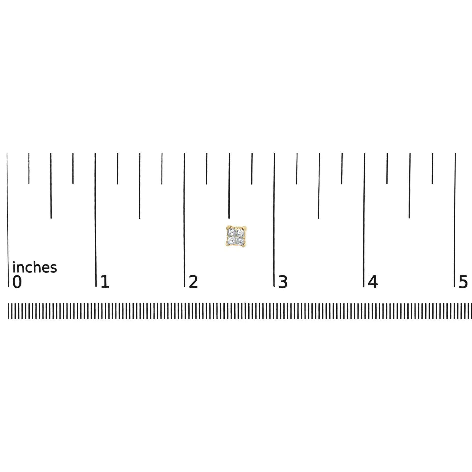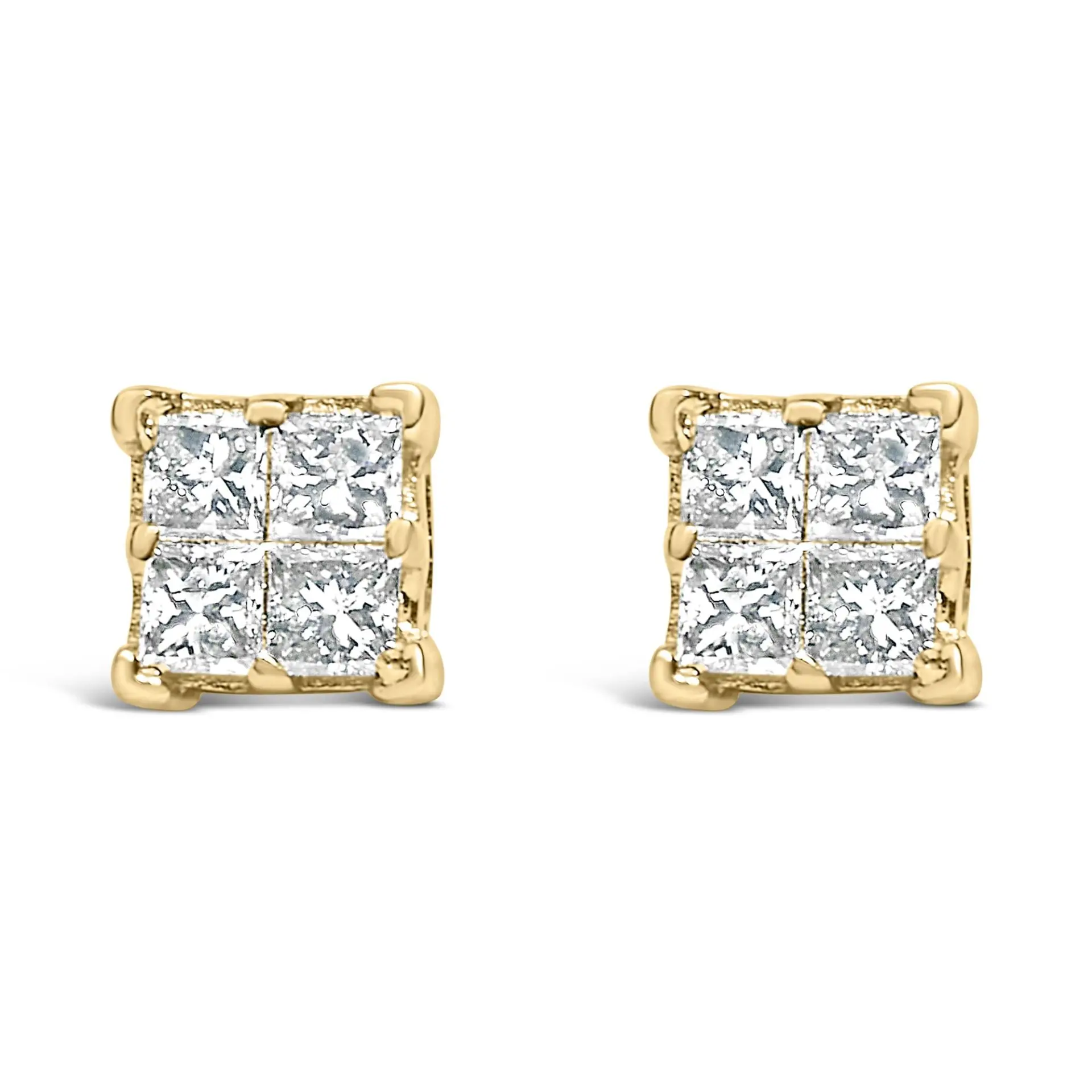 Evoke timeless elegance and a whisper of luxury with these exquisite 14K yellow gold stud earrings, each artfully constructed to spotlight a dazzling ensemble of princess-cut, naturally sourced diamonds. Intricately placed in an invisible setting, these gems blend seamlessly to mimic a sole, grand solitaire, casting an enchanting array of light with every turn. Their subtle K-L color and SI1-SI2 clarity shimmer with an understated yet captivating brilliance, perfectly complemented by the rich warmth of the yellow gold. Designed for both stability and style, the secure push-back mechanism ensures they adorn your lobes comfortably. This refined pair not only accentuates beauty but also speaks to the connoisseurs appreciation for sophisticated craftsmanship.