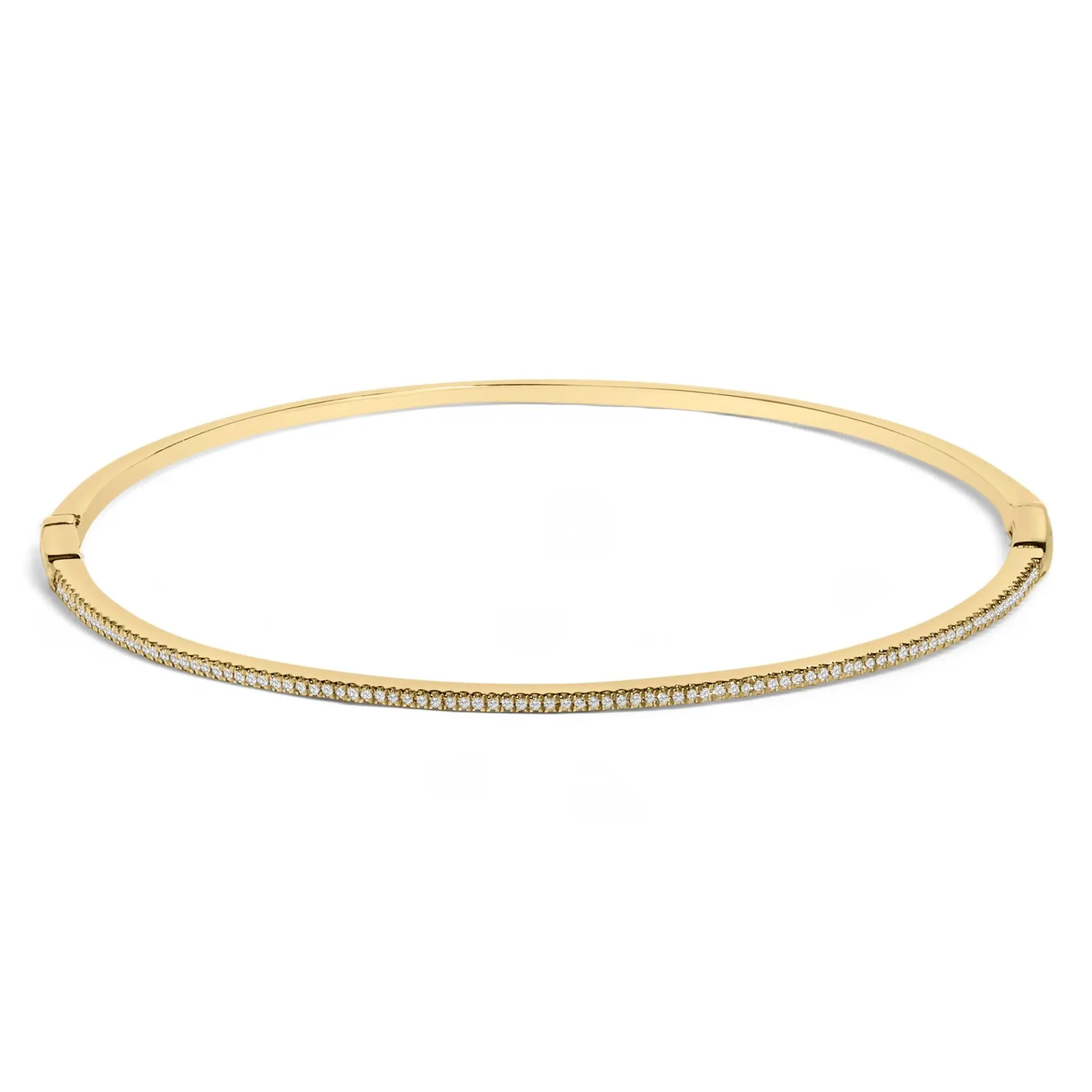 Immerse yourself in the delicate luxury of this 14K yellow gold bangle bracelet, where traditional elegance meets refined modernity. Each 1/3 carat of natural diamonds arrayed along the upper half sparkles with an understated brilliance, their I-J color and I2-I3 clarity reflecting subtle gleams of light. Crafted to embrace wrists up to 7.75 inches, this bracelet secures with a sturdy box clasp complemented by a safety latch, ensuring both comfort and peace of mind. The timeless design, combined with meticulous craftsmanship, makes this piece a perfect blend of style and durability, promising to accompany your most cherished moments with everlasting grace.