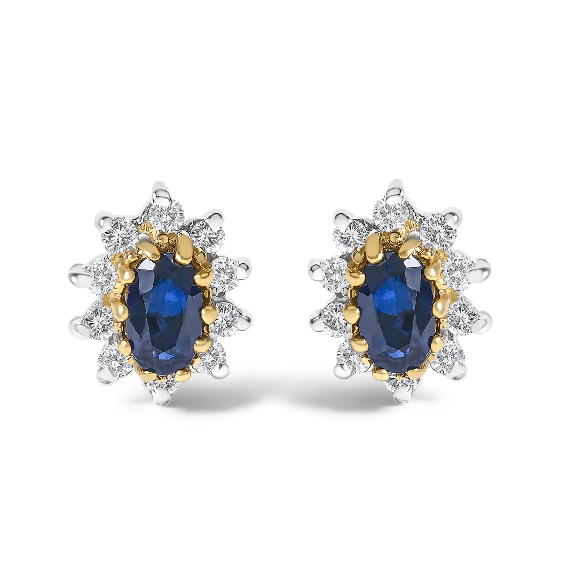 Epitomize elegance and a hint of celestial charm with these exquisite stud earrings, crafted from lustrous 14K yellow gold. At the heart of each piece lies a captivating, oval-cut blue sapphire, measuring 5×3 mm, naturally sourced and enhanced through heat treatment to reveal deep, enchanting hues. Encircling each sapphire, a sunburst halo of natural, round-cut diamonds adds an irresistible sparkle, reminiscent of the morning light scattering across the heavens. The shimmering white metal compliments are thoughtfully rhodium-plated, augmenting the brilliance and making these gems truly stand out. Securely fastened with push back closures, these earrings promise both comfort and unparalleled style, making them a luxurious addition to any outfit, a treasure that speaks of timeless elegance and sophistication.