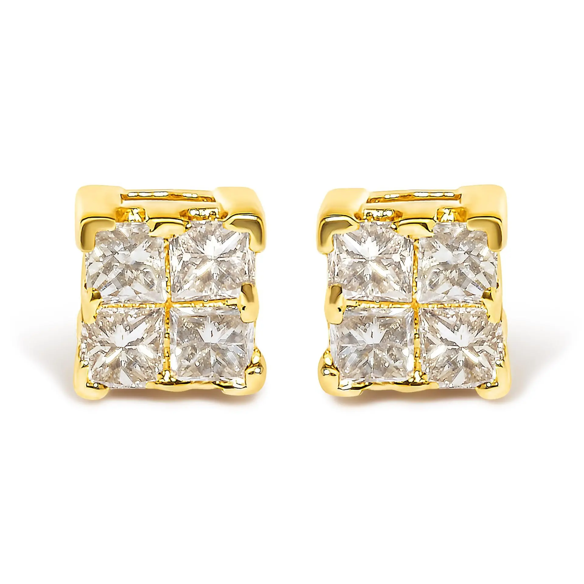 Immerse yourself in the elegance of these meticulously crafted stud earrings, each featuring a quartet of princess-cut natural diamonds invisibly set within lustrous 14K yellow gold. This ingenious setting technique enhances the illusion of a singular, more voluminous solitaire diamond, exuding a radiant sparkle with a color grade of J-K and I1-I2 clarity. The total diamond weight sums up to a luxurious 1/4 carat, combining both splendor and sophistication. Designed for both comfort and security, these earrings are equipped with a reliable push-back closure, ensuring they remain your timeless companion for every occasion. Whether amplifying your daytime ensemble or illuminating your evening attire, these earrings promise to infuse a touch of glamour and an everlasting charm to your jewelry collection.