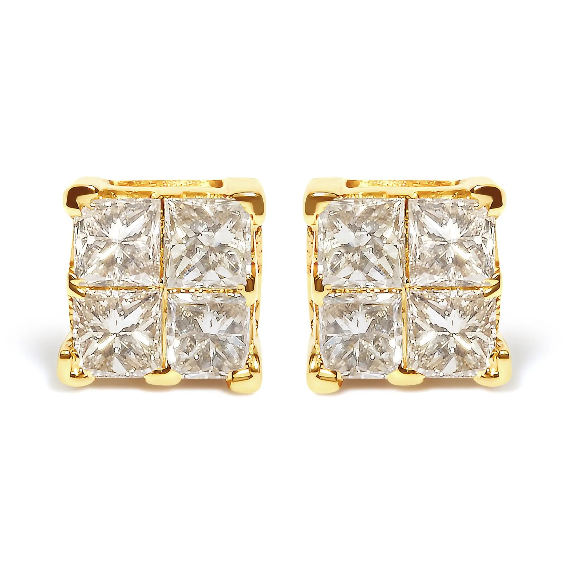 Immerse yourself in the timeless elegance of these square stud earrings, meticulously crafted from radiant 14K yellow gold. Each piece shines brightly with four natural princess-cut diamonds, ingeniously set to mimic a larger solitaire’s grandeur through an impeccable invisible setting. With a total diamond weight of 3/4 carats, the jewels sparkle with a subtle warmth characterized by J-K color and SI2-I1 clarity, reflections of natural beauty and artisanal precision. Securely fitted with push backs, these earrings promise both comfort and style, becoming an indispensable treasure in your jewelry collection. Embrace the blend of sophistication and clever design, a testament to refined tastes.