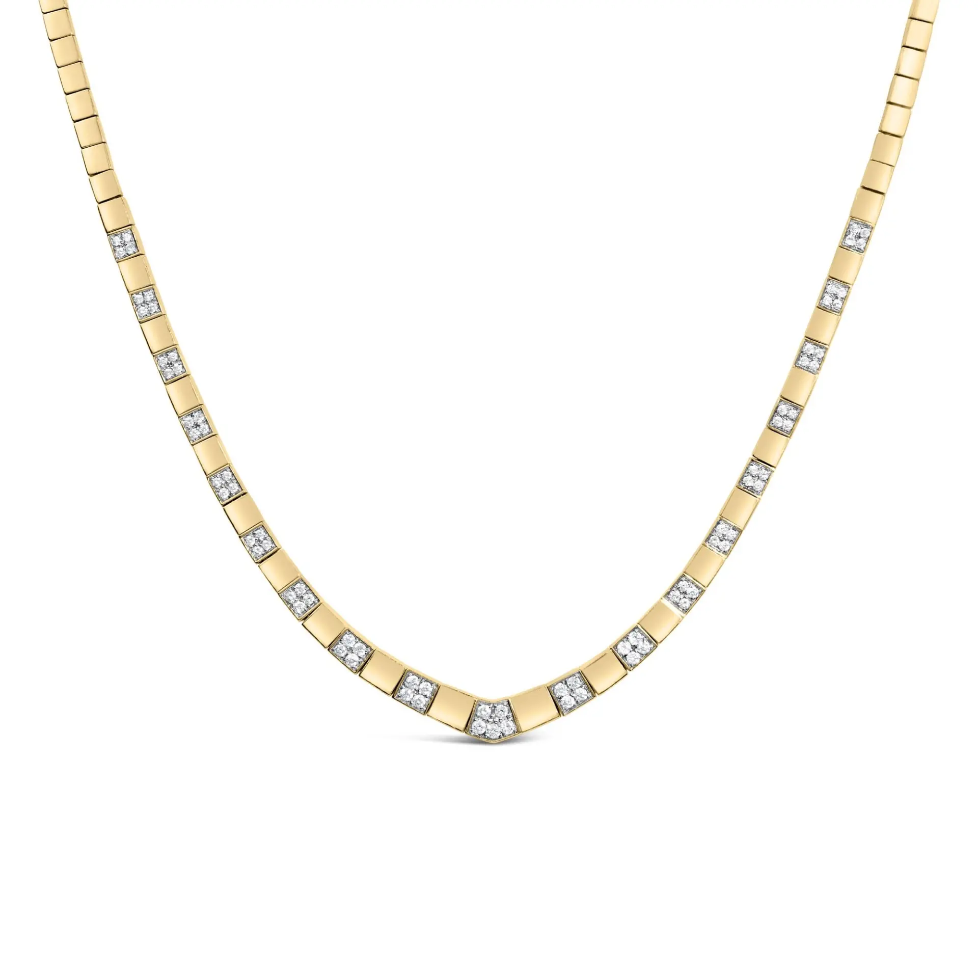 Discover the epitome of elegance with this 14K yellow gold necklace, masterfully crafted to grace your neckline with unrivaled radiance. Each 3.5 mm link gleams brilliantly, adorned with natural diamonds that boast a G-H color and VS1-VS2 clarity, reflecting light with every move you make. Designed to mimic a single, sumptuous diamond, the clusters within the bar set links meld seamlessly into the lustrous gold, creating a continuous stream of sparkle around your neck. This 16-inch masterpiece fastens securely with a sleek box clasp, ensuring it lies gracefully flat while offering a dazzling display of opulence. Perfect for those who cherish refined detail and sophisticated glamour, it promises to be a treasured addition to any ensemble.