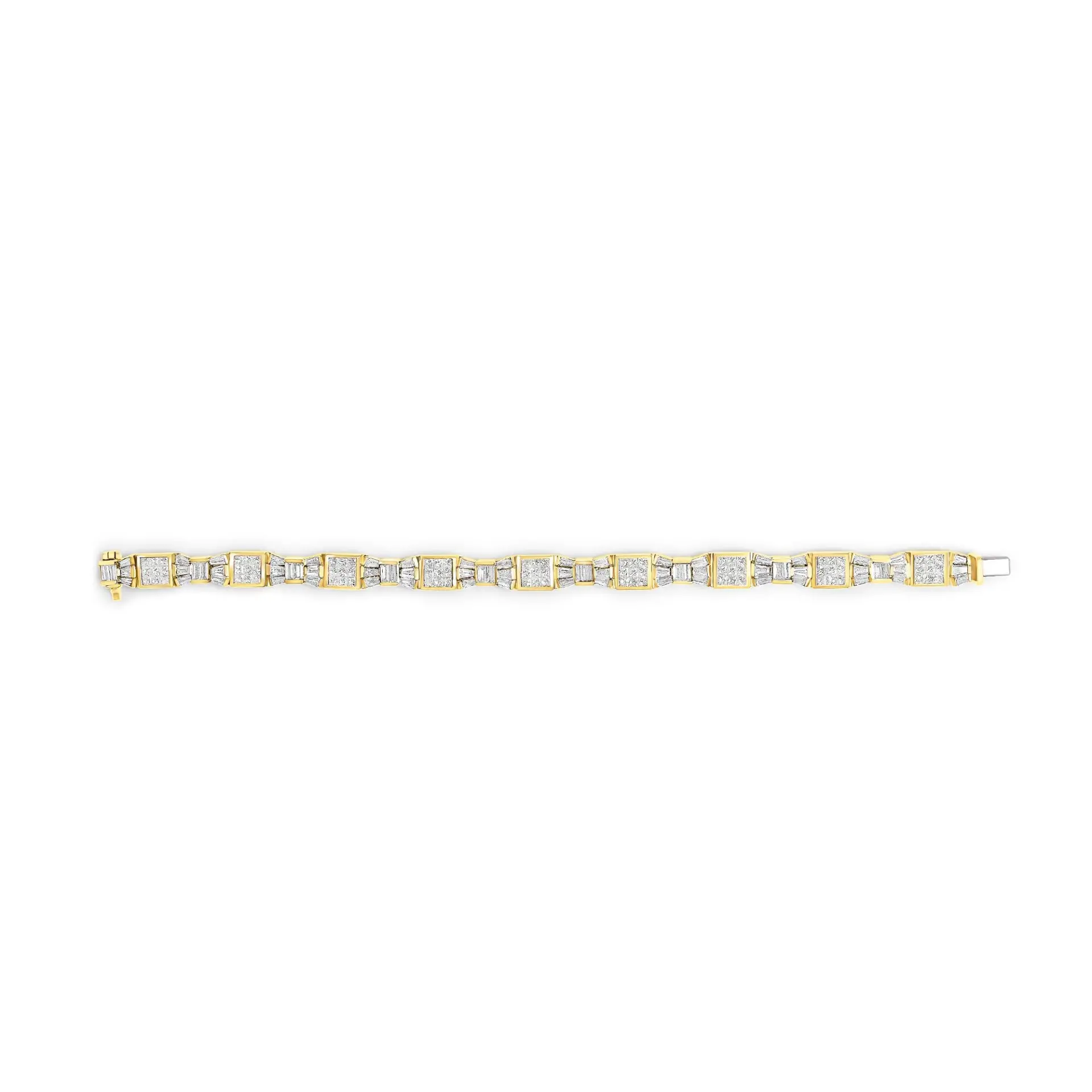 Exquisitely crafted, this 14k yellow gold bracelet captivates with 9.0 carats of natural diamonds in a harmonious blend of princess and baguette cuts, secured in invisible and channel settings respectively. The alternating bow and box link design, a symbol of infinite elegance, dances gracefully around the wrist, catering to a length of up to 7 inches. Each stone, shimmering in G-H color and VS1-VS2 clarity, is meticulously selected to create a spectacle of light and luxury. The bracelet’s clasping mechanism, featuring a secure box clasp with a safety latch, promises not only a snug and comfortable fit but also peace of mind. This masterpiece, offering a timeless appeal, is designed to enchant and is ideal for those who cherish sophisticated craftsmanship and undeniable luxury.