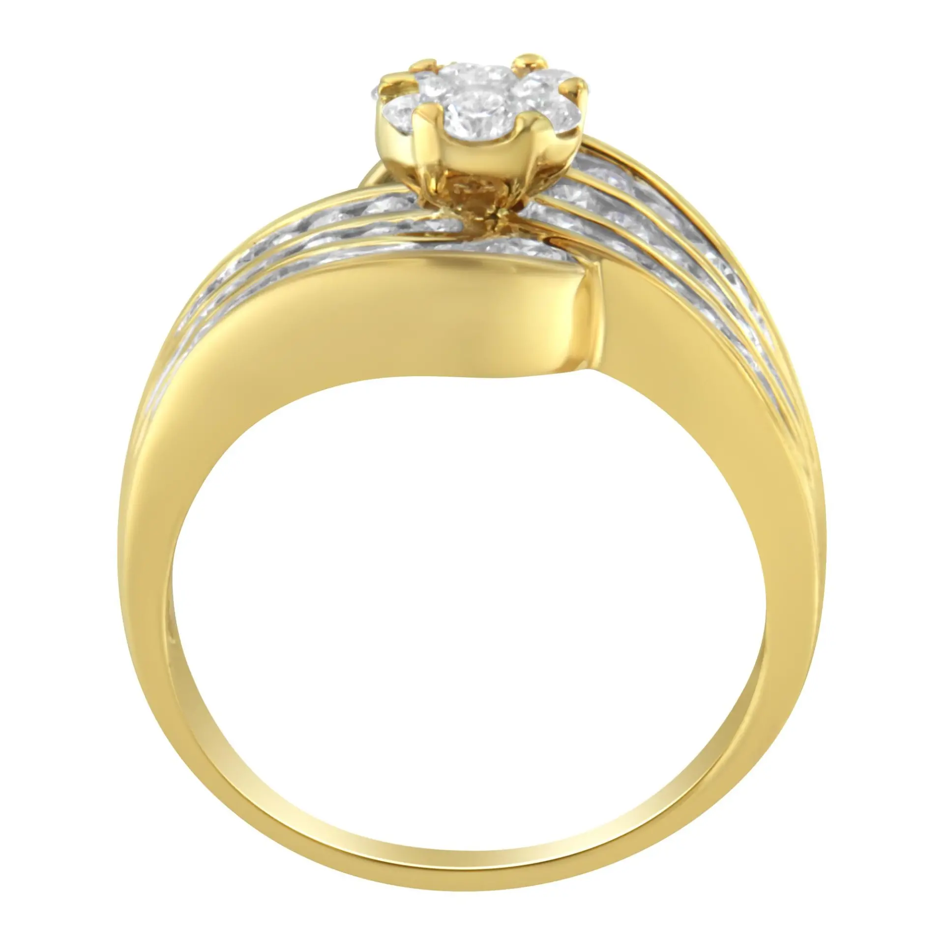 A cocktail bypass ring that features a unique S-form shaped design with a central floral cluster of diamonds surrounded by three rows of channel set round diamonds. The band is crafted in elegant 14 karat yellow gold.