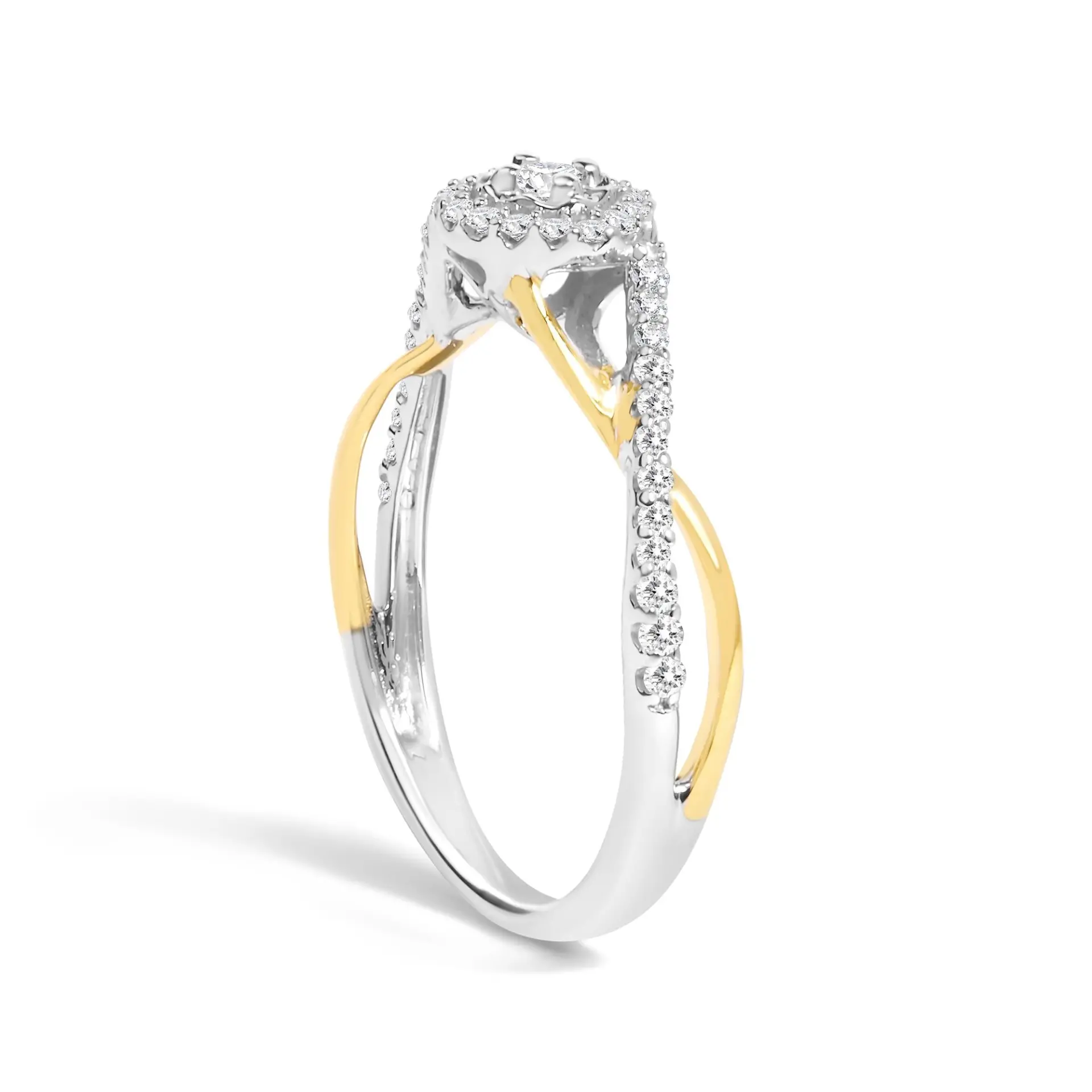 Draped in elegance and encased in modern romance, this mesmerizing promise ring features an exquisite blend of 14K yellow gold-plated .925 sterling silver, intertwined with glistening silver accents, presenting a dramatic canvas for the dance of light performed by natural diamonds. At the heart lies a bewitching round diamond, magnificently framed by a halo of twinkling stars set against a divine miracle plate, amplifying its luminous allure. Each side diamond, held gracefully by a prong setting, continues the ring’s story of eternal sparkle with I-J color and I3 clarity that radiate from every facet. This artful creation marries the warmth of yellow gold with the timeless elegance of silver, crafting a piece that promises not just undying love but also a testament to sophisticated craftsmanship in every detail.