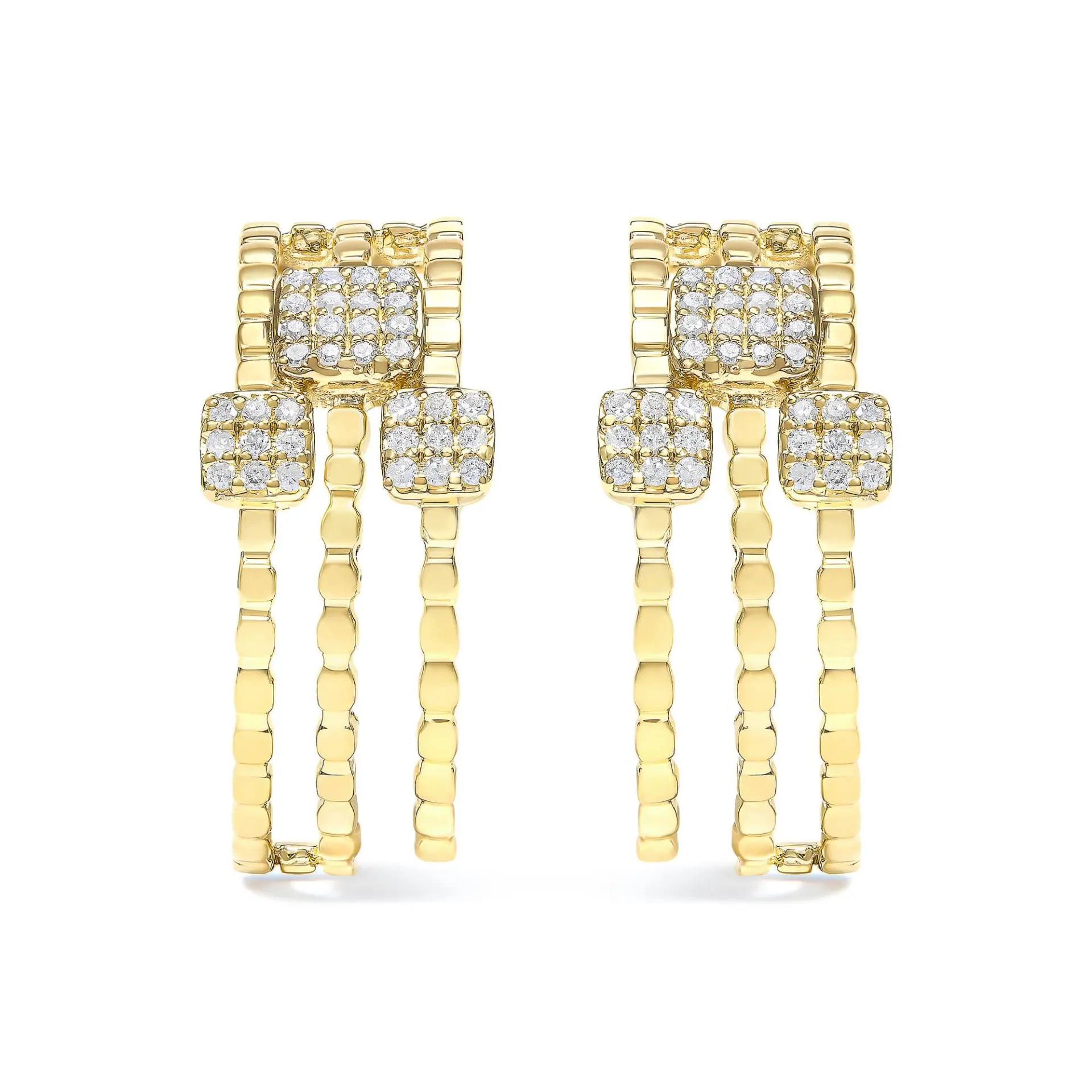 Discover the exquisite harmony of craftsmanship and style with these elegant dangle stud earrings, masterfully crafted from .925 sterling silver with a luxurious 14K yellow gold plating. These pieces capture the light and the eye with their unique multi-dimensional link design, featuring textured, interconnected links that cascade gracefully, each adorned with a glittering, diamond-encrusted square setting. The natural diamonds, totaling 1/4 carat, sparkle in H-I color and I1-I2 clarity, adding a touch of timeless glamour to any outfit. Designed for both comfort and style, the earrings are equipped with a secure push-back mechanism, ensuring they stay in place whether you’re at a bustling day event or an elegant evening gala. Elevate your jewelry collection with these captivatingsymbols of sophistication and refinement.