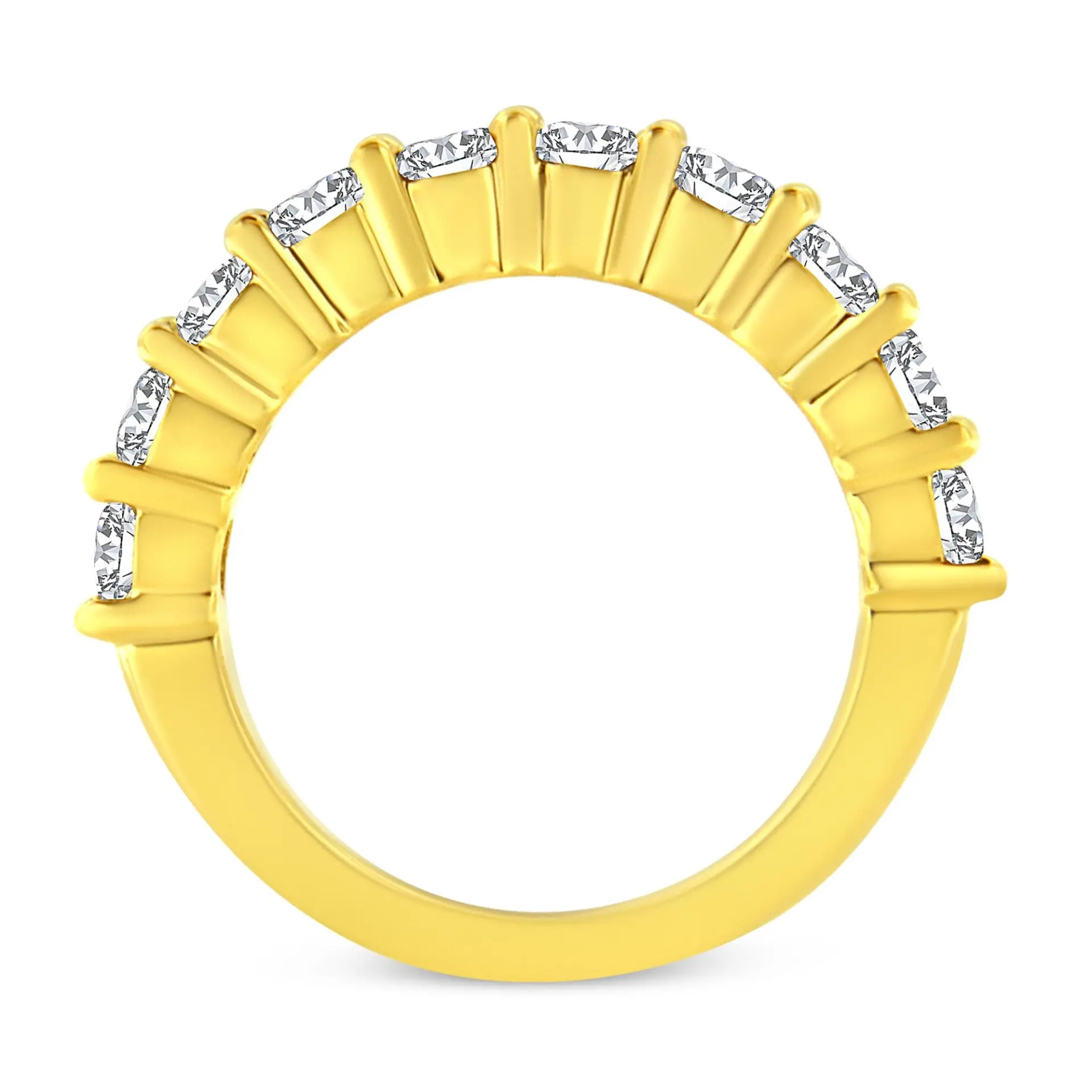 This modern twist on a classic anniversary band ring features shining 14k yellow gold plated .925 sterling silver and 10 round-cut diamonds in a shared prong setting. This piece is crafted of real 92.5% sterling silver that has been electro-coated with genuine rhodium (a platinum-family metal), a precious metal that will keep a tarnish-free shine for years to come. The diamonds have an impressive total carat weight of 2 cttw which makes this ring a timeless treasure. This piece is the perfect way to display your love front and center.