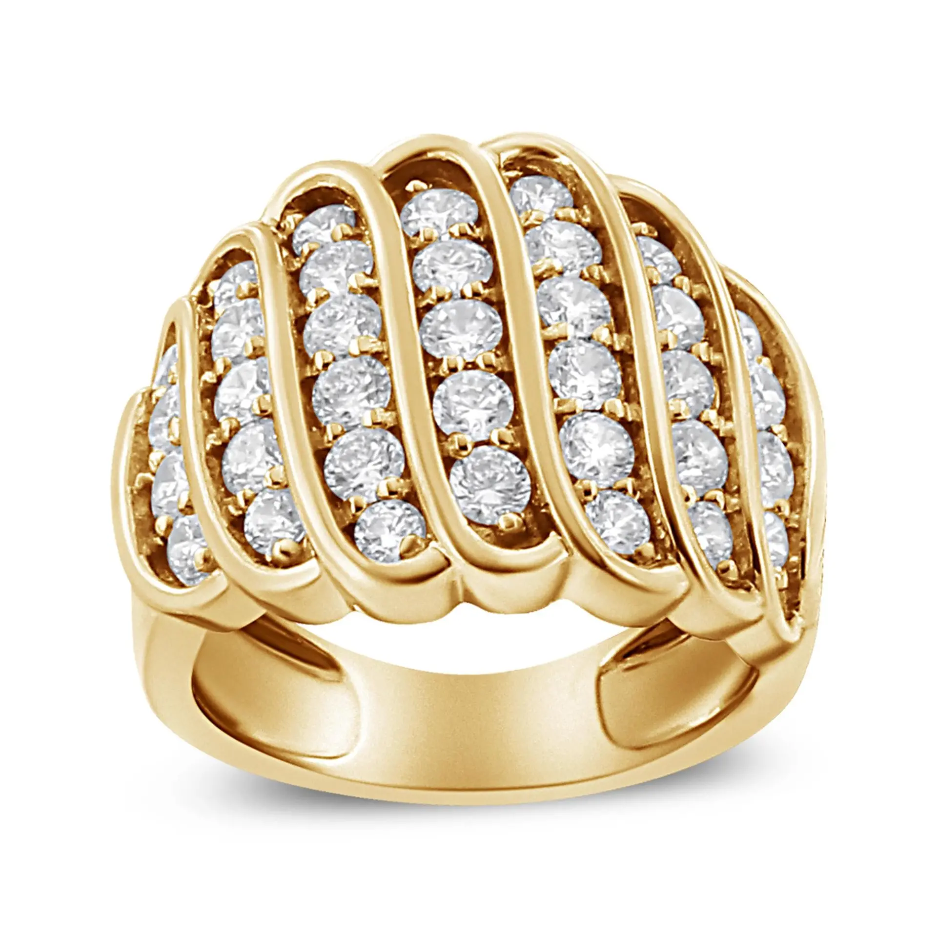 Strikingly beautiful, this stunning multi-row diamond band ring is crafted from genuine .925 sterling silver and plated with sparkling 14k yellow gold, a metal that will stay tarnish free for years to come! The ring has a vertical multi-row design that is separated by curved “S” links of yellow gold. Each row is alternately embellished with 5 or 6 round-cut diamonds in a classic prong setting. The total carat weight of this ring is an impressive 2.00 c.t., making it the perfect addition to your growing jewelry collection!